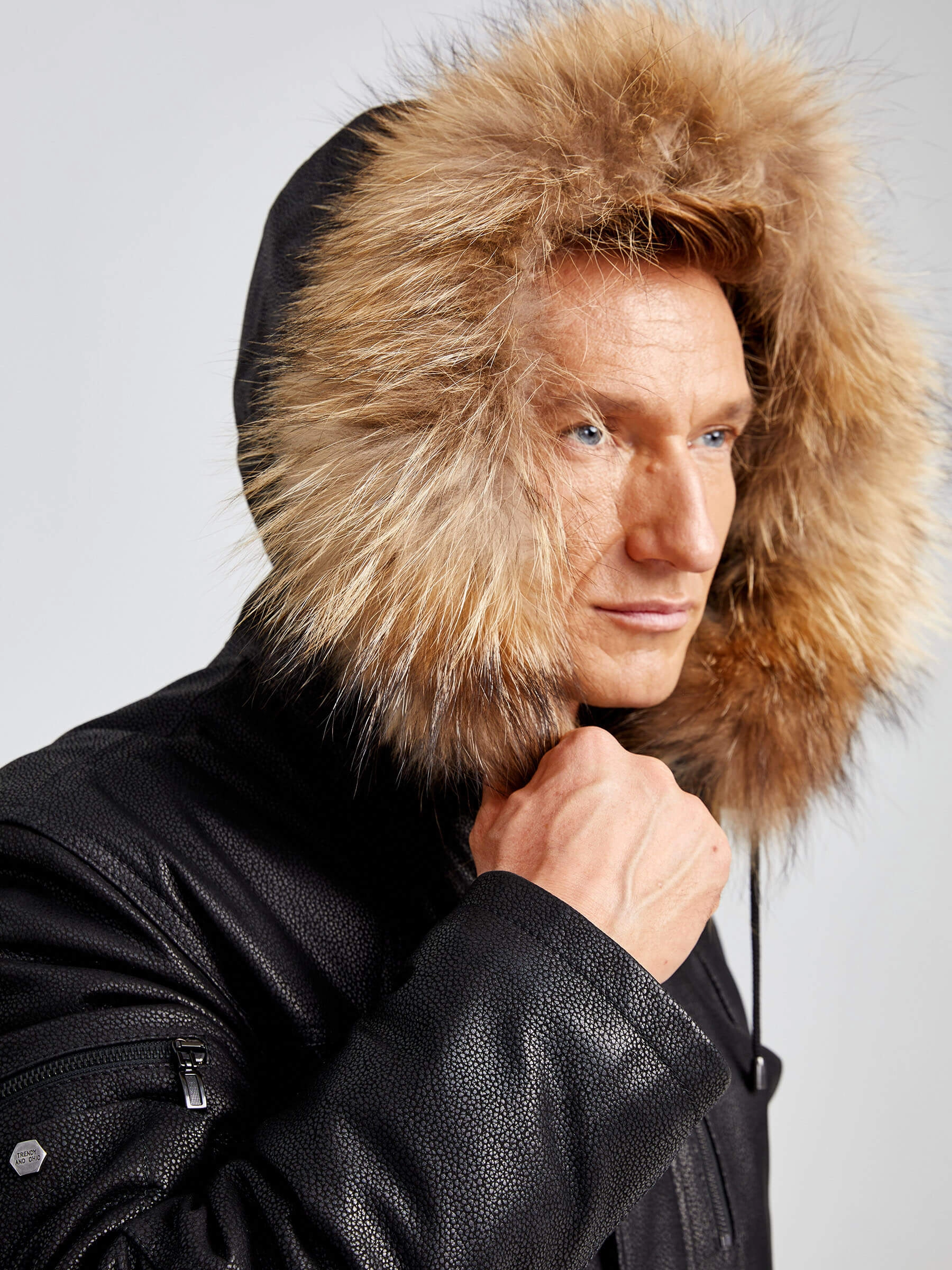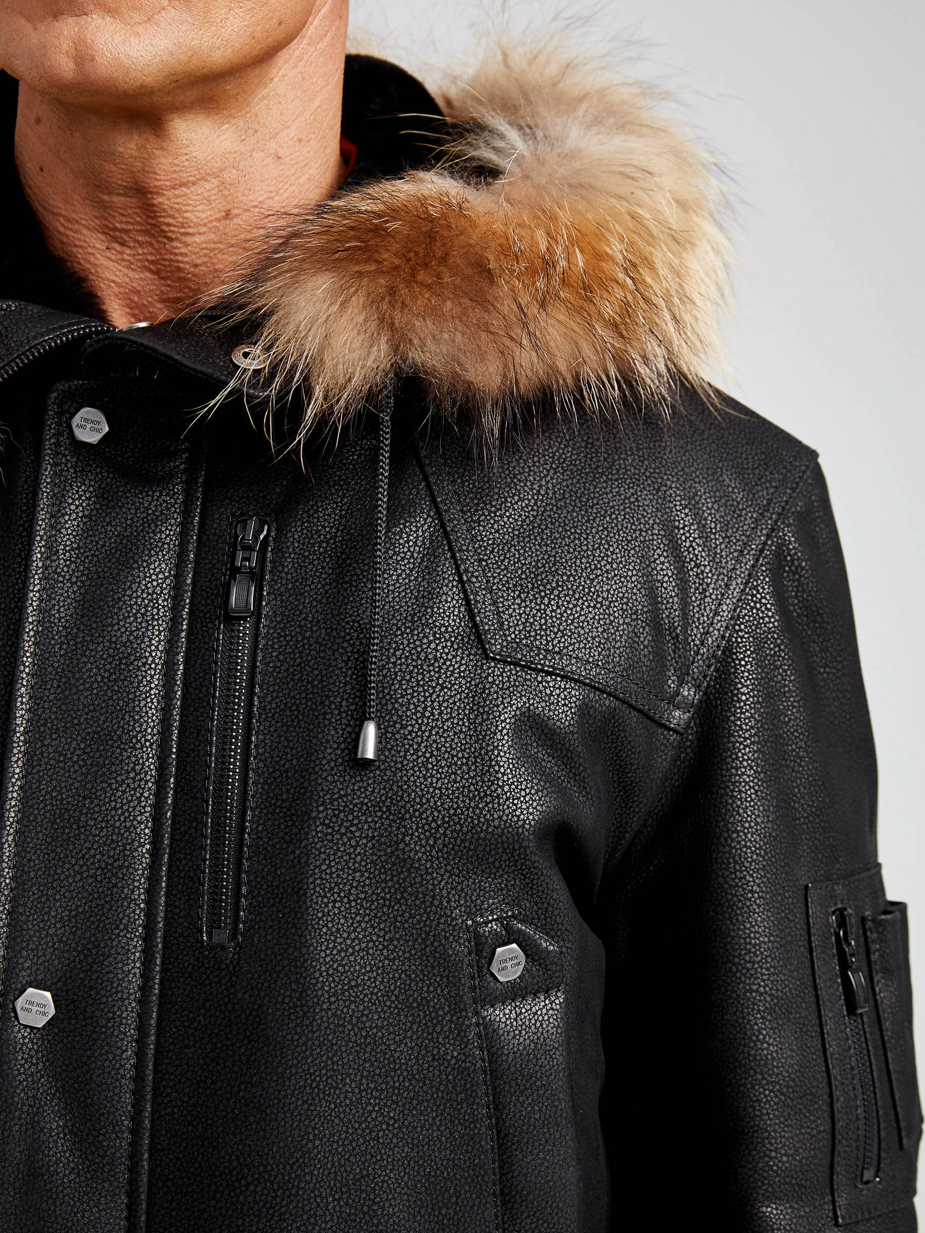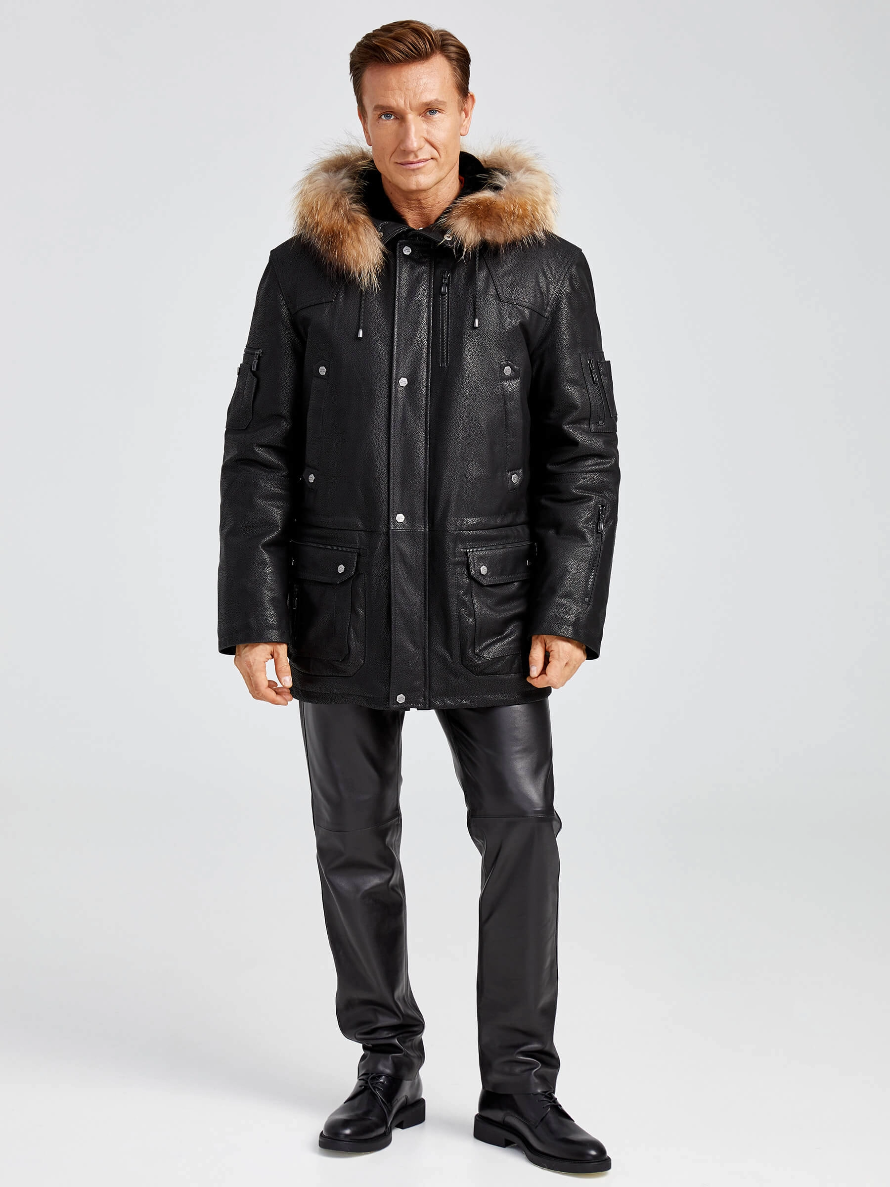 Утепленная мужская кожаная куртка аляска с мехом енота Алекс, черная DS, размер 52, артикул 40380