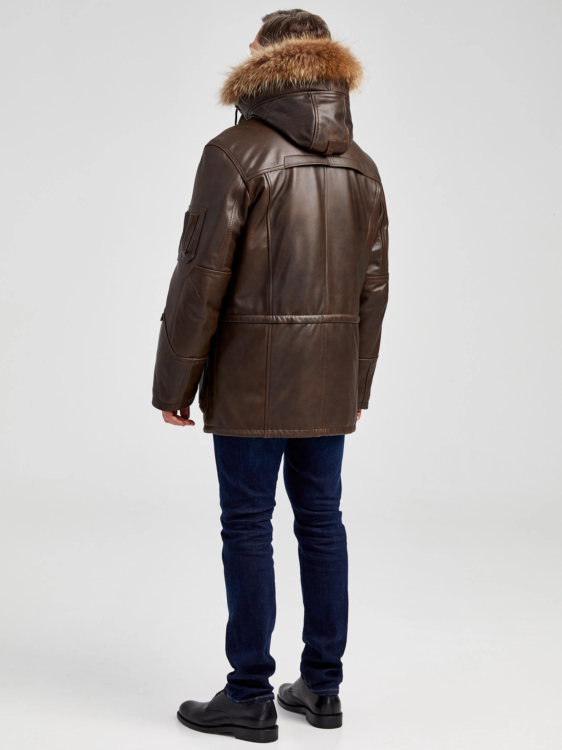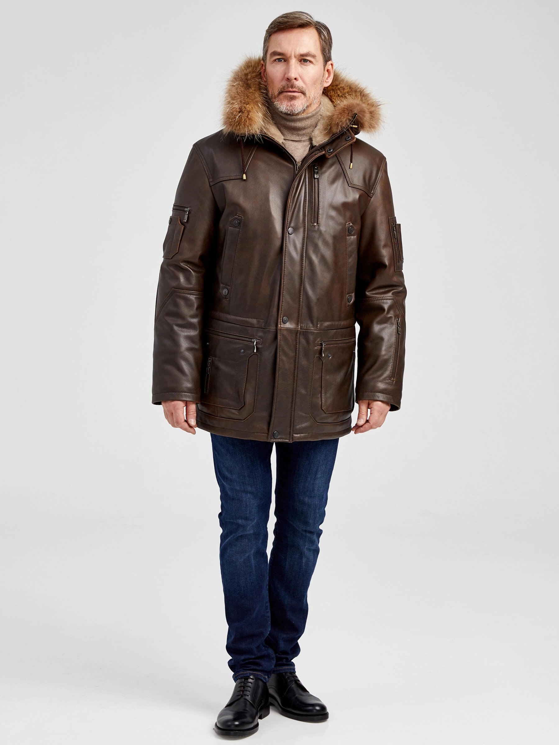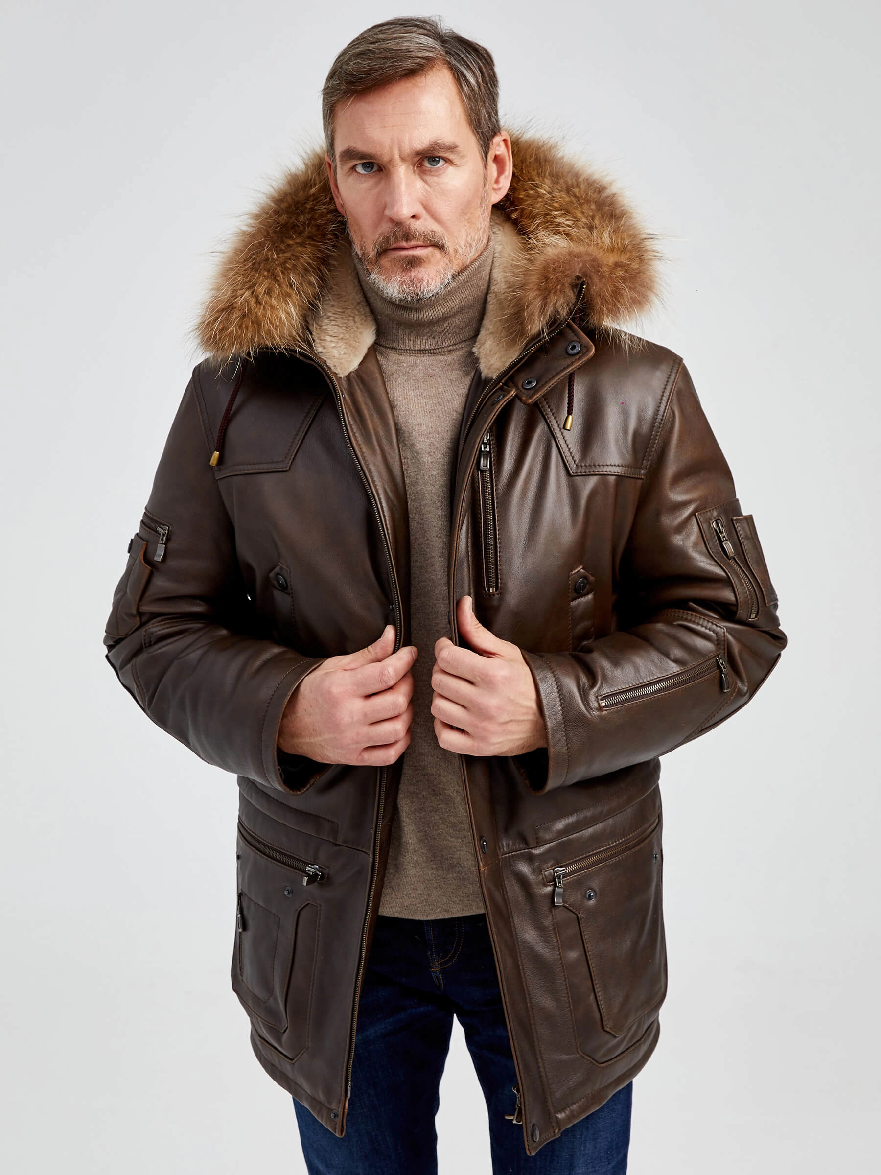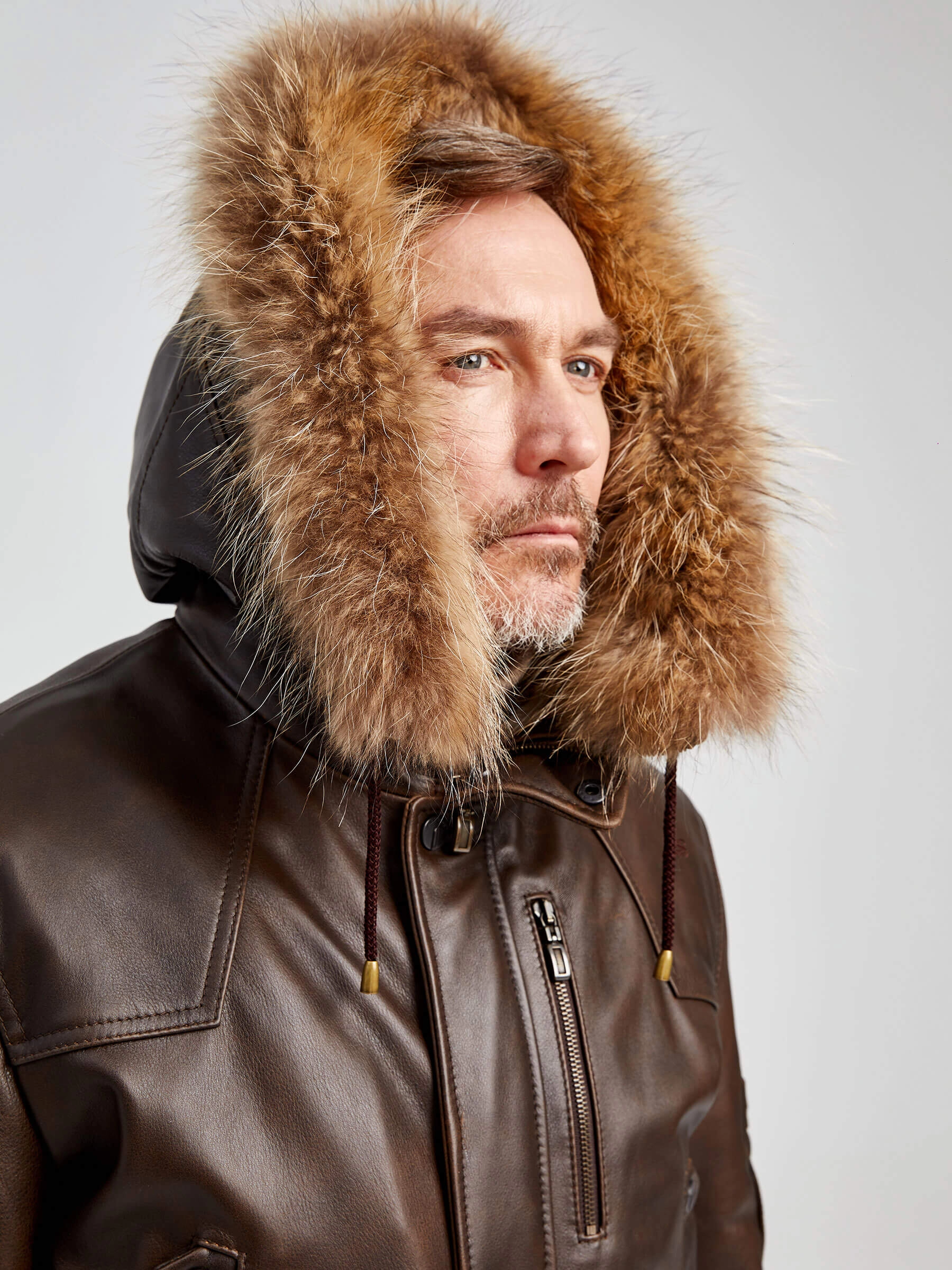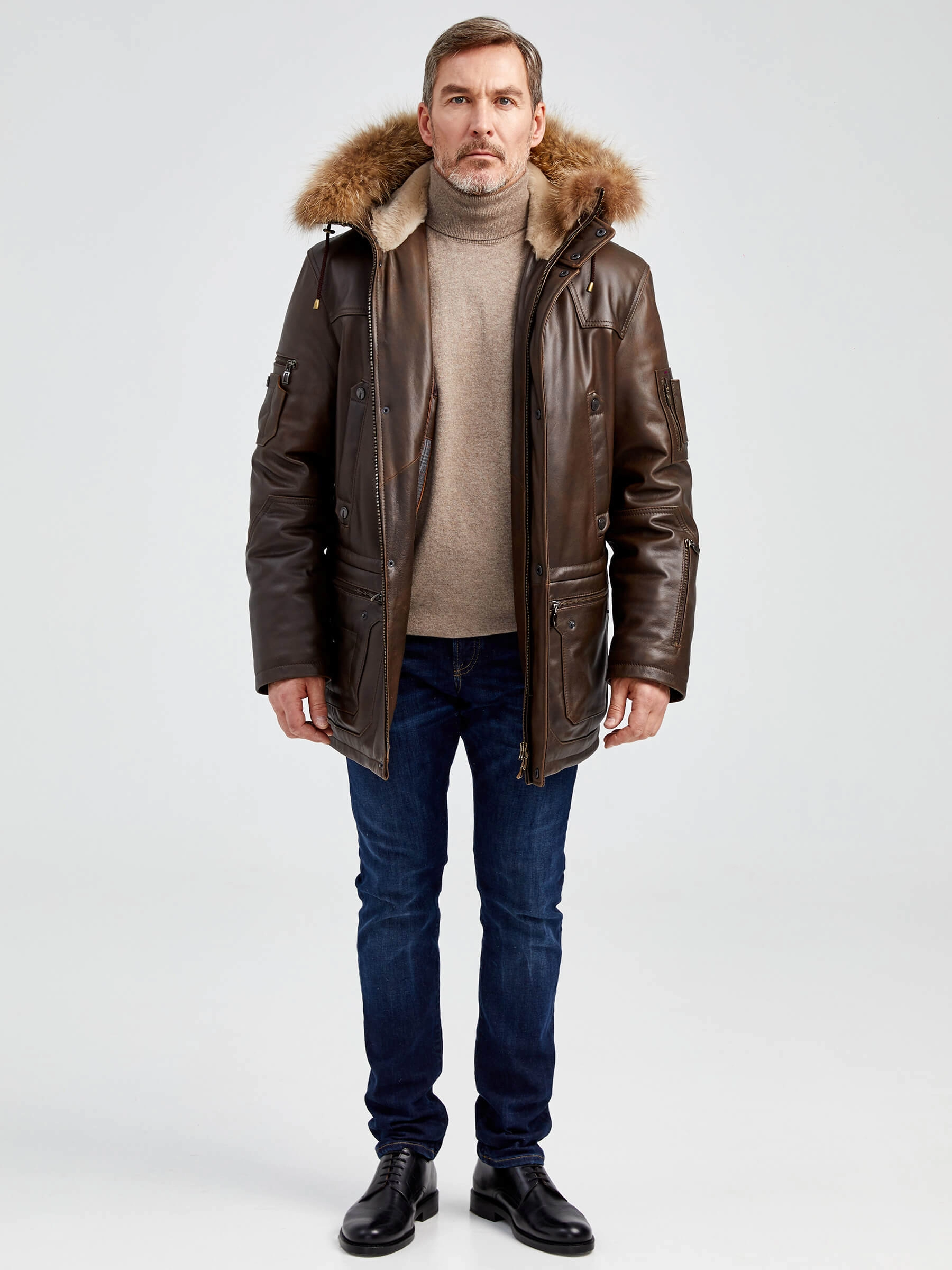 Утепленная мужская кожаная куртка аляска с мехом енота Алекс, светло-коричневая, размер 44, артикул 40450
