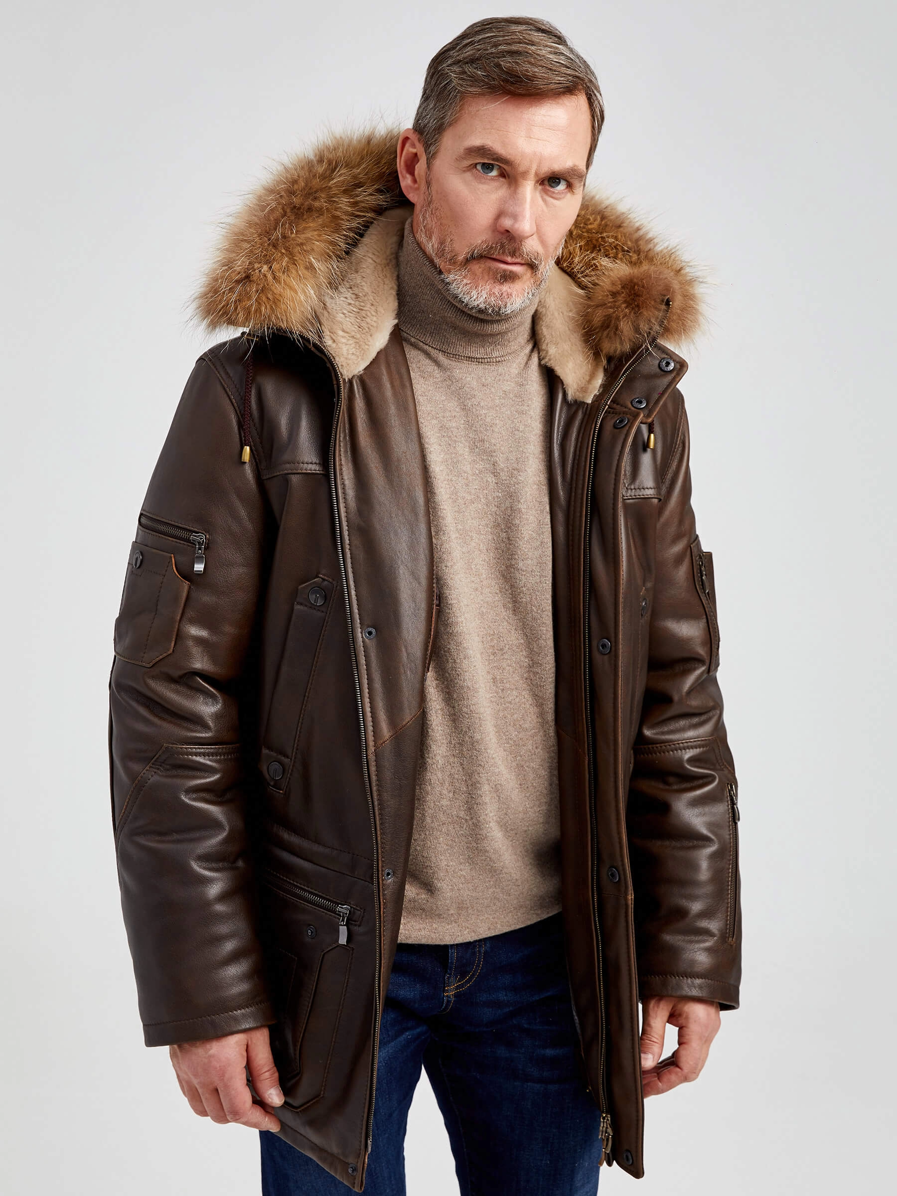 Куртка «Аляска» в современной интерпретации. Кожа высшего качества. Современный утеплитель. Удобный капюшон. Тонкорунная овчина внутри капюшона. Опушь капюшона из меха енота. Множество наружных и внутренних карманов. Свободный крой обеспечивает комфортную посадку по фигуре. Куртка очень удобна за рулём.