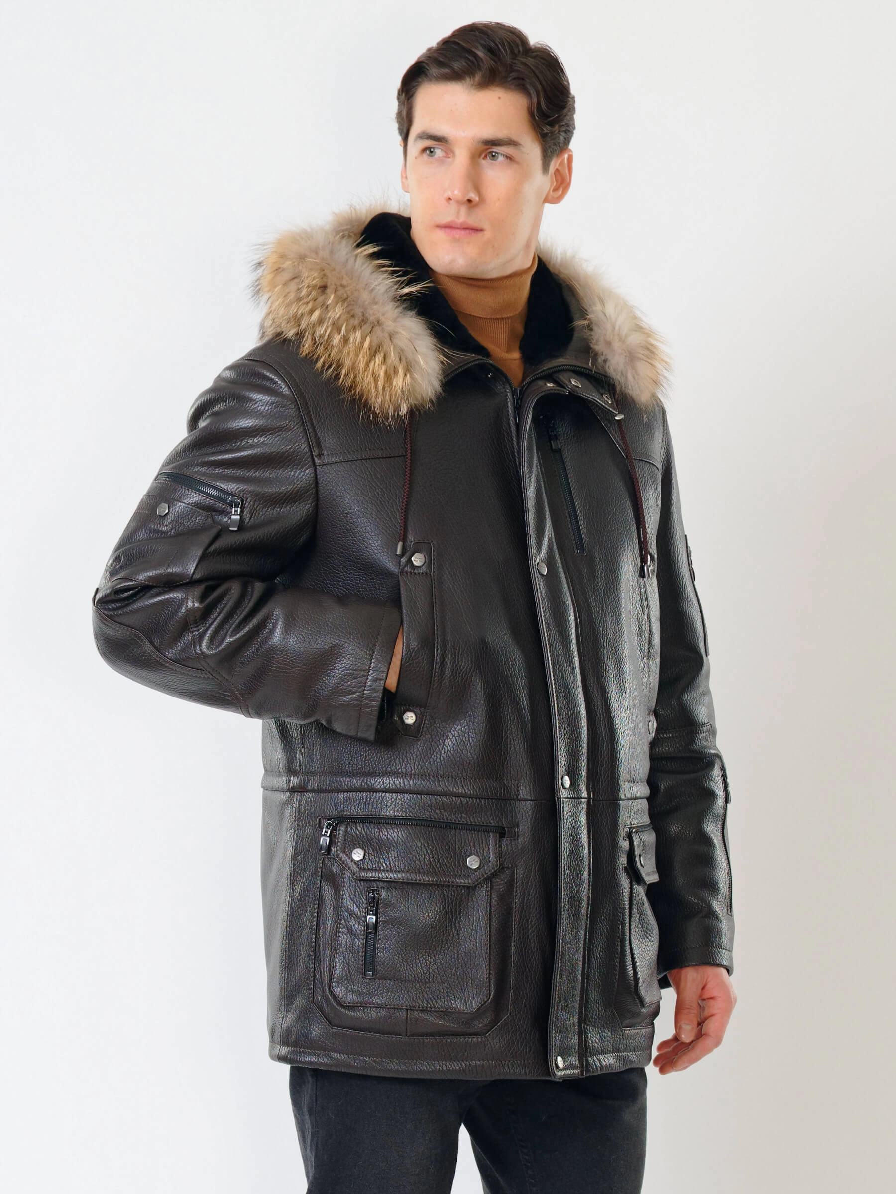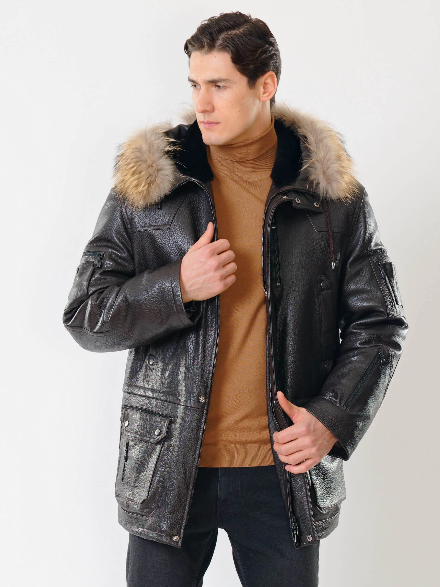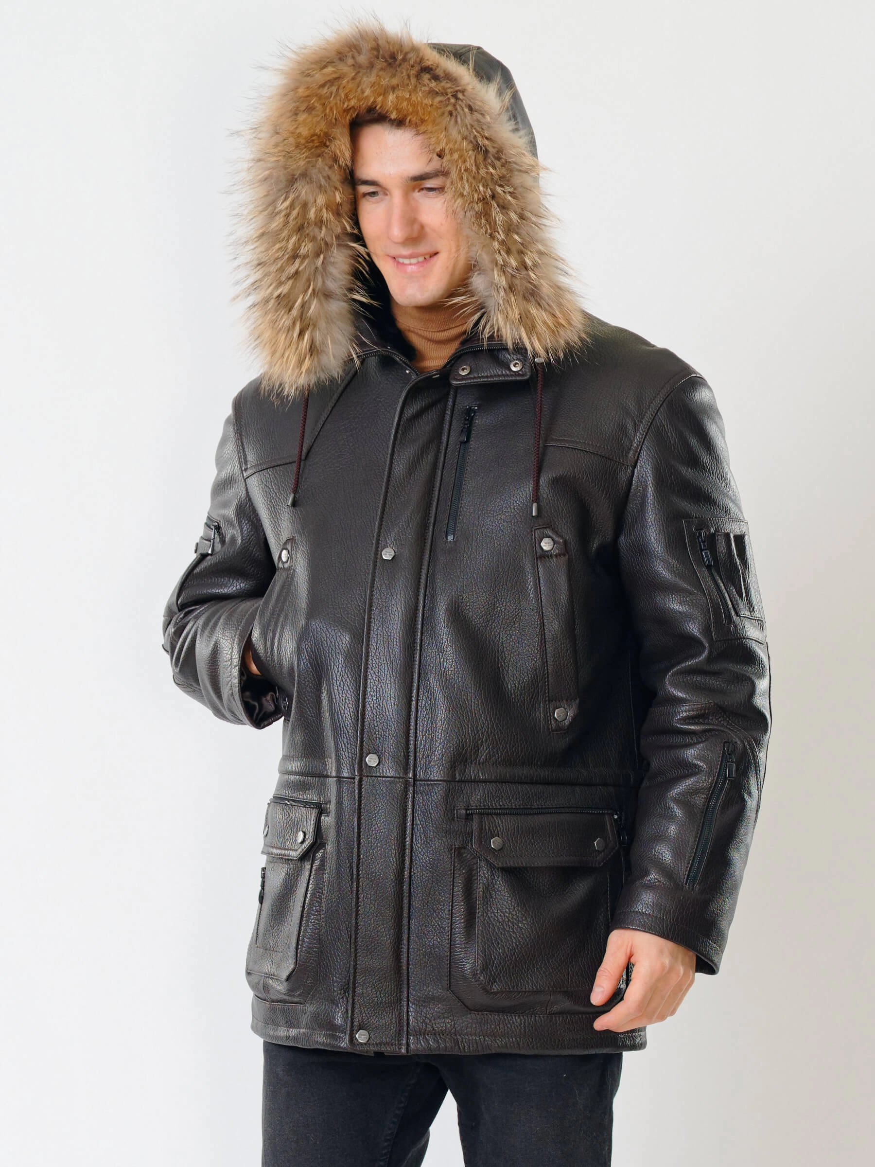Утепленная мужская кожаная куртка аляска с мехом енота Алекс, коричневая, размер 52, артикул 40301