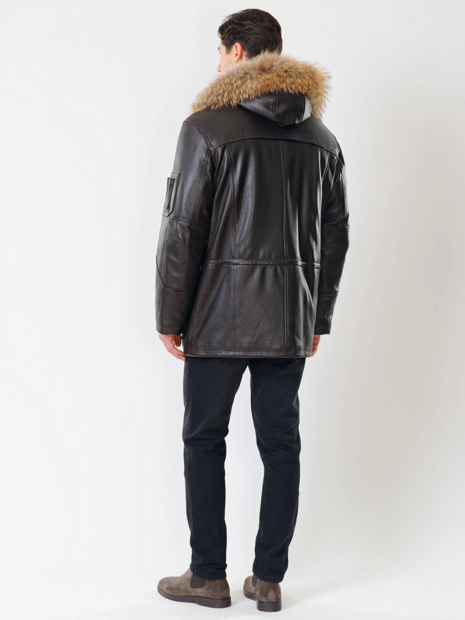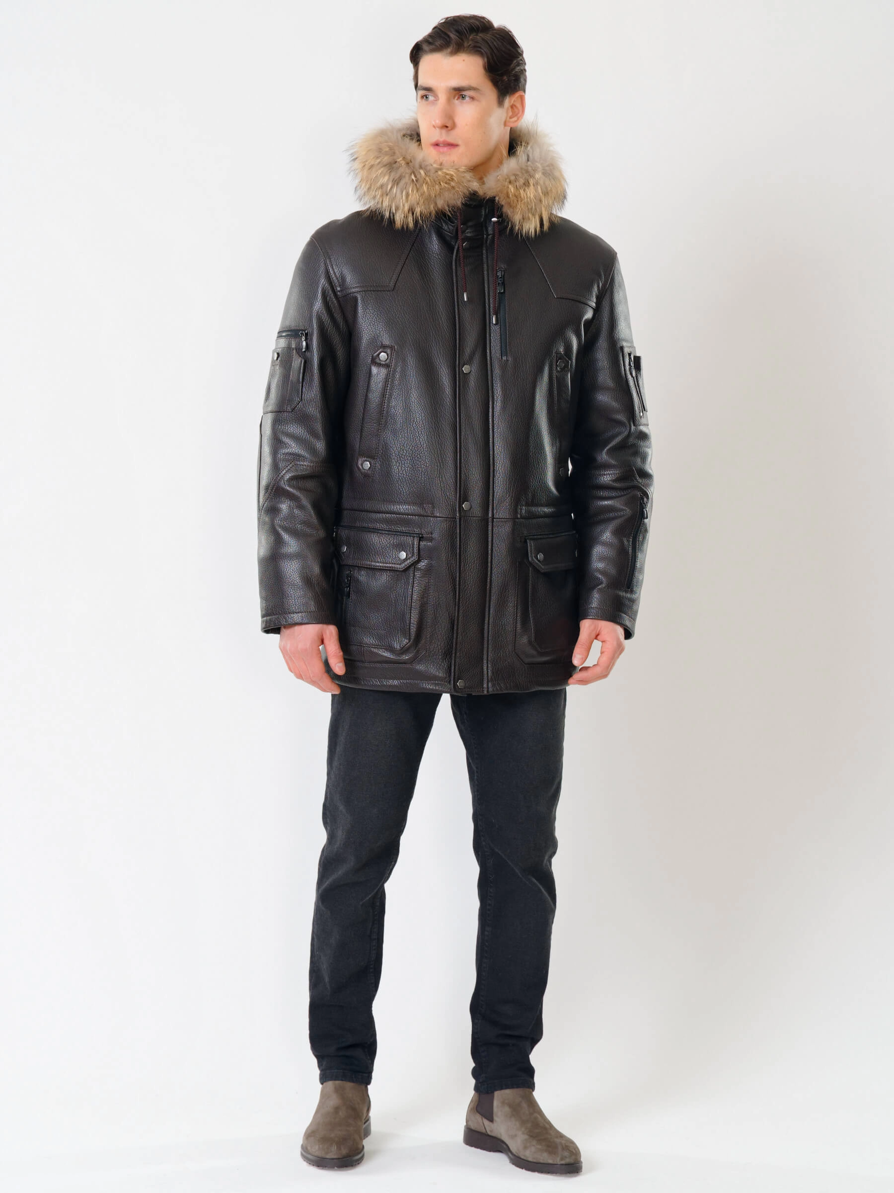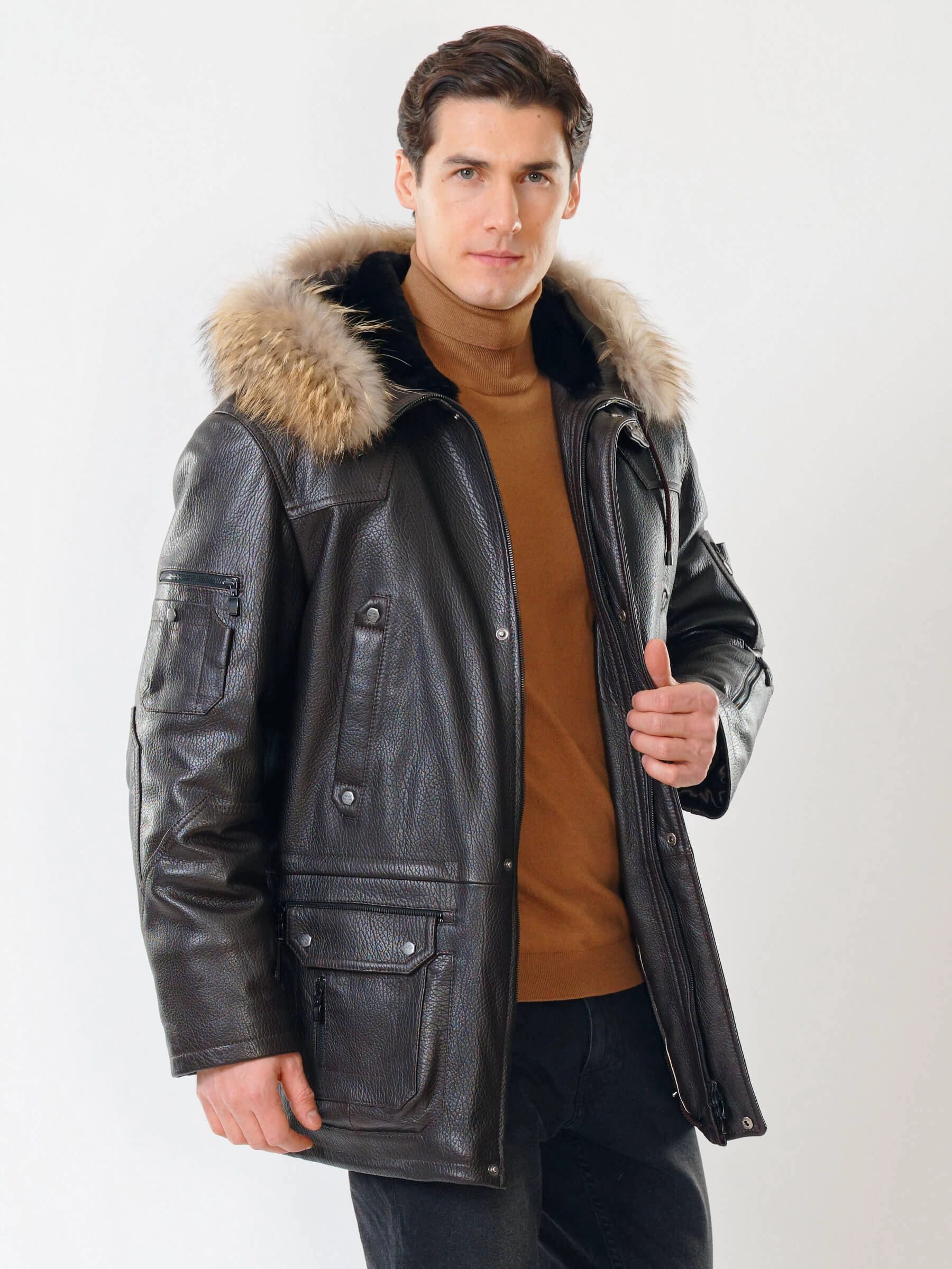 Утепленная мужская кожаная куртка аляска с мехом енота Алекс, коричневая, размер 52, артикул 40301