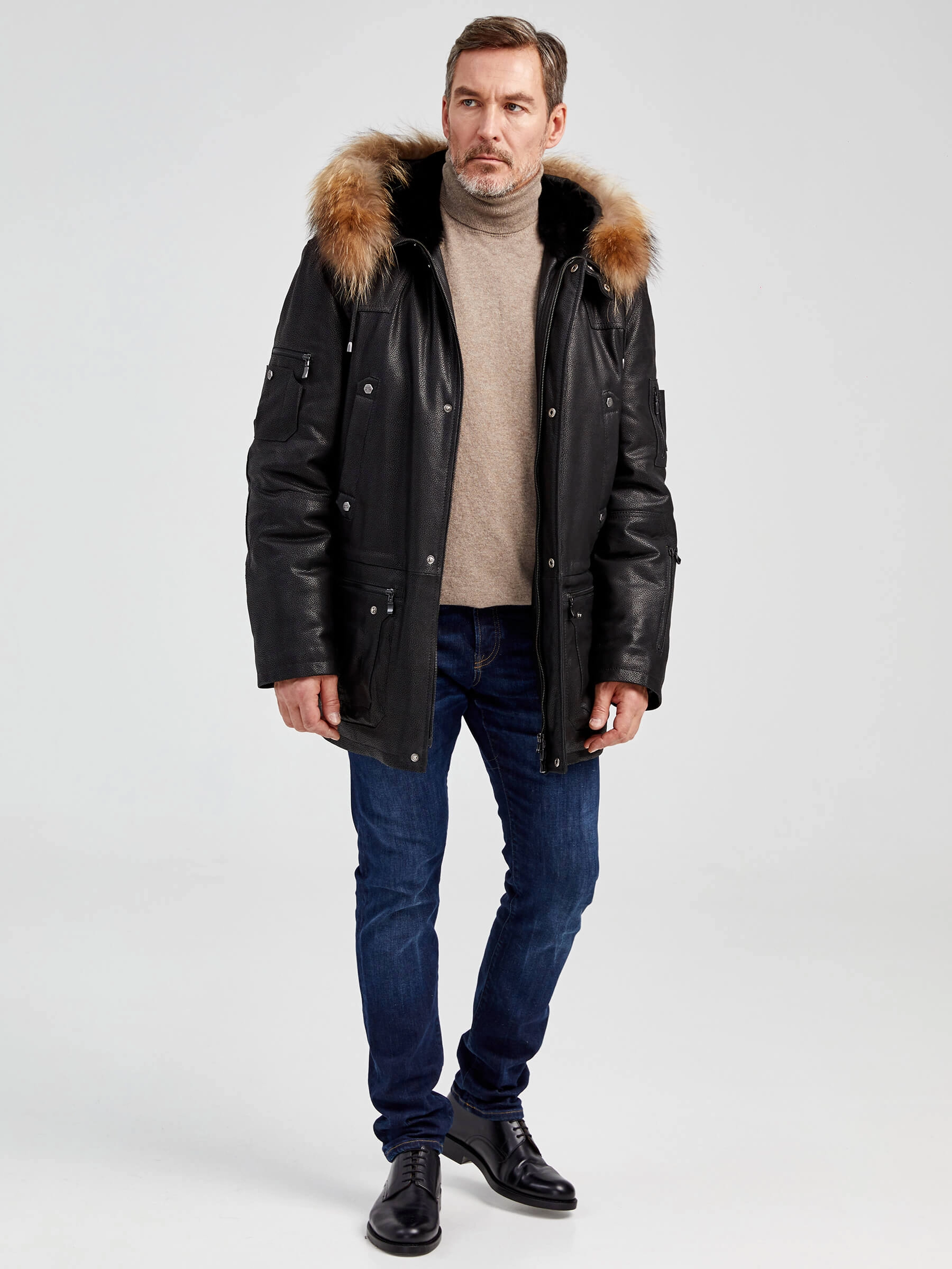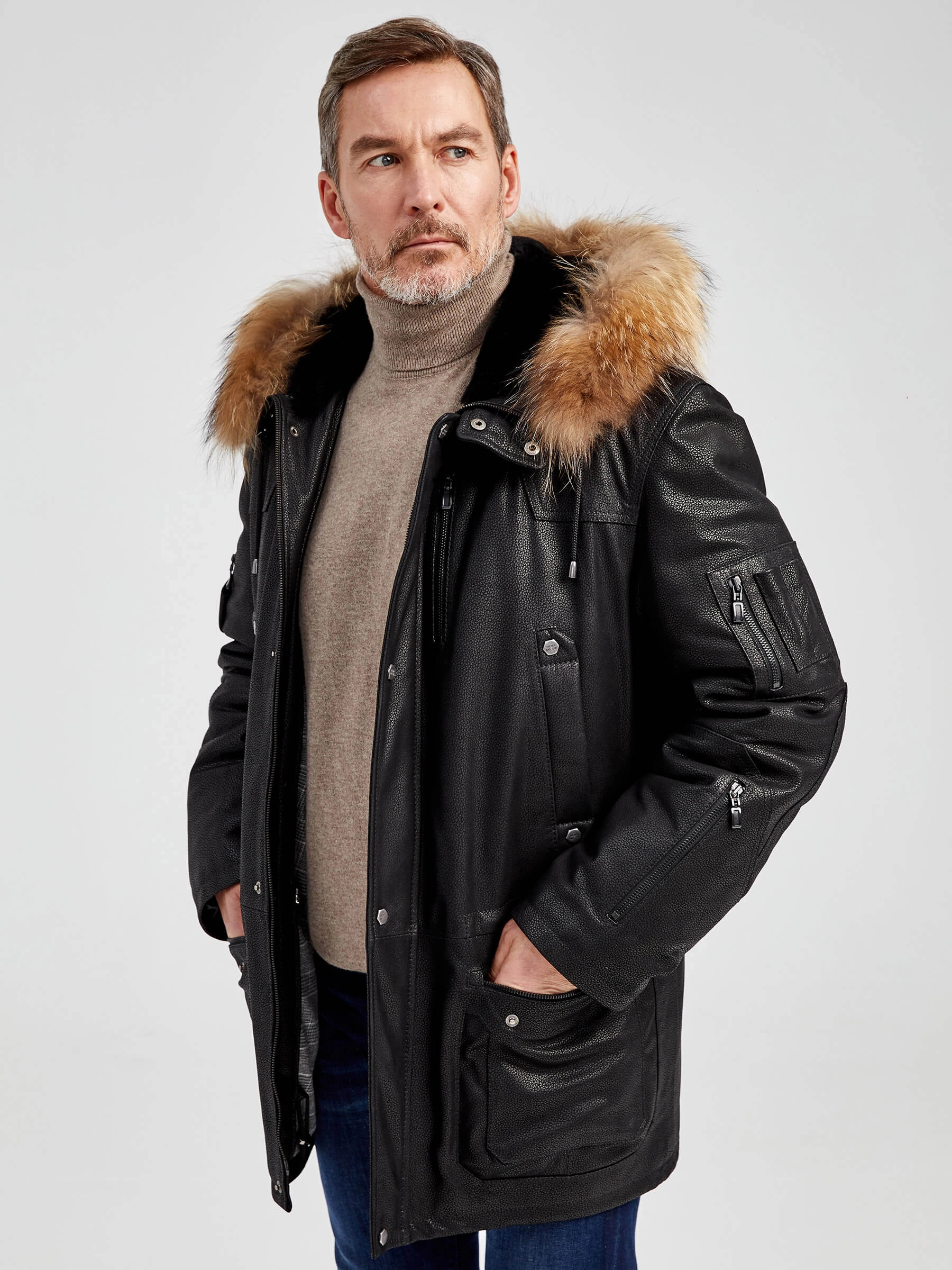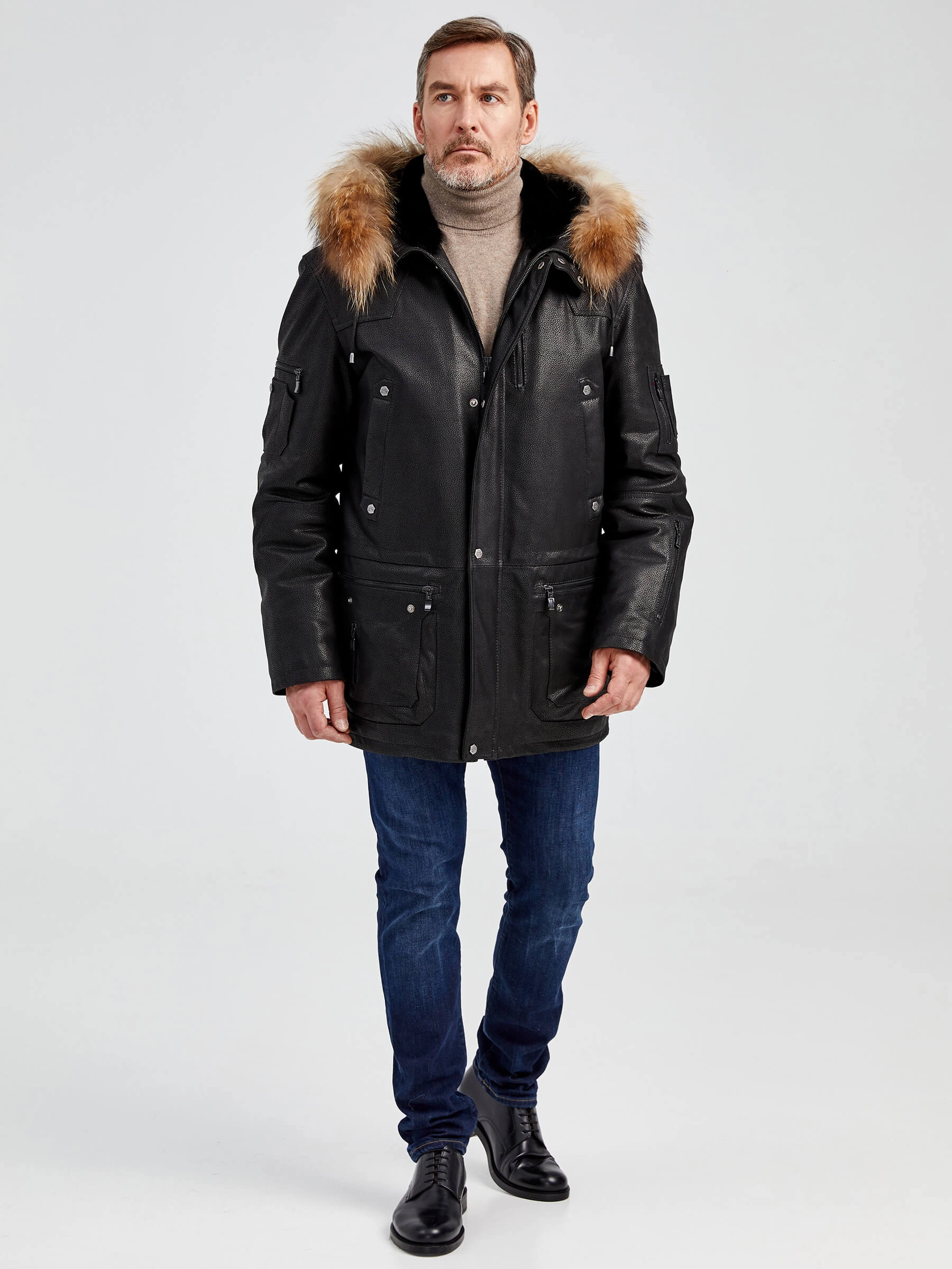 Куртка «Аляска» в современной интерпретации. Кожа высшего качества. Современный утеплитель. Удобный капюшон. Тонкорунная овчина внутри капюшона. Опушь капюшона из меха енота. Множество наружных и внутренних карманов. Свободный крой обеспечивает комфортную посадку по фигуре. Куртка очень удобна за рулём.