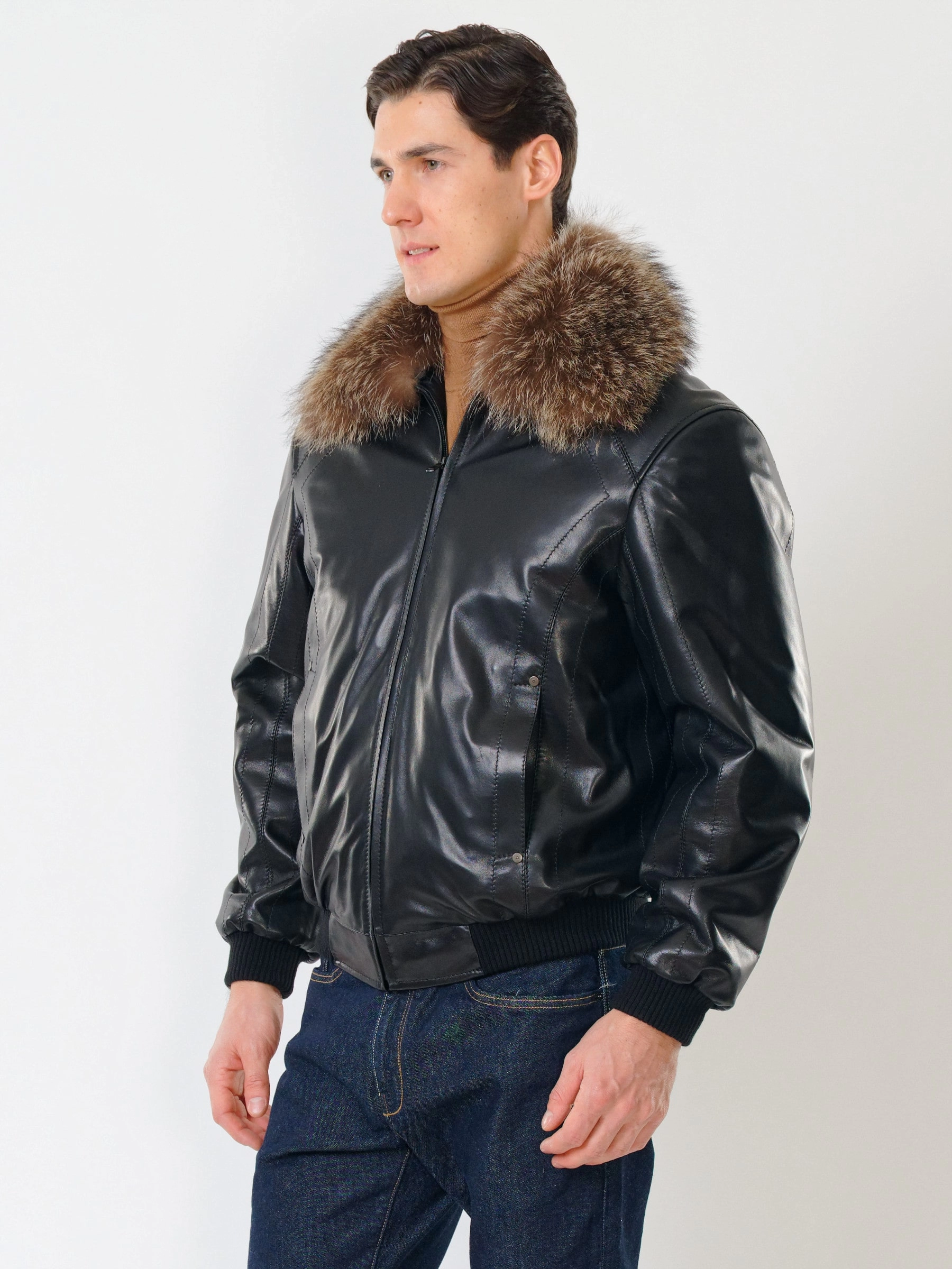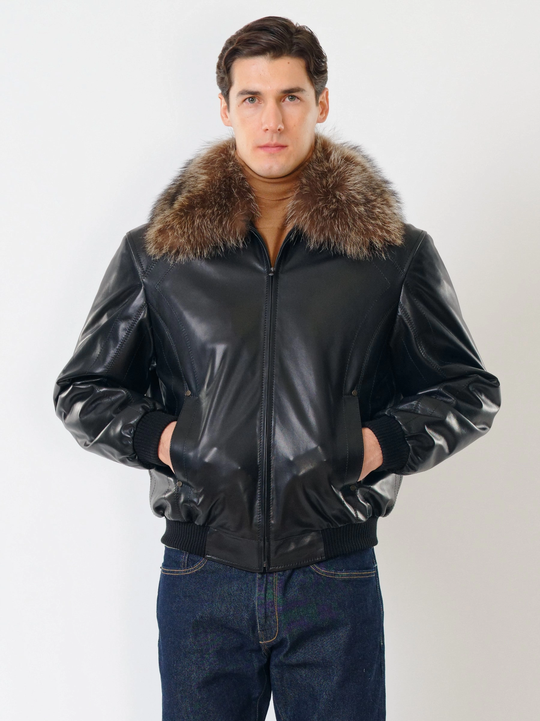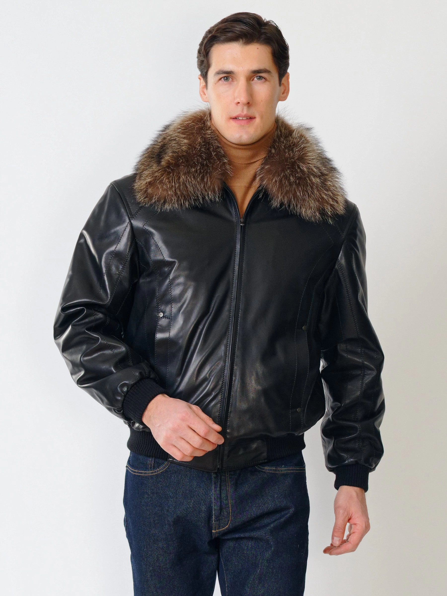 Мужская утепленная кожаная куртка бомбер на резинке с енотовым воротником Мауро-зима, черная, размер 64, артикул 40320