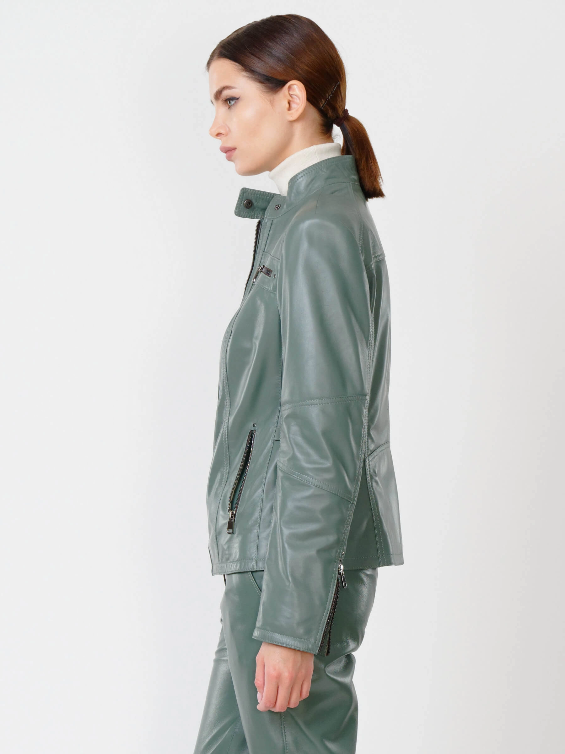 Короткая куртка из натуральной кожи на молнии с воротником-стойкой на кнопке и втачными рукавами. Полуприлегающий силуэт в повседневном стиле дополнен врезными и нагрудными карманами на молниях, а также регулируемыми боковыми патами на талии для точной посадки. Безупречно сочетается с джинсами, брюками, свитерами и базовыми футболками, создавая универсальный стильный образ. Качество кожи — премиальное!