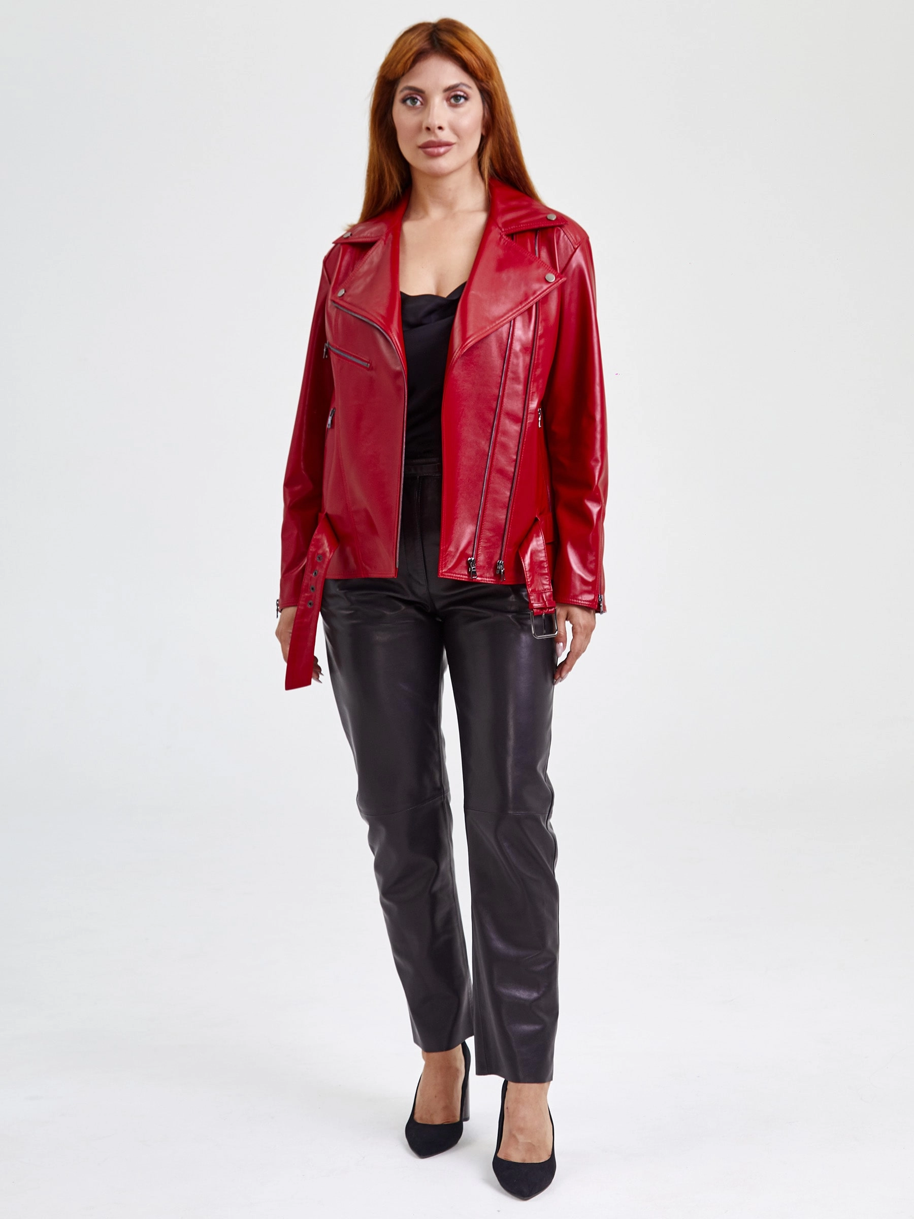 Товар кожаная женская куртка косуха с поясом 3013, красная, размер 46, артикул 91710 выполнен из натуральной кожи с застежкой молния. Рассчитан на сезон: весна-лето. Длина изделия 65 см, силуэт прямой.