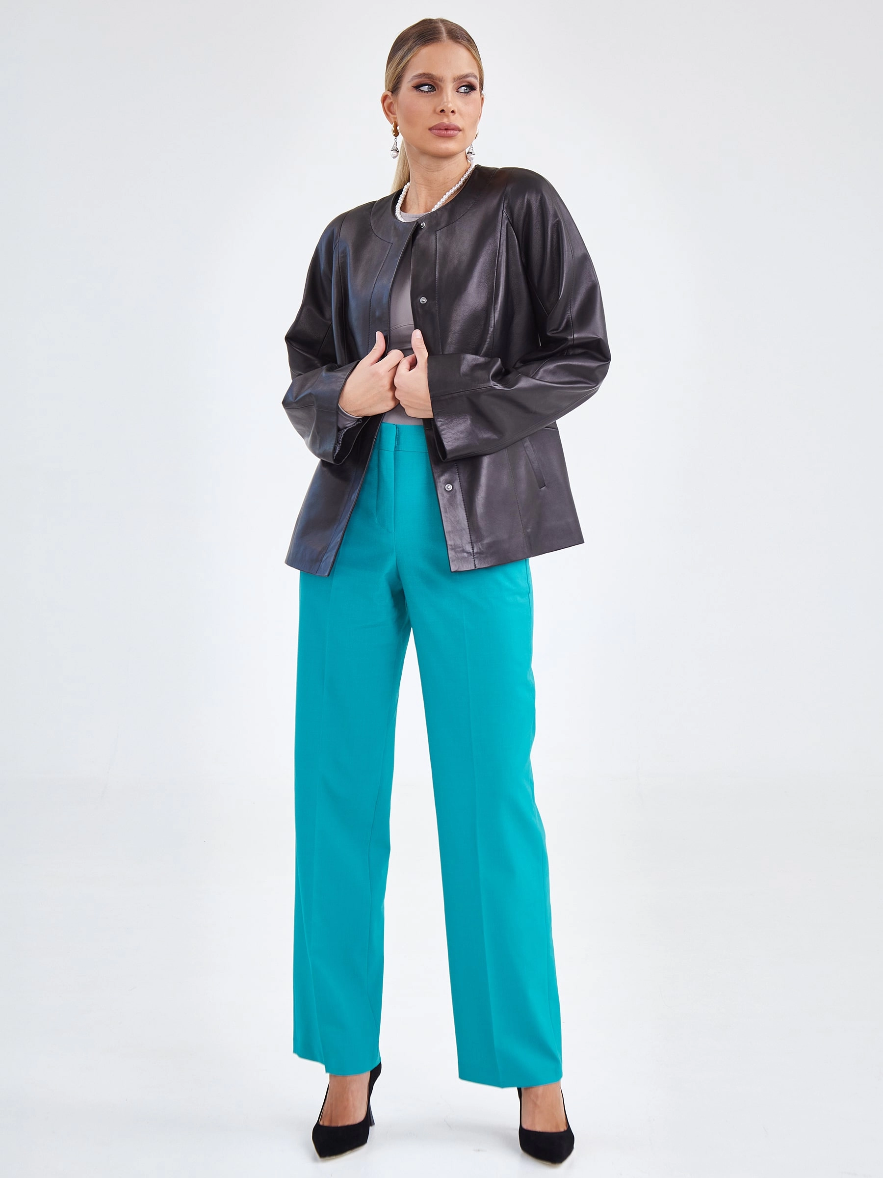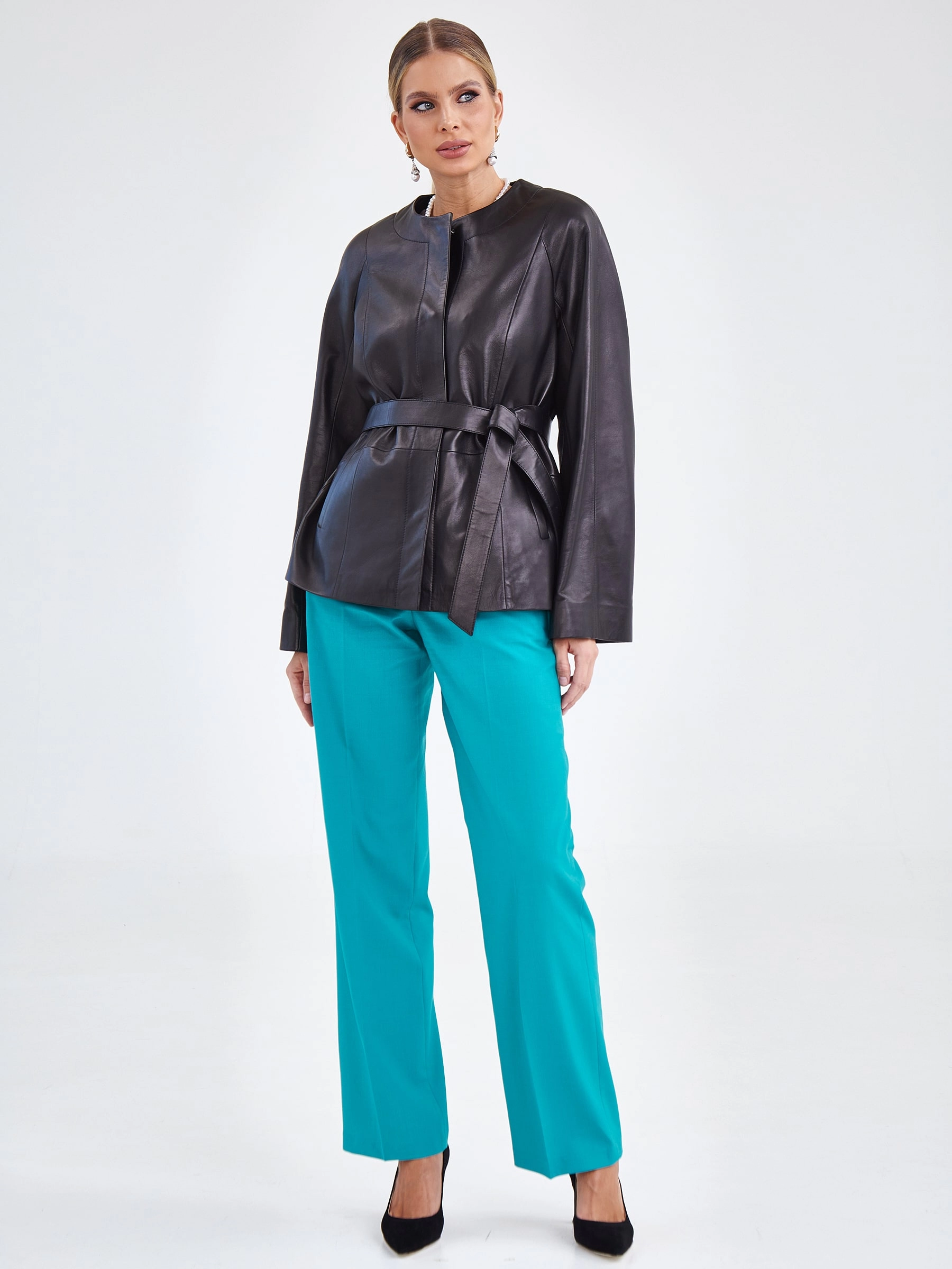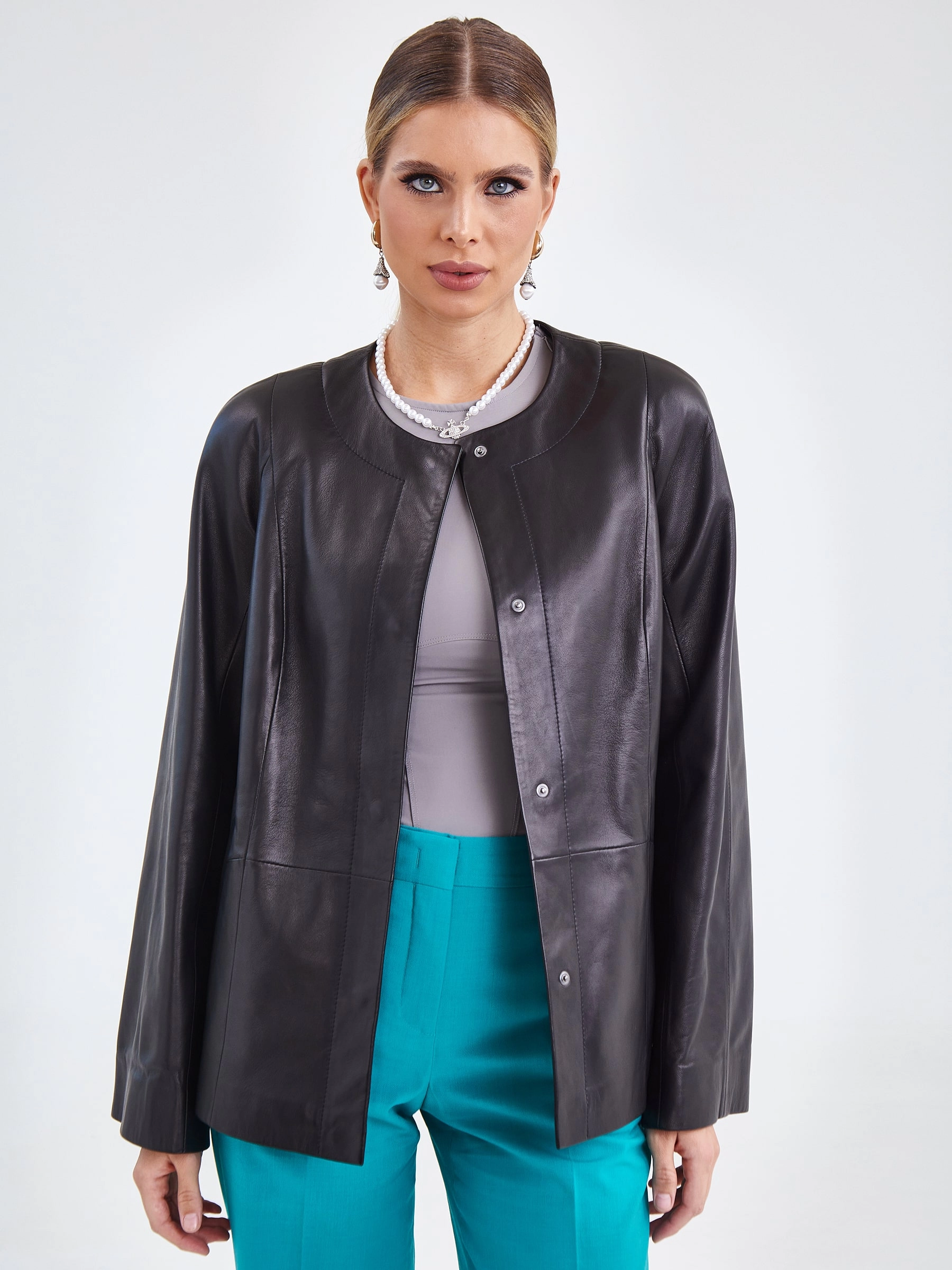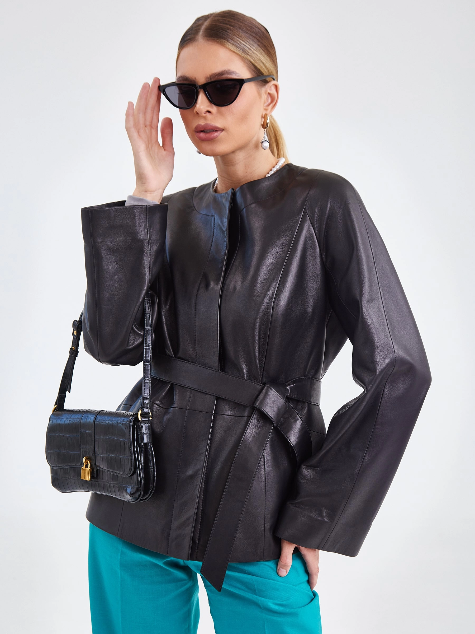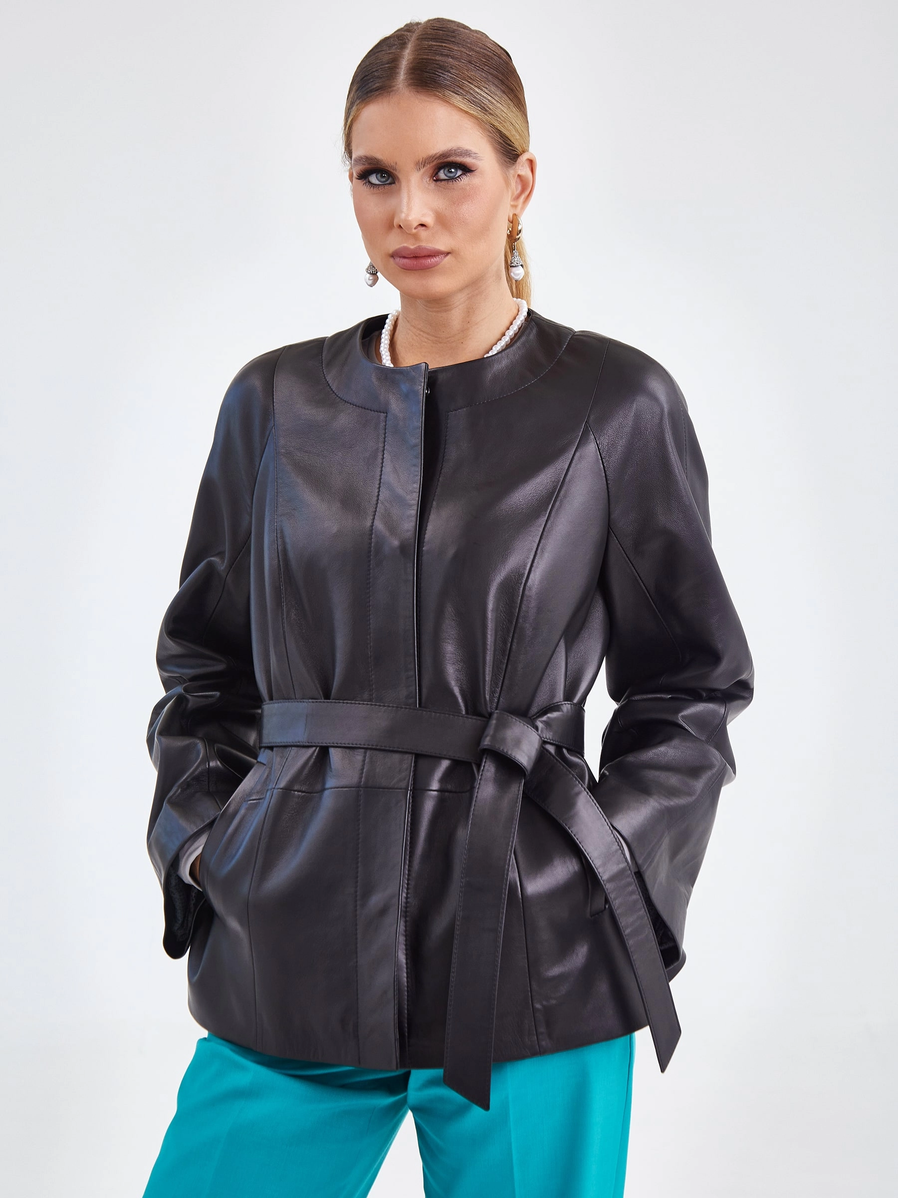 Куртка из натуральной кожи на потайных кнопках с элегантным круглым вырезом без воротника и рукавами реглан. Прямой силуэт в повседневном стиле дополнен широким регулируемым поясом, создающим эффект «песочные часы», и практичными боковыми карманами. Идеально сочетается с юбками-карандаш, водолазками, темными джинсами и ботильонами, добавляя образу утонченную элегантность. Качество кожи — премиальное!
