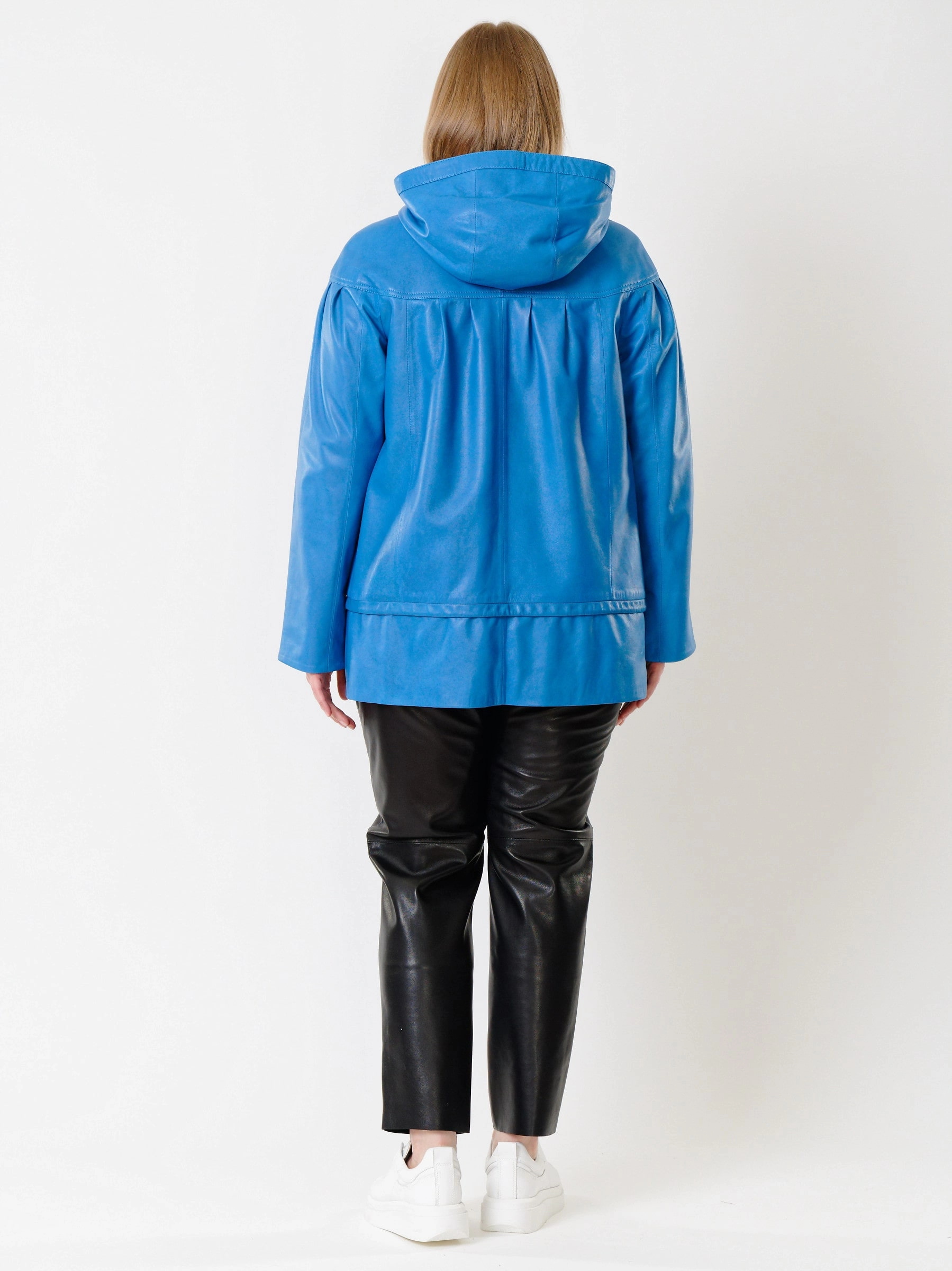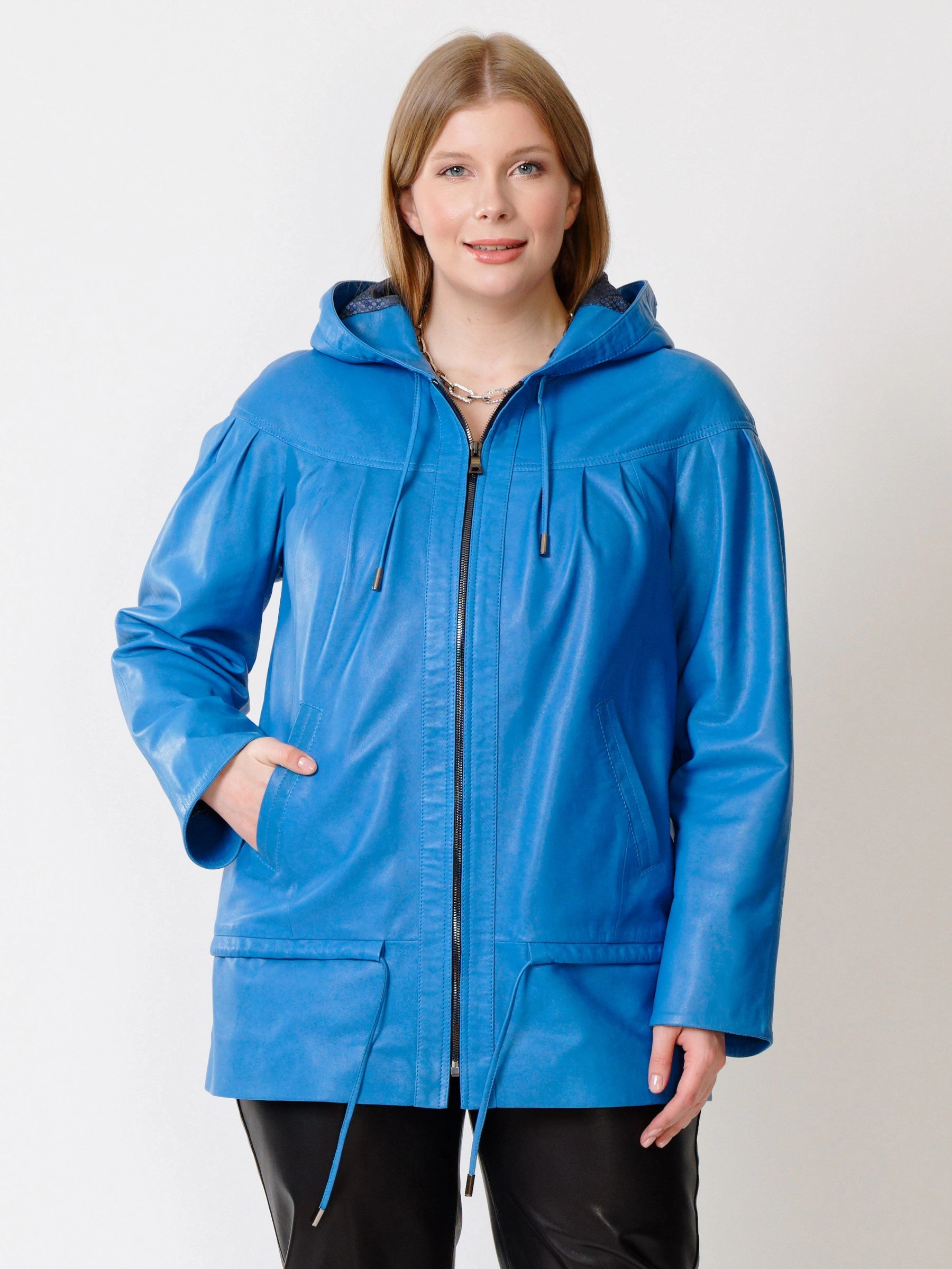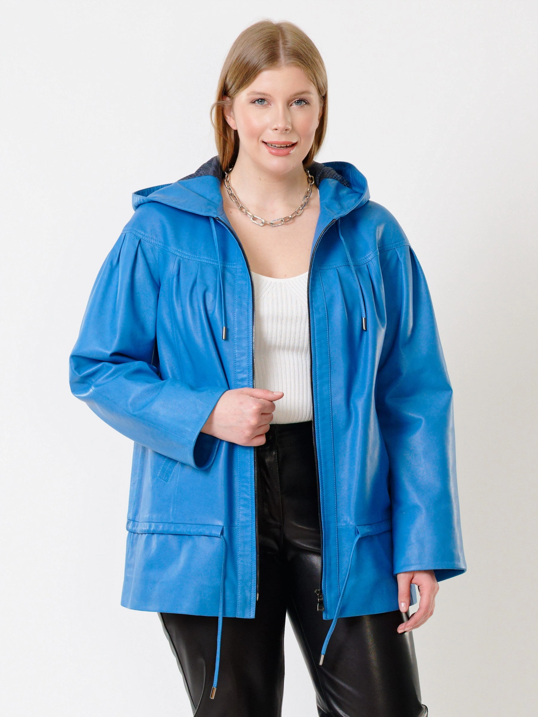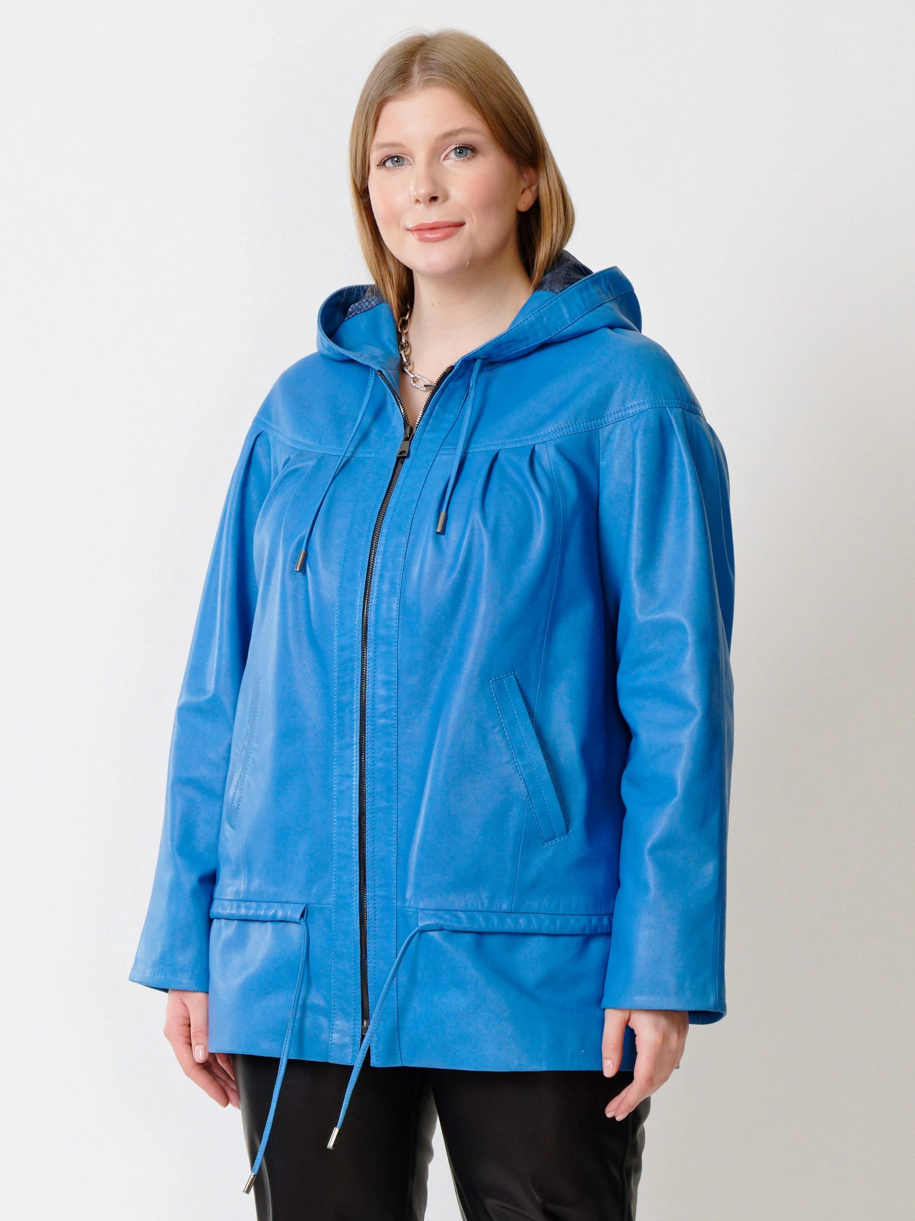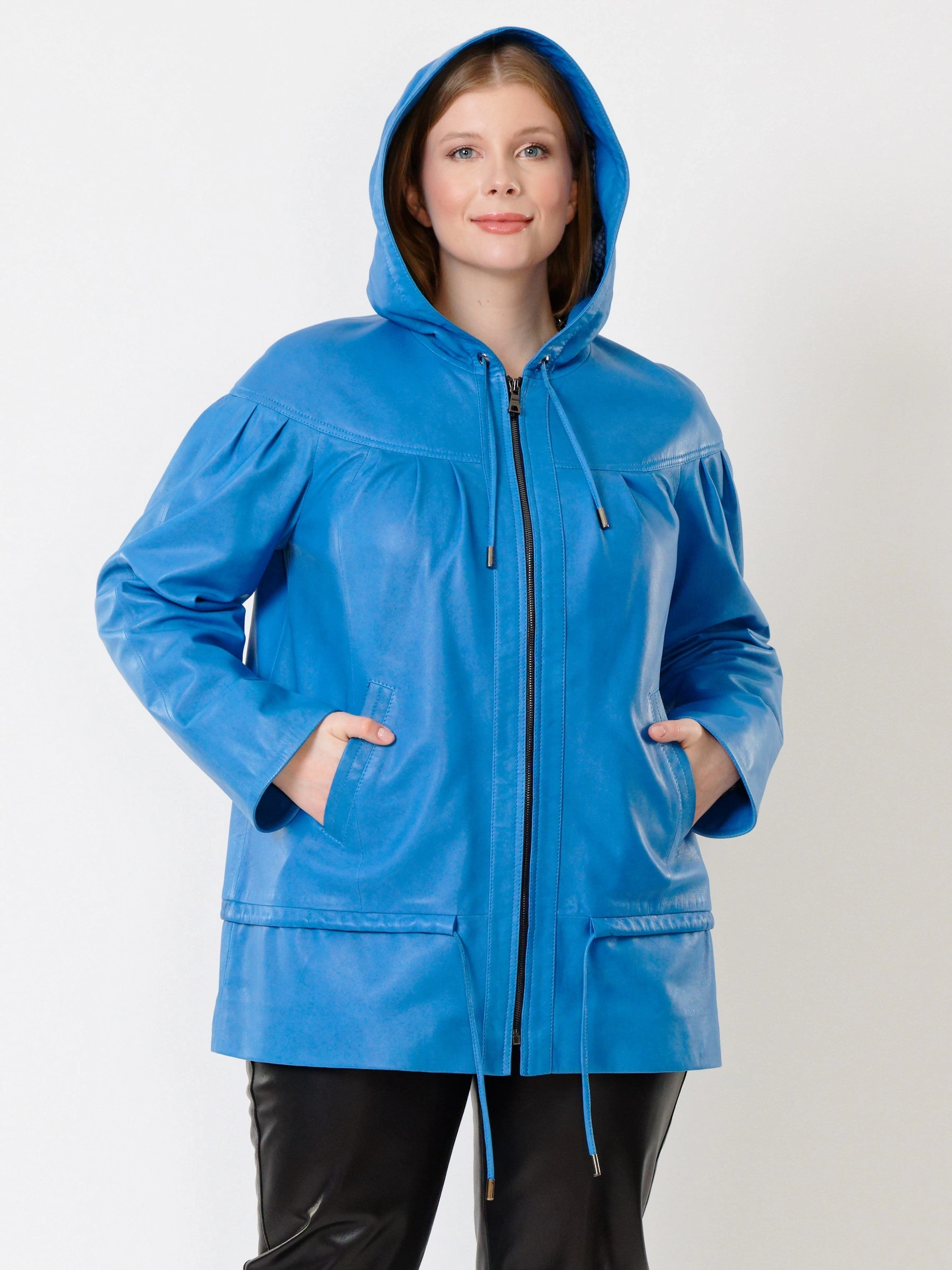 Товар кожаная женская куртка с капюшоном 303у, голубая, размер 54, артикул 91201 выполнен из натуральной кожи с застежкой молния. Рассчитан на сезон: весна-лето. Длина изделия 75 см, силуэт свободный.