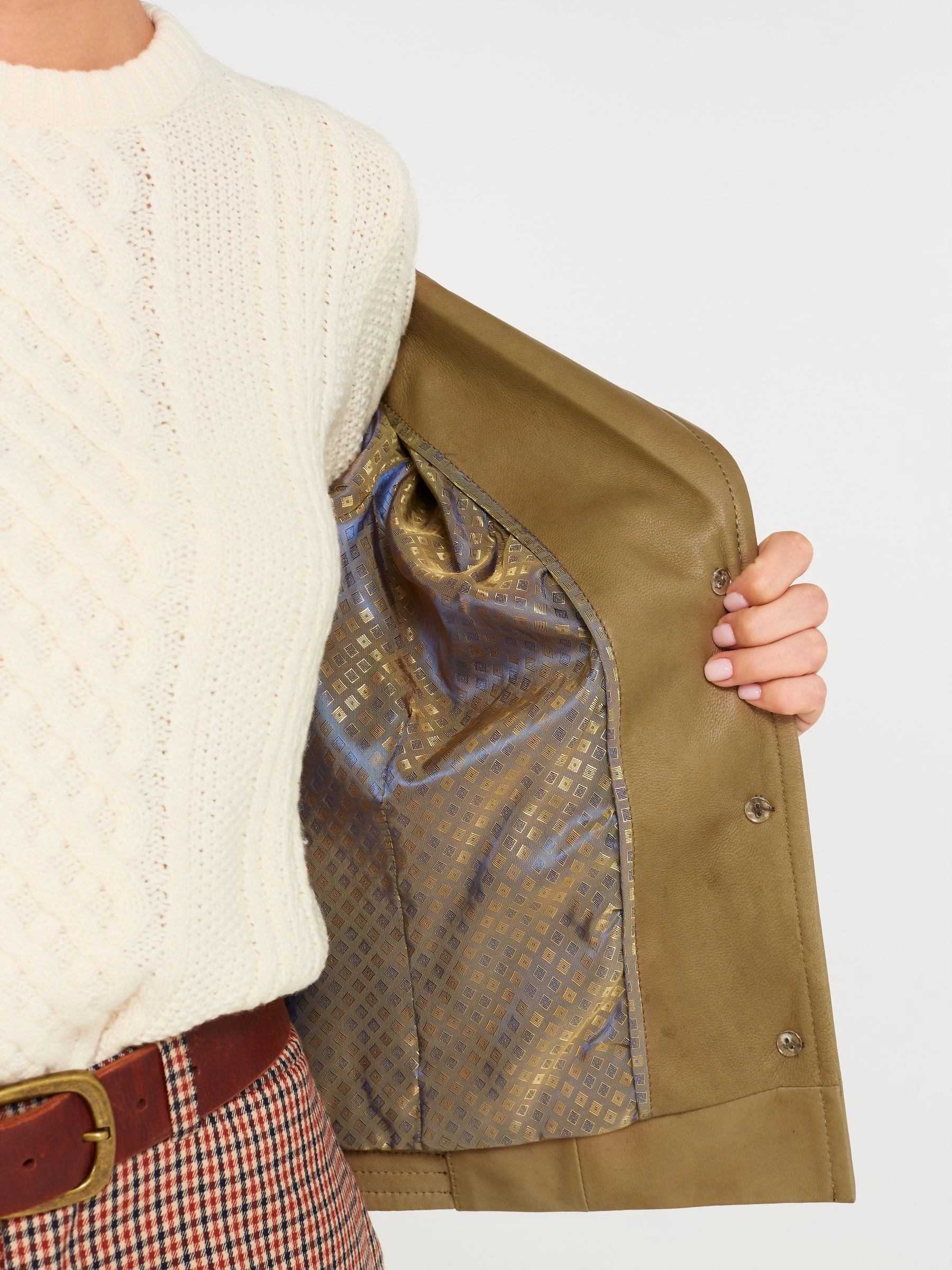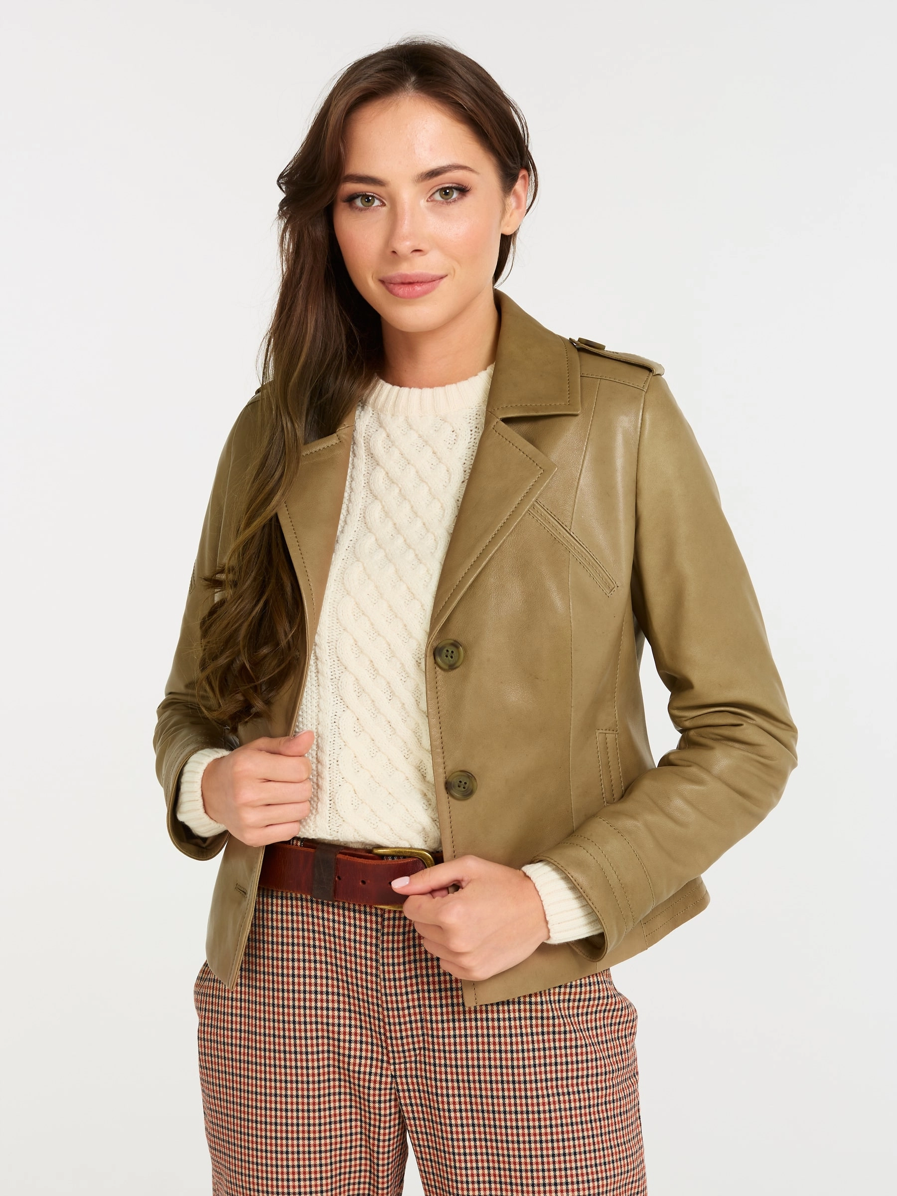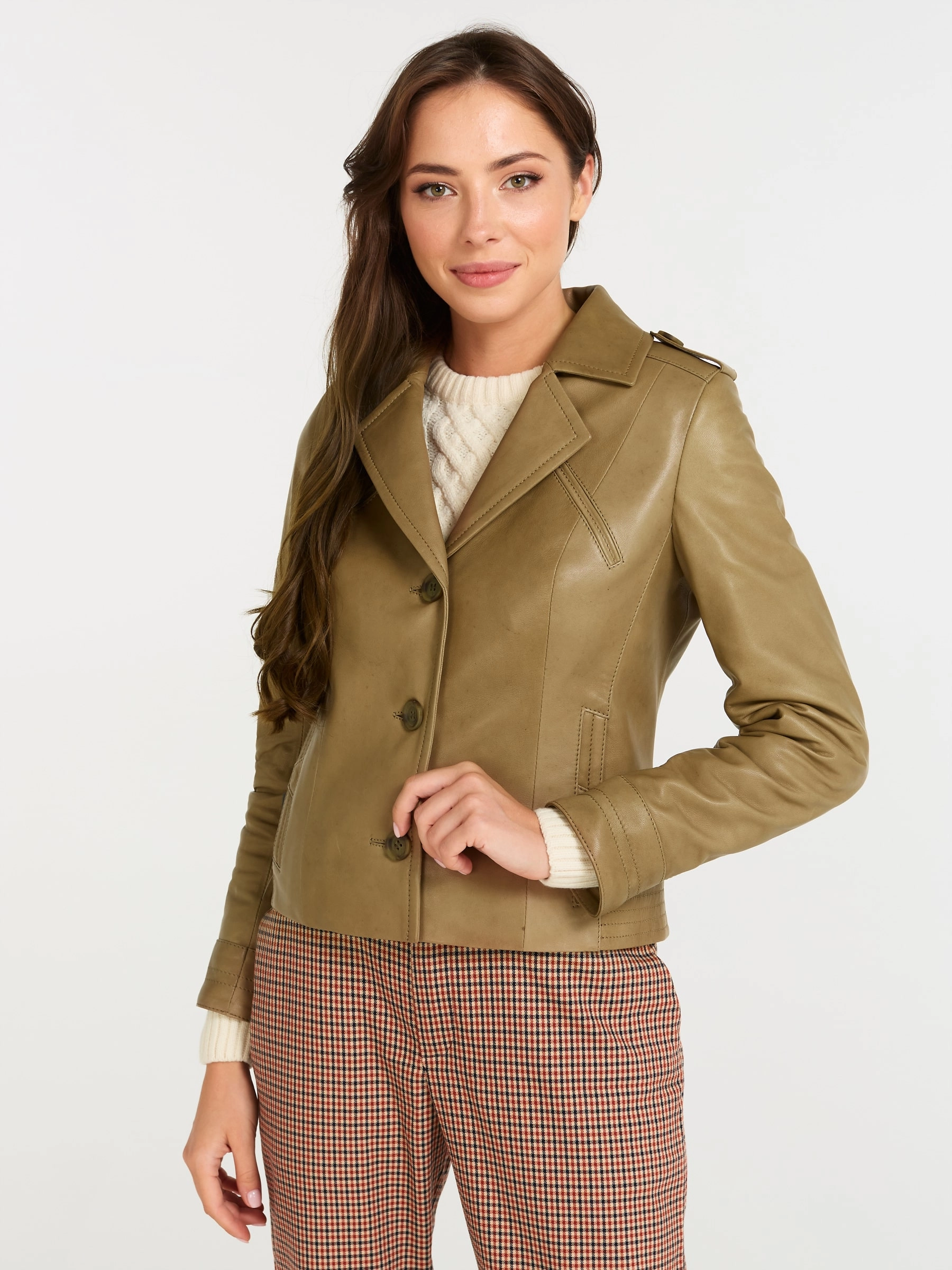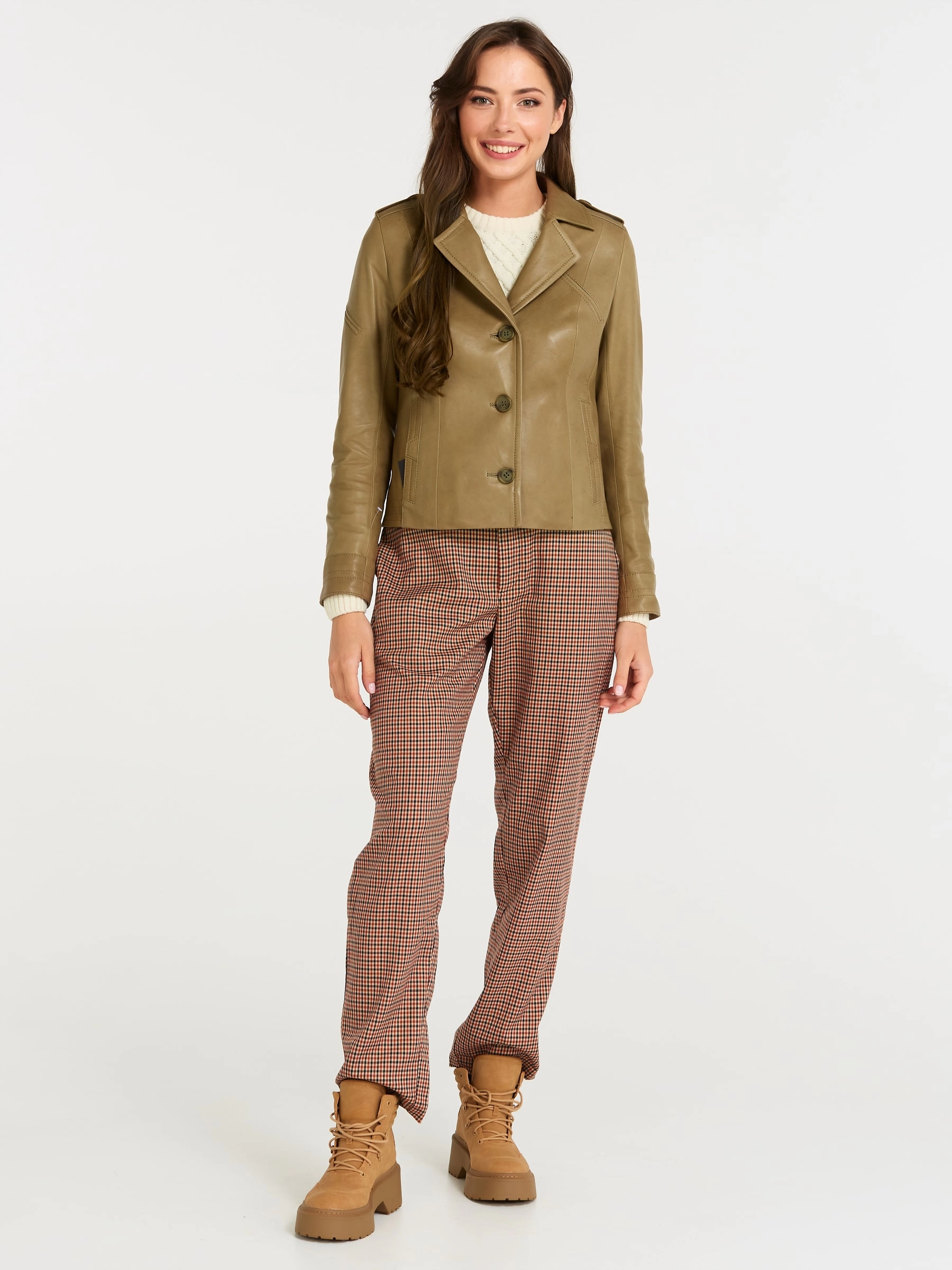 Короткий кожаный пиджак в стиле милитари на пуговицах с полуприлегающим силуэтом. Безупречную посадку обеспечивают четкие линии английского воротника, втачной рукав и акцент на талии. Лаконичный дизайн дополняют практичные врезные карманы. Сочетайте с джинсами и ботинками для дерзкого повседневного образа или с брюками-карго для полного воплощения милитарной эстетики.