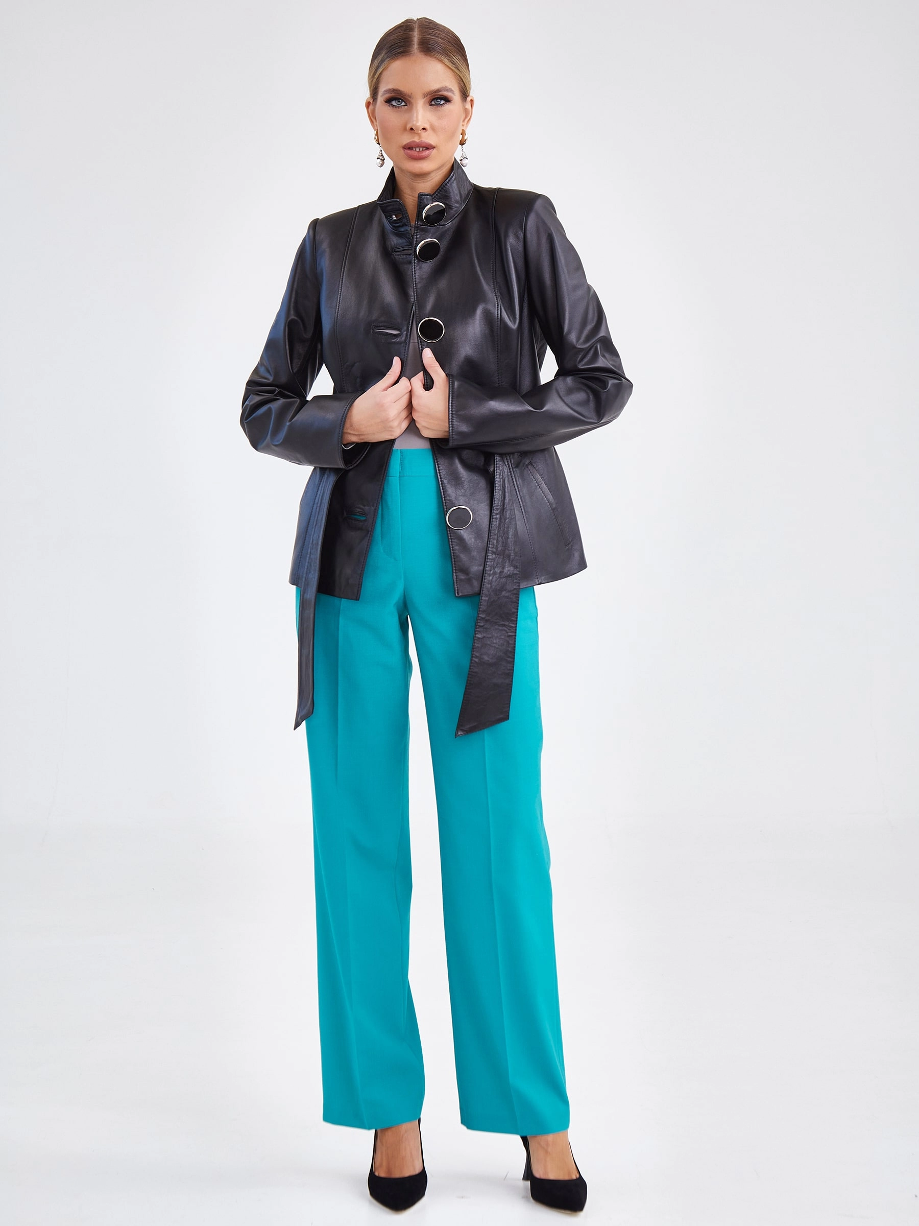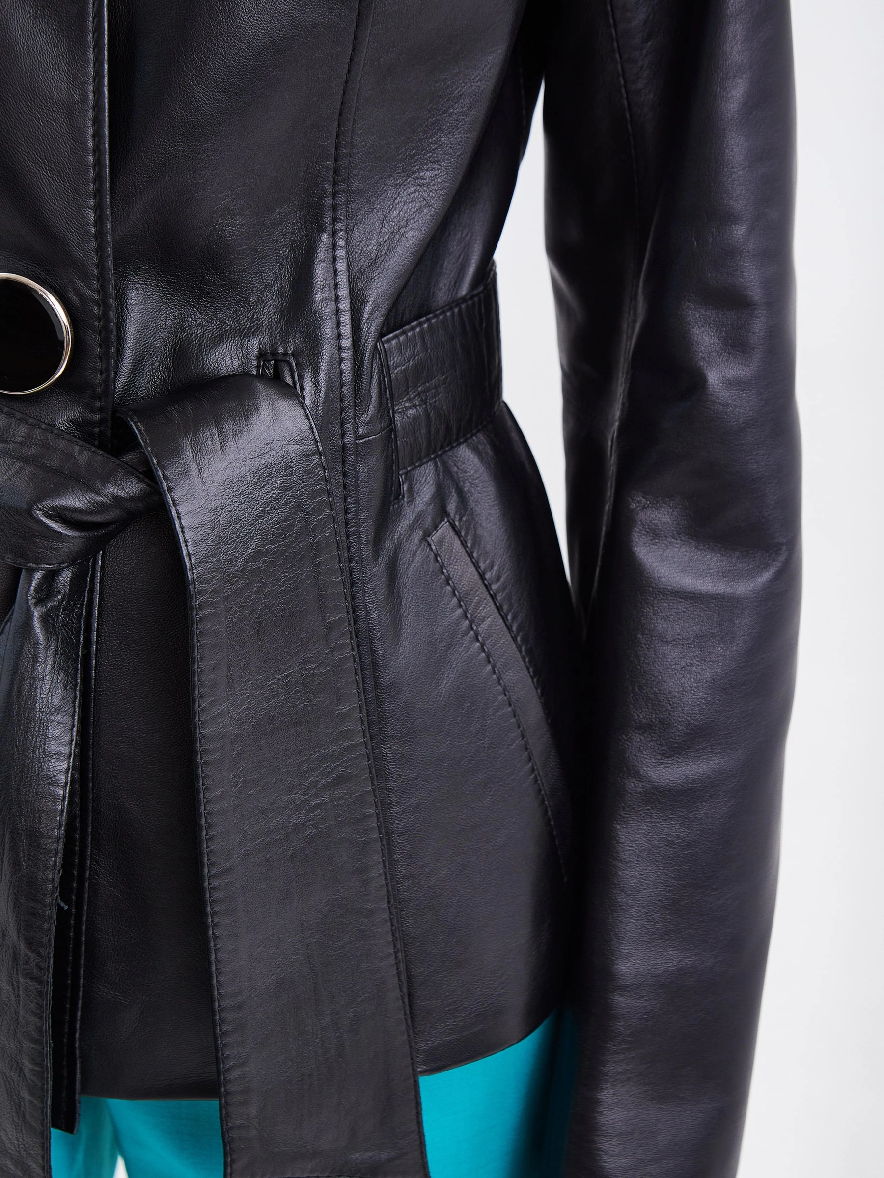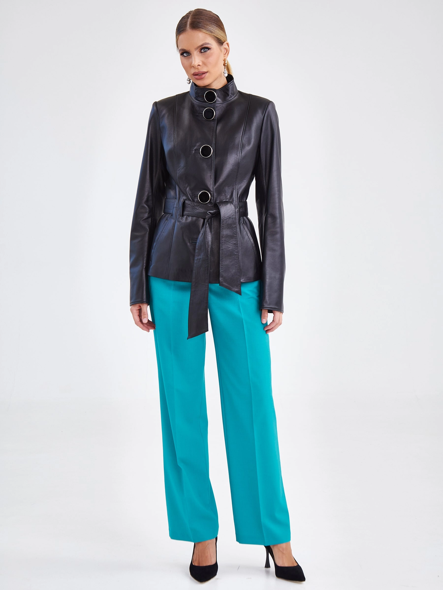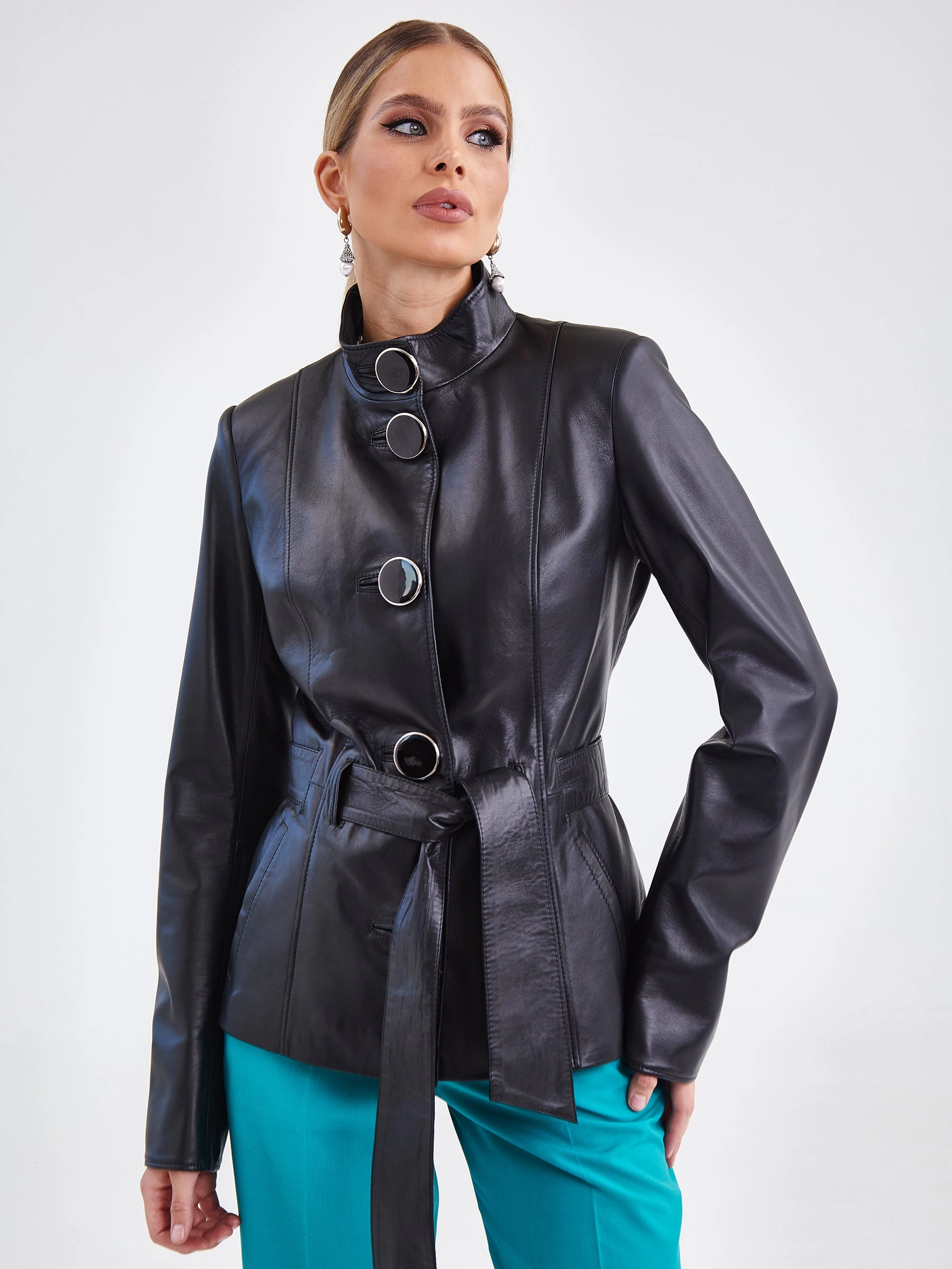 Элегантная куртка из натуральной кожи на пуговицах с акцентным поясом — идеальное сочетание утонченности и дерзкого характера. Приталенный силуэт длиной 66 см подчеркивает талию, а невысокая стойка и лаконичные врезные карманы завершают сдержанный образ. Гладкая кожа премиального качества и выразительные пуговицы подчеркивают статусность модели. Носите эту куртку с кожаными брюками для монохромного ансамбля или набросьте на платье-миди, чтобы создать контрастный повседневный образ с ноткой смелости.
