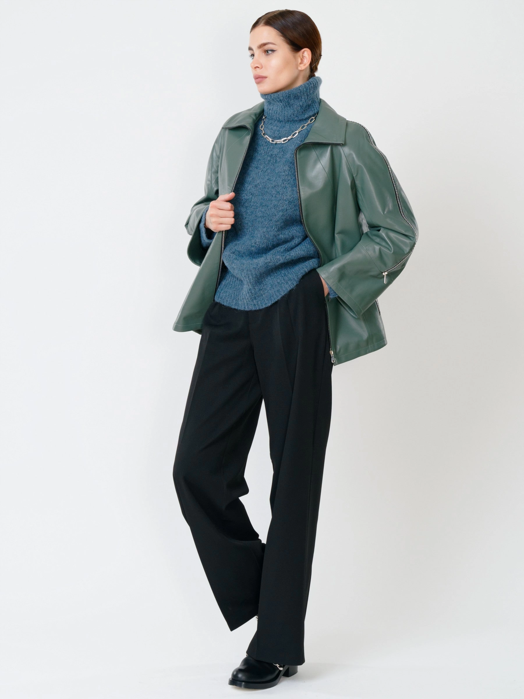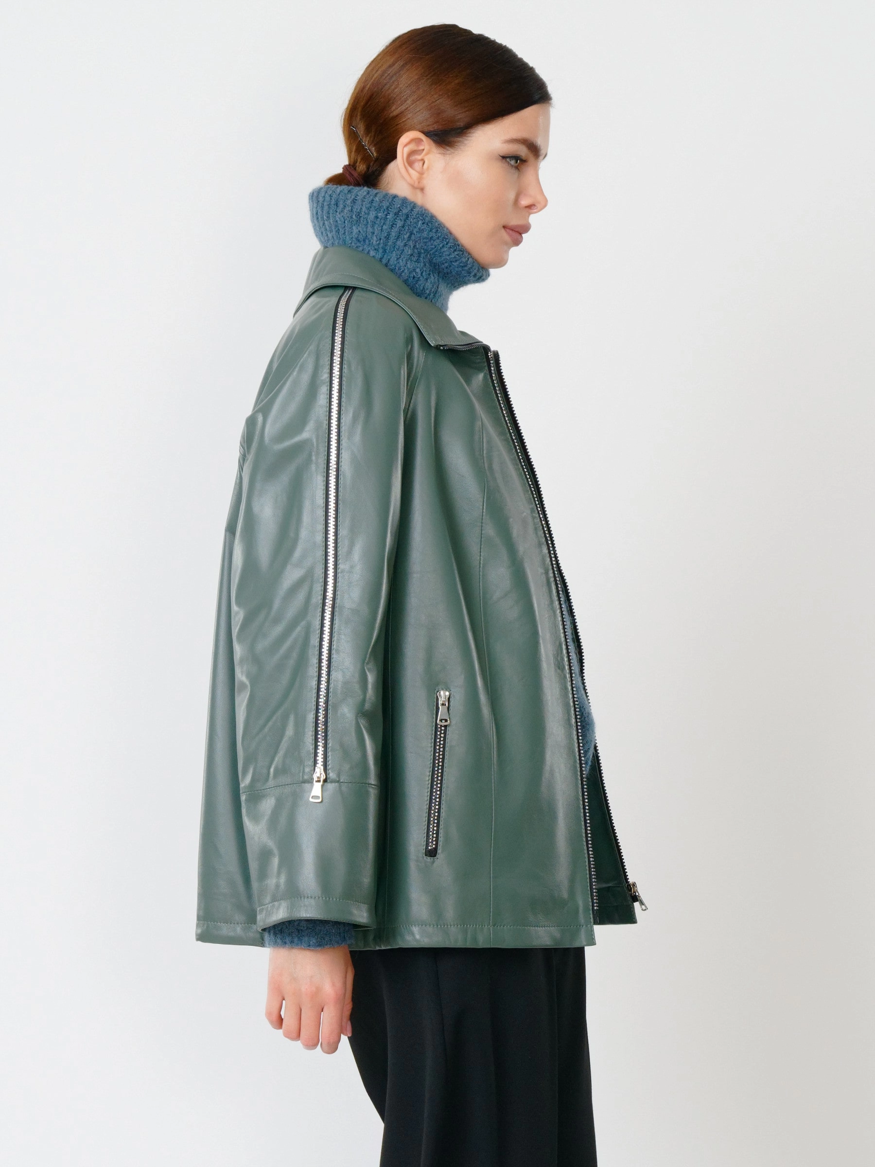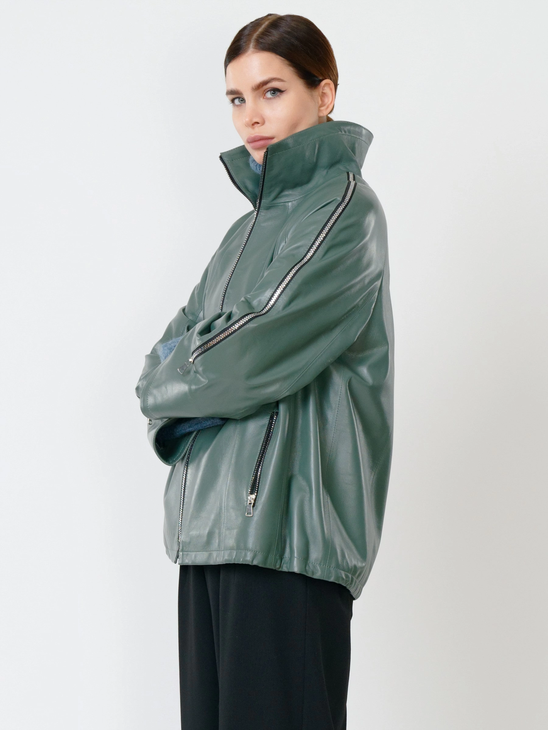 Стильная куртка оверсайз из натуральной кожи на молнии с свободным силуэтом и длиной 65 см. Модель премиум-класса с трансформирующимся воротником-стойкой, рукавом реглан и манжетами-отворотами для регулировки длины. Функциональность подчеркивают боковые карманы и высокая застежка, защищающая от ветра. Лаконичный дерзкий образ дополнит пара с худи и кедами для повседневной стилизации или с узкими джинсами для создания контрастного силуэта.