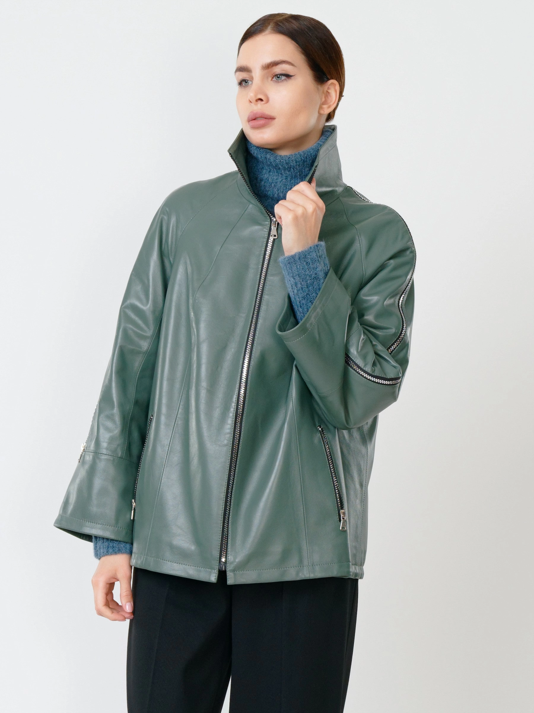 Кожаная женская куртка оверсайз 385, оливковая, размер 50, артикул 90860