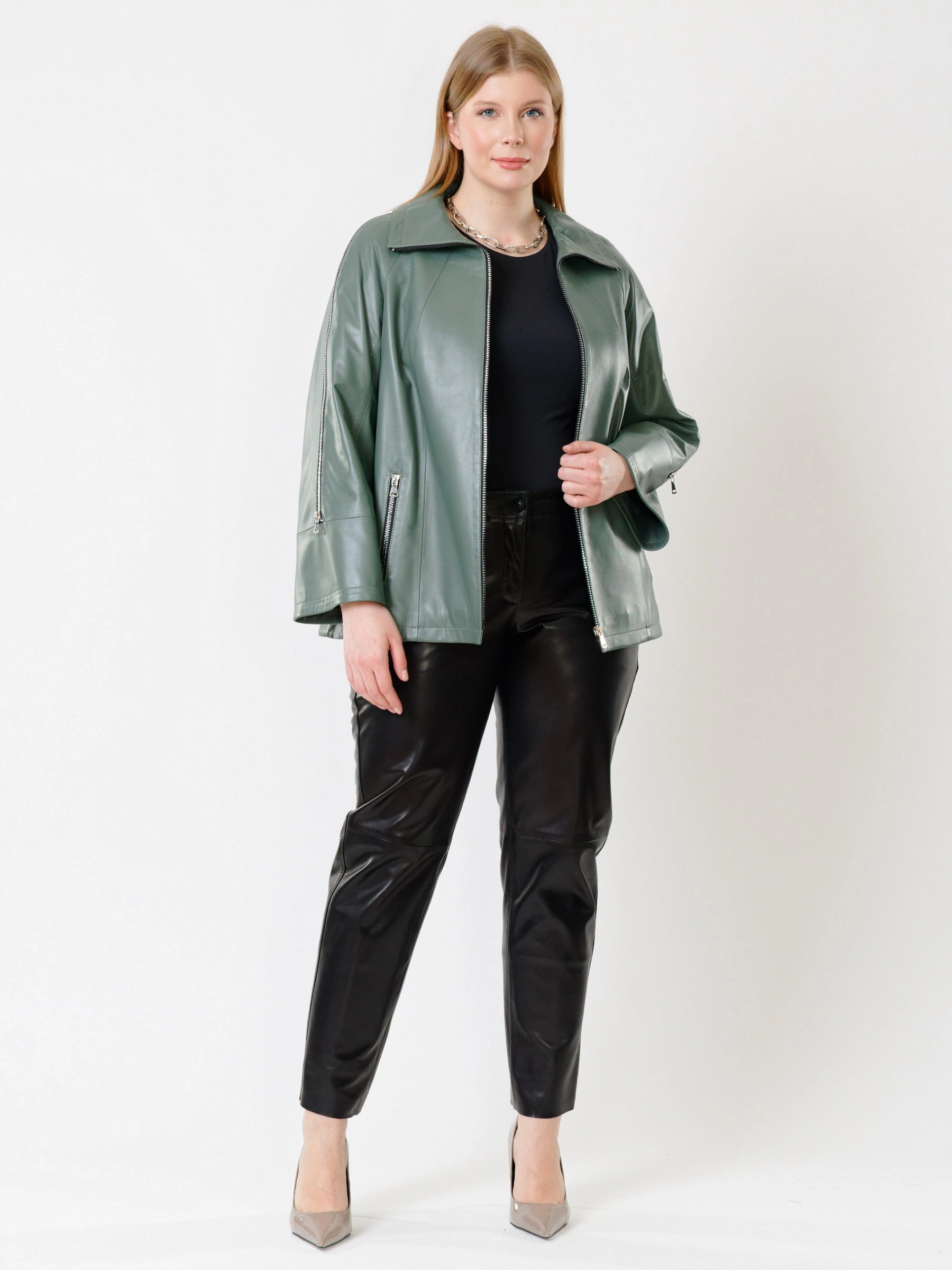 Кожаная женская куртка оверсайз 385, оливковая, размер 50, артикул 91321