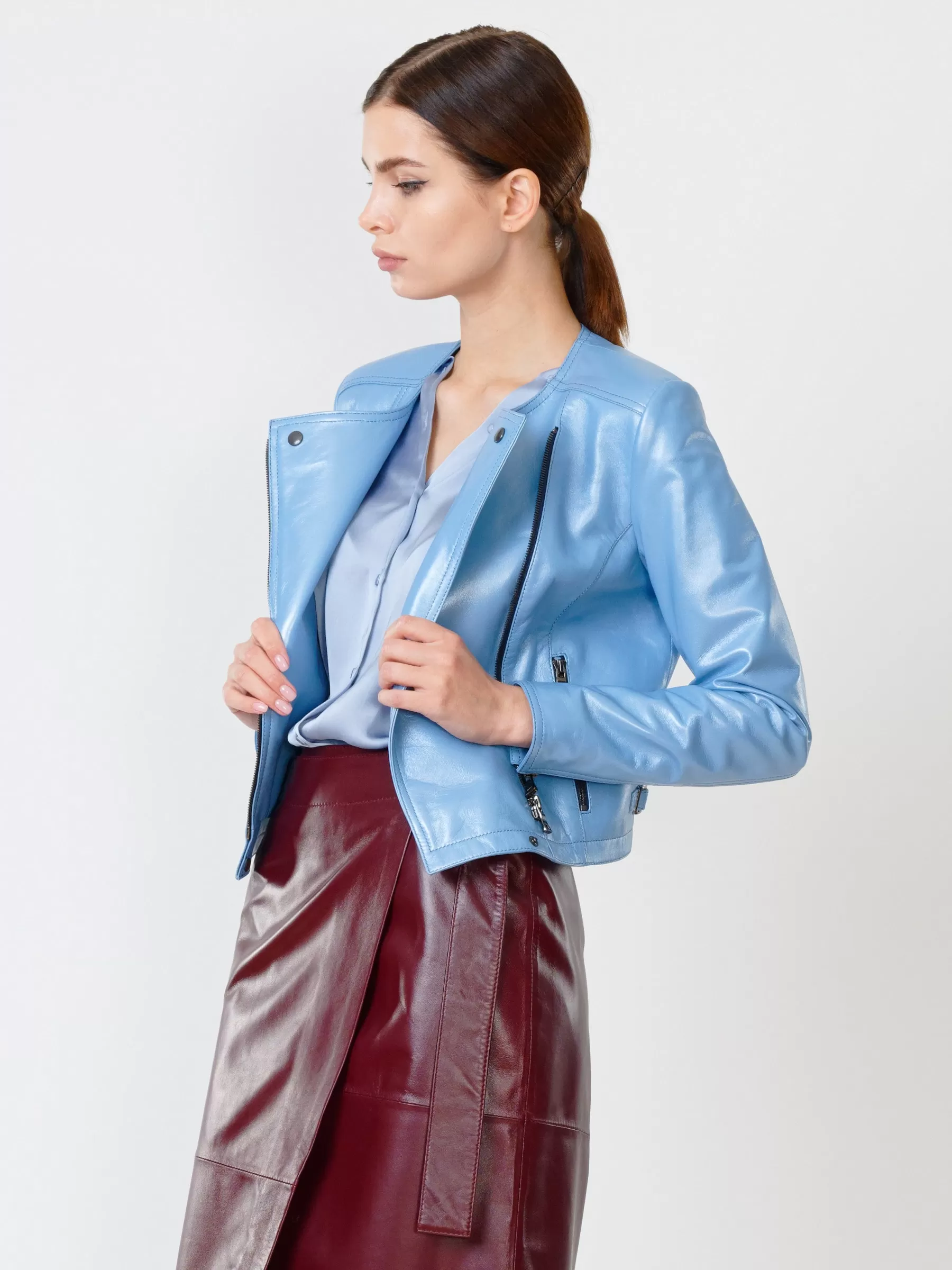 Товар кожаная женская куртка косуха 389, голубая, размер 44, артикул 91510 выполнен из натуральной кожи с застежкой молния. Рассчитан на сезон: весна-лето. Длина изделия 45 см, силуэт полуприлегающий.
