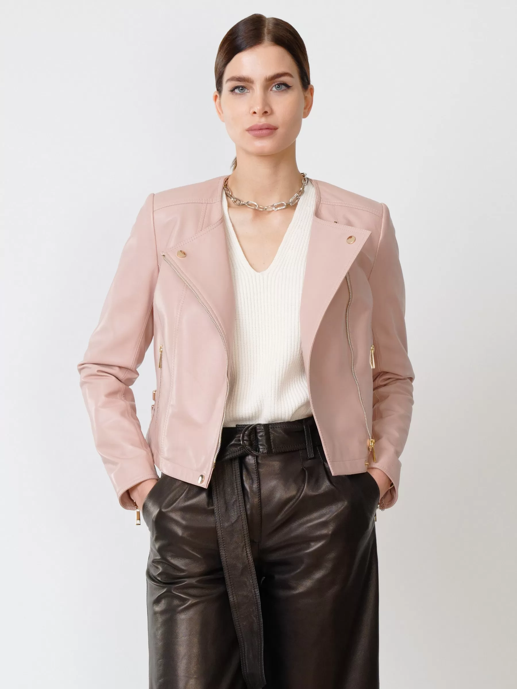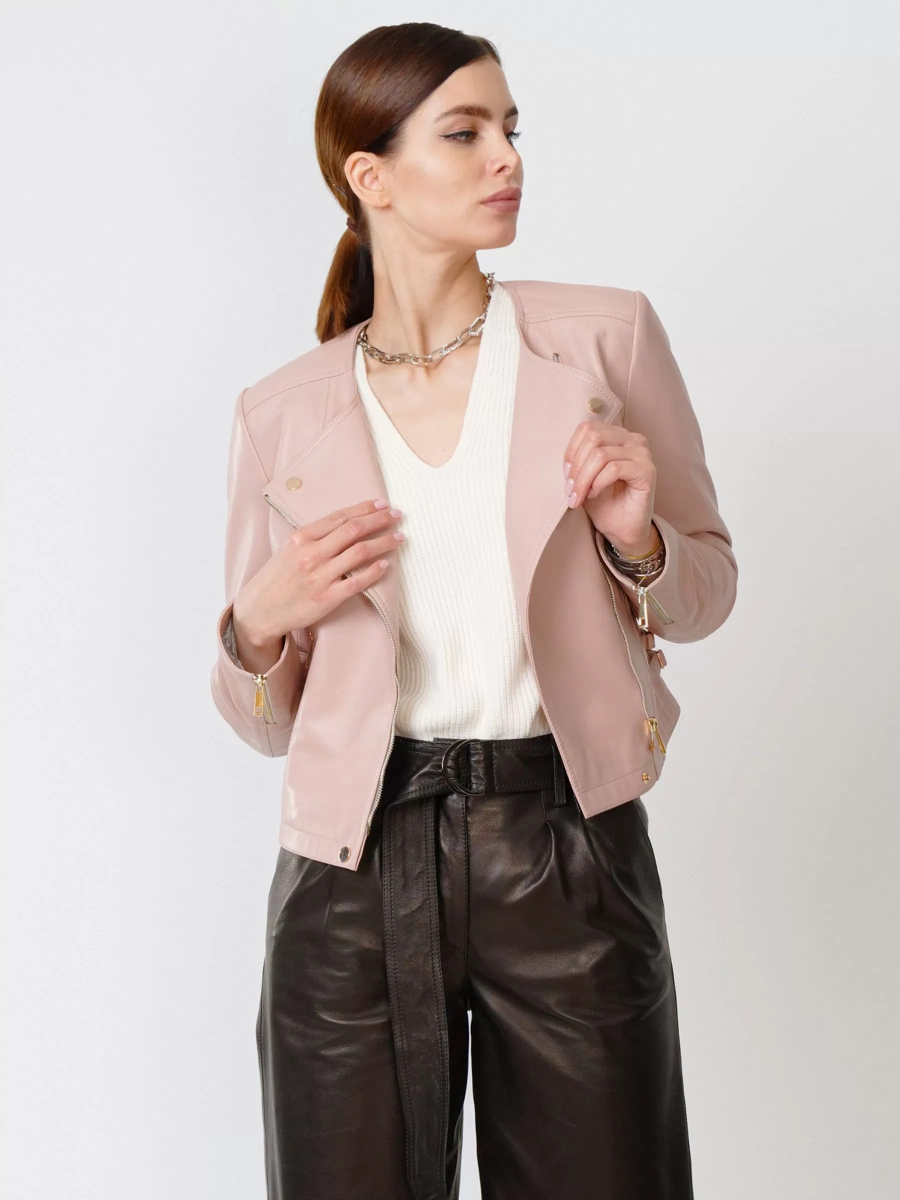 Кожаная женская куртка косуха 389, пудровая, размер 44, артикул 90910