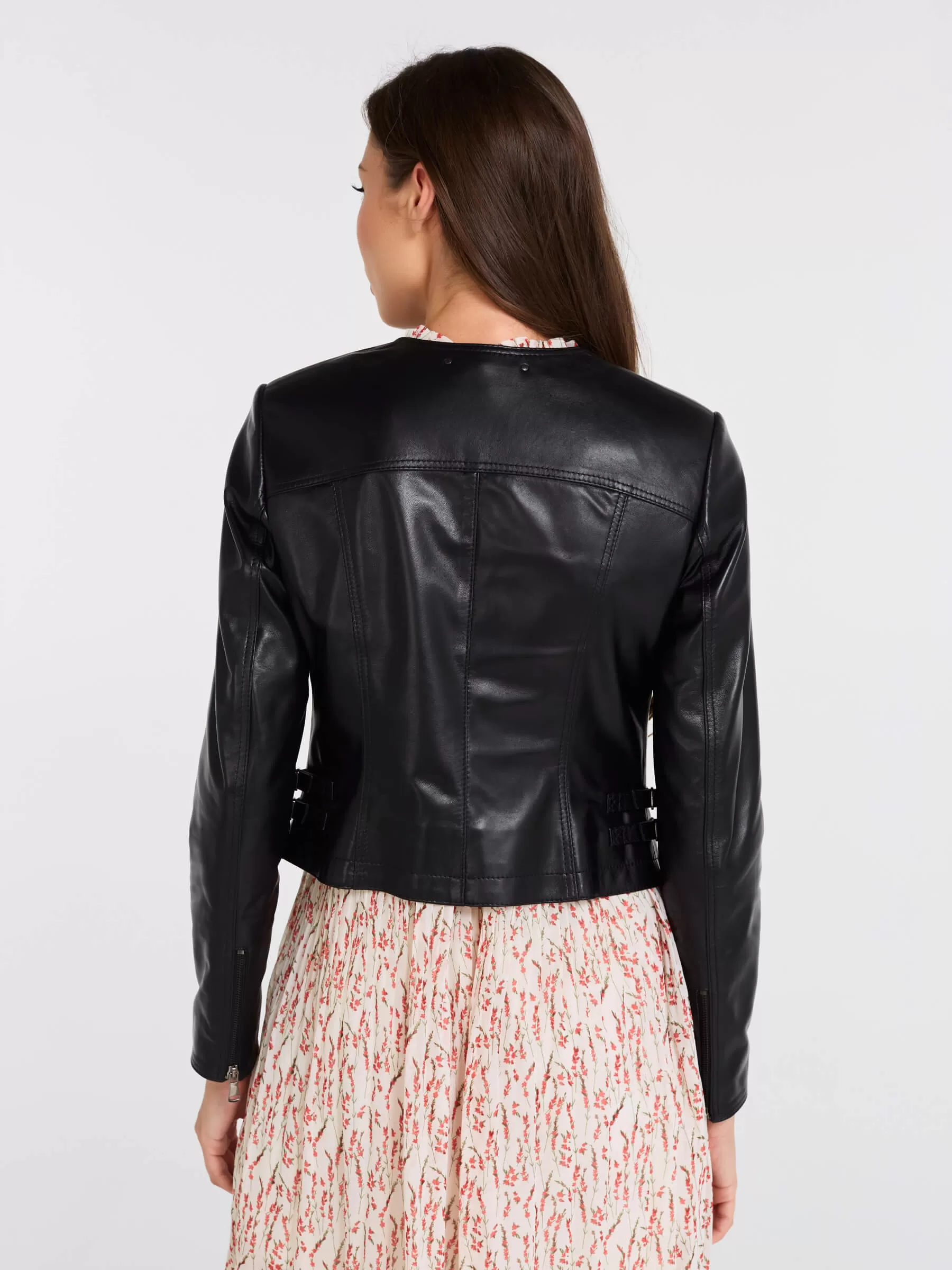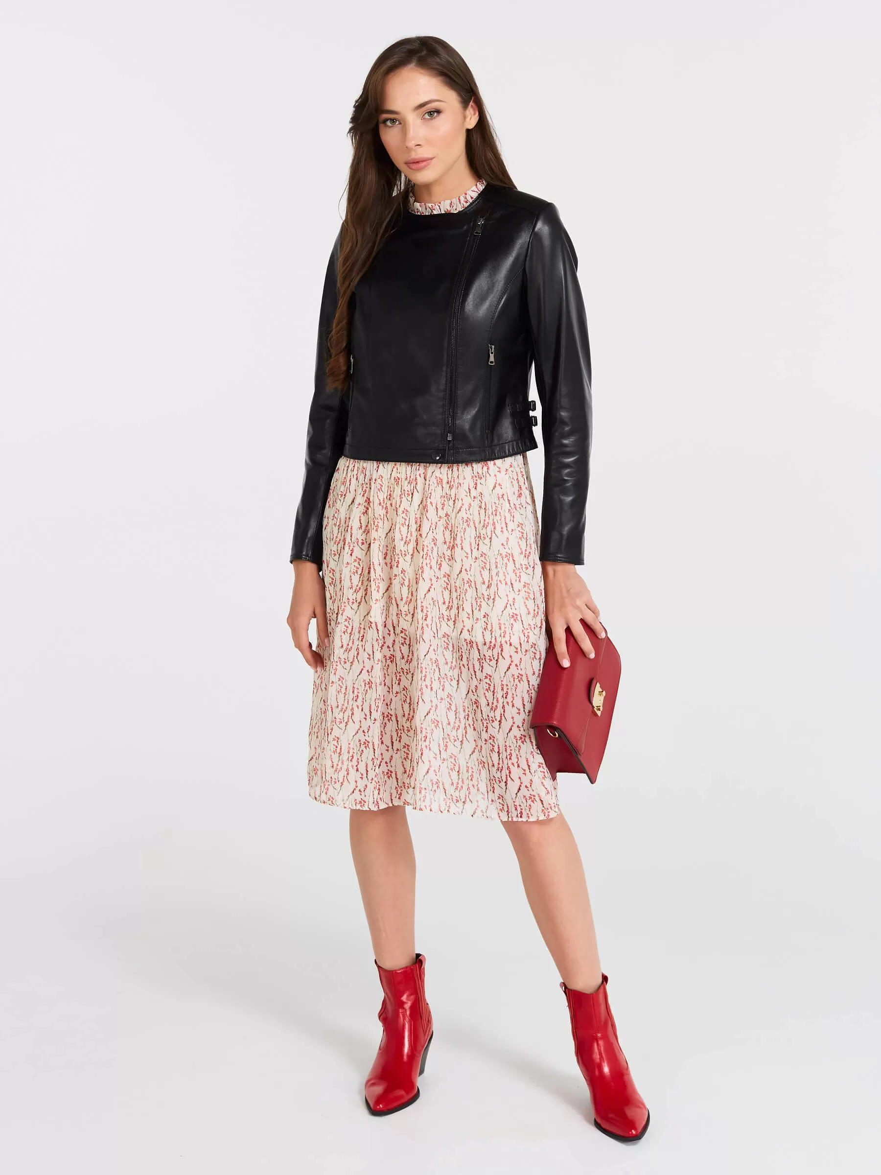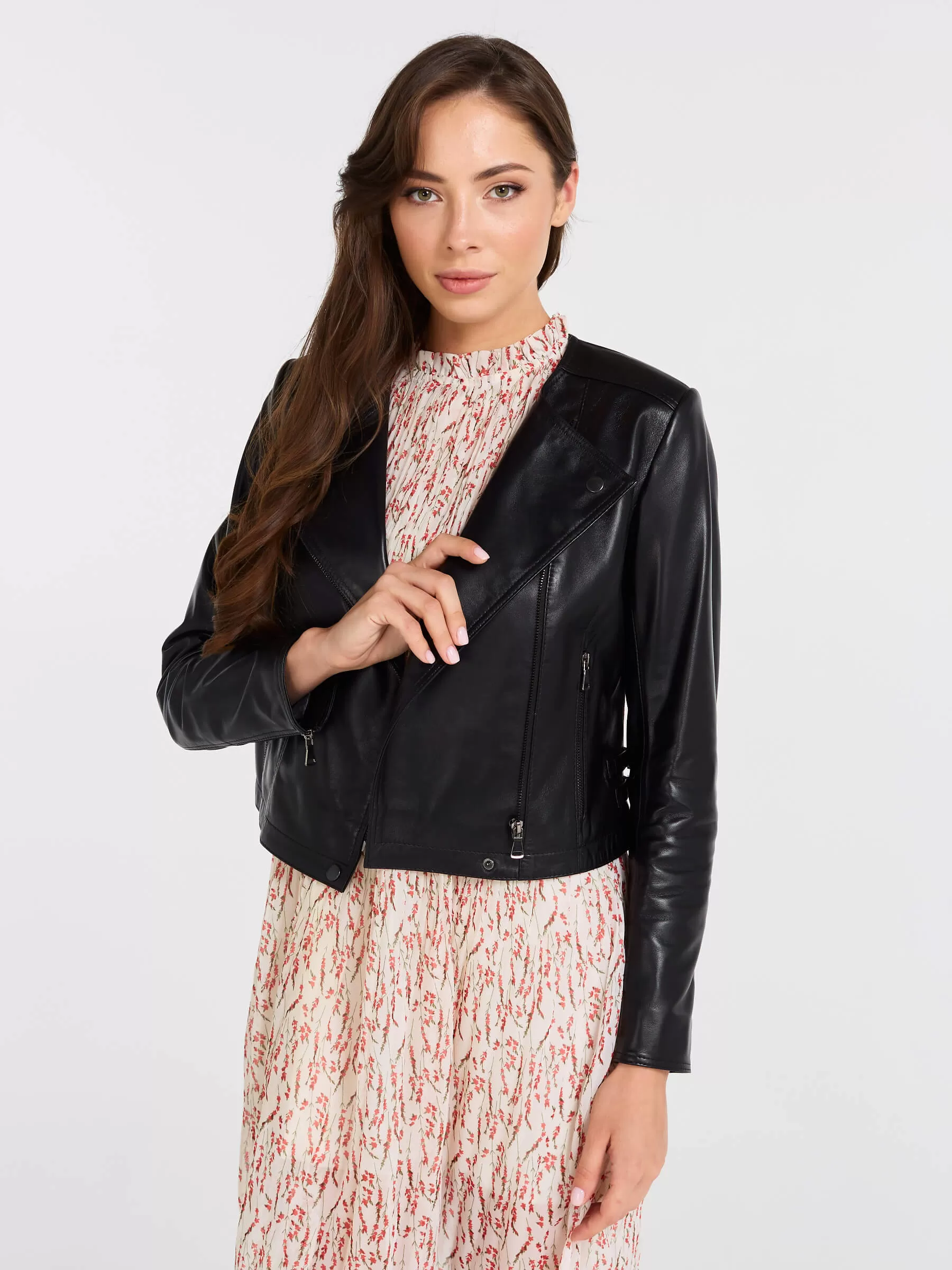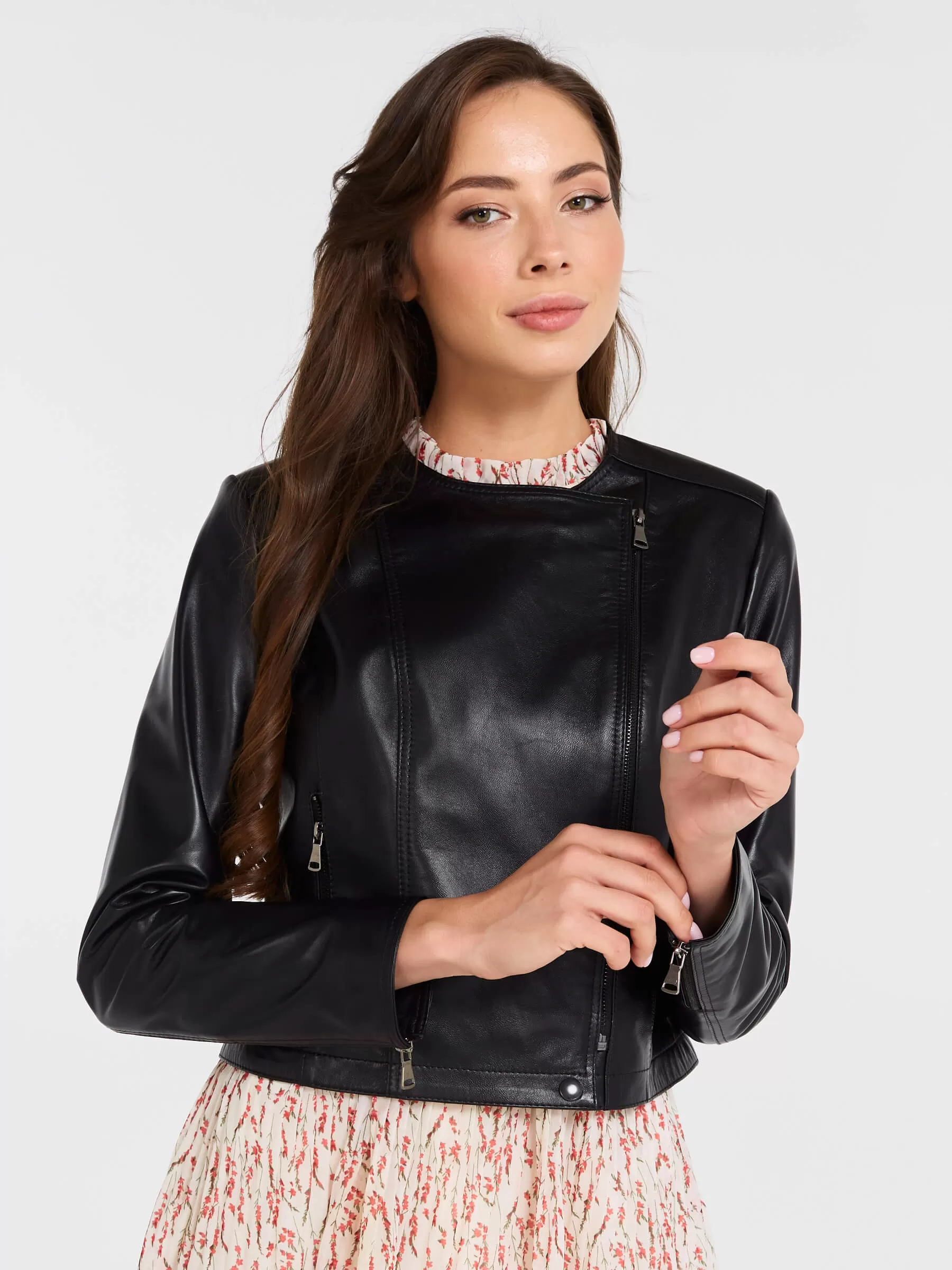 Эта женская косуха из мягчайшей натуральной кожи PrimoVello — воплощение дерзкого шика: полуприлегающий силуэт на молнии без воротника идеально сидит благодаря регулируемым боковым патам, подчеркивающим фигуру. Втачной рукав и безупречная конструкция гарантируют комфорт и премиальное качество. Универсальный must-have для смелых образов — носите с черной водолазкой, рваными джинсами и кедами для повседневного бунтарства или с кожаной юбкой-миди и ботфортами для вечерного драйва.