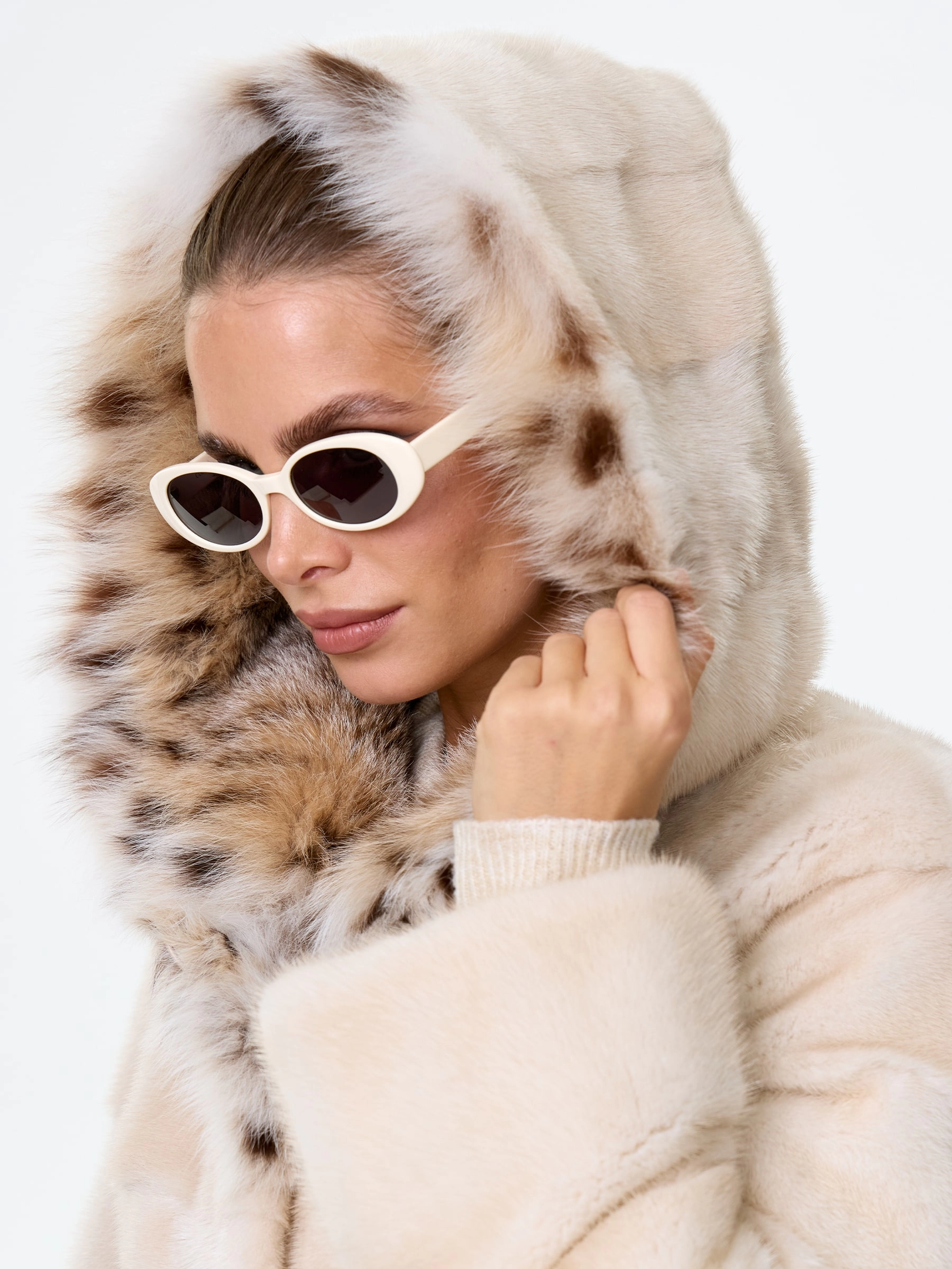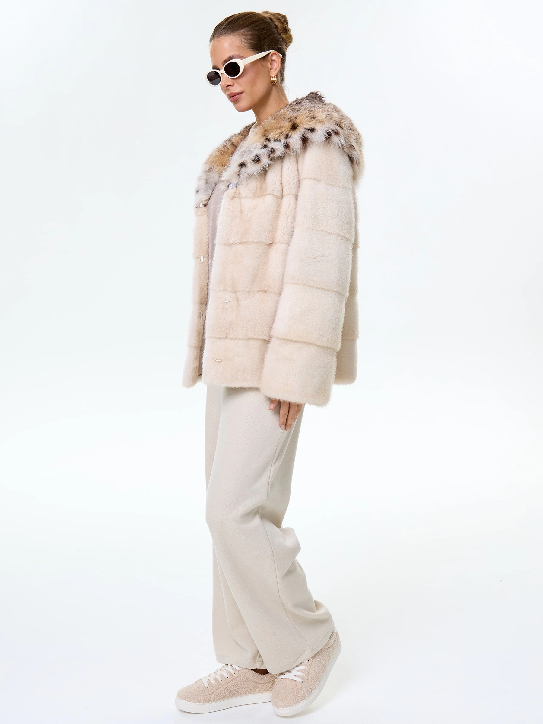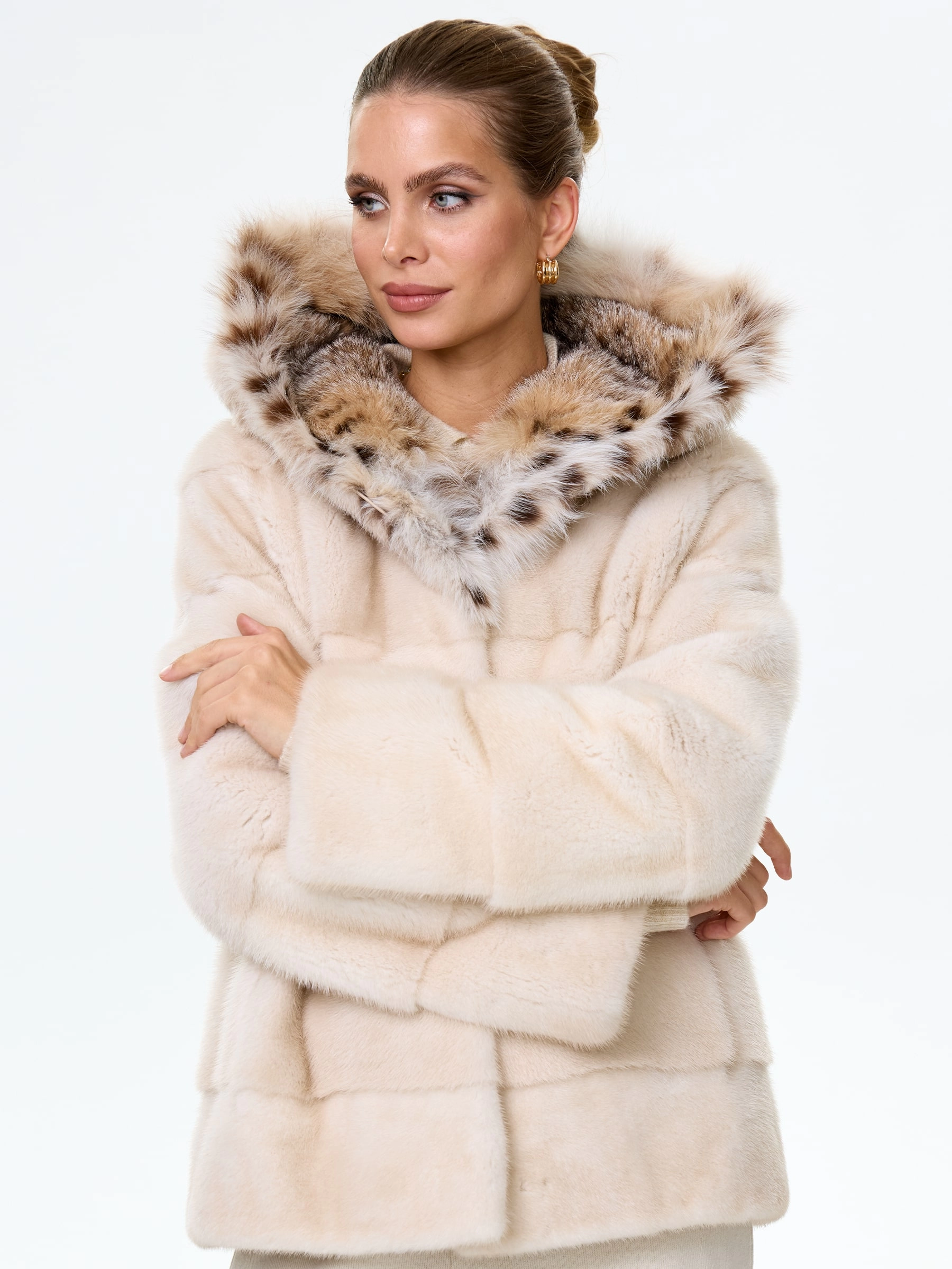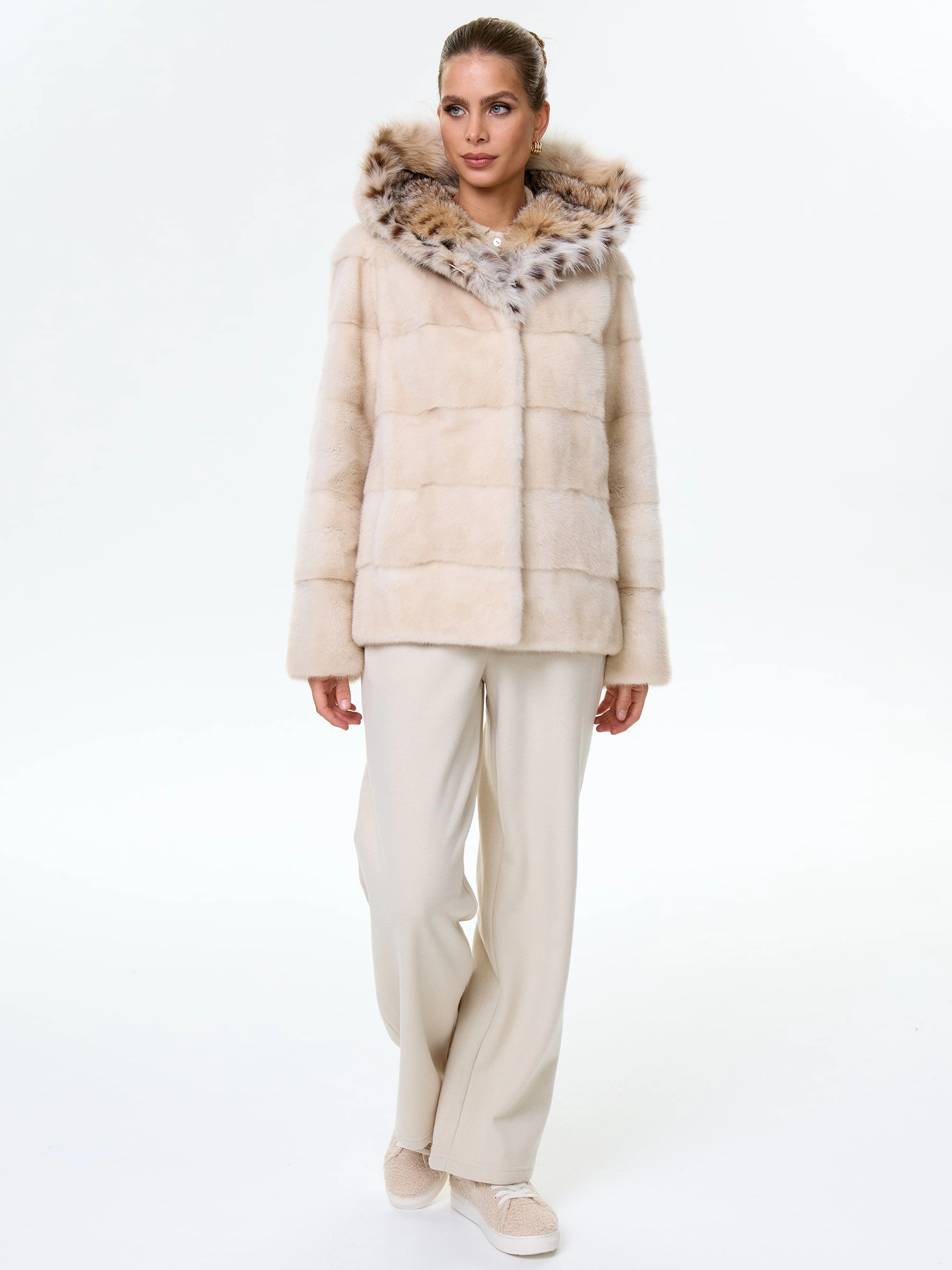 Куртка женская с капюшоном из меха норки и отделкой рысевидной кошкой Юля(к), жемчужная, размер 48, артикул 34140