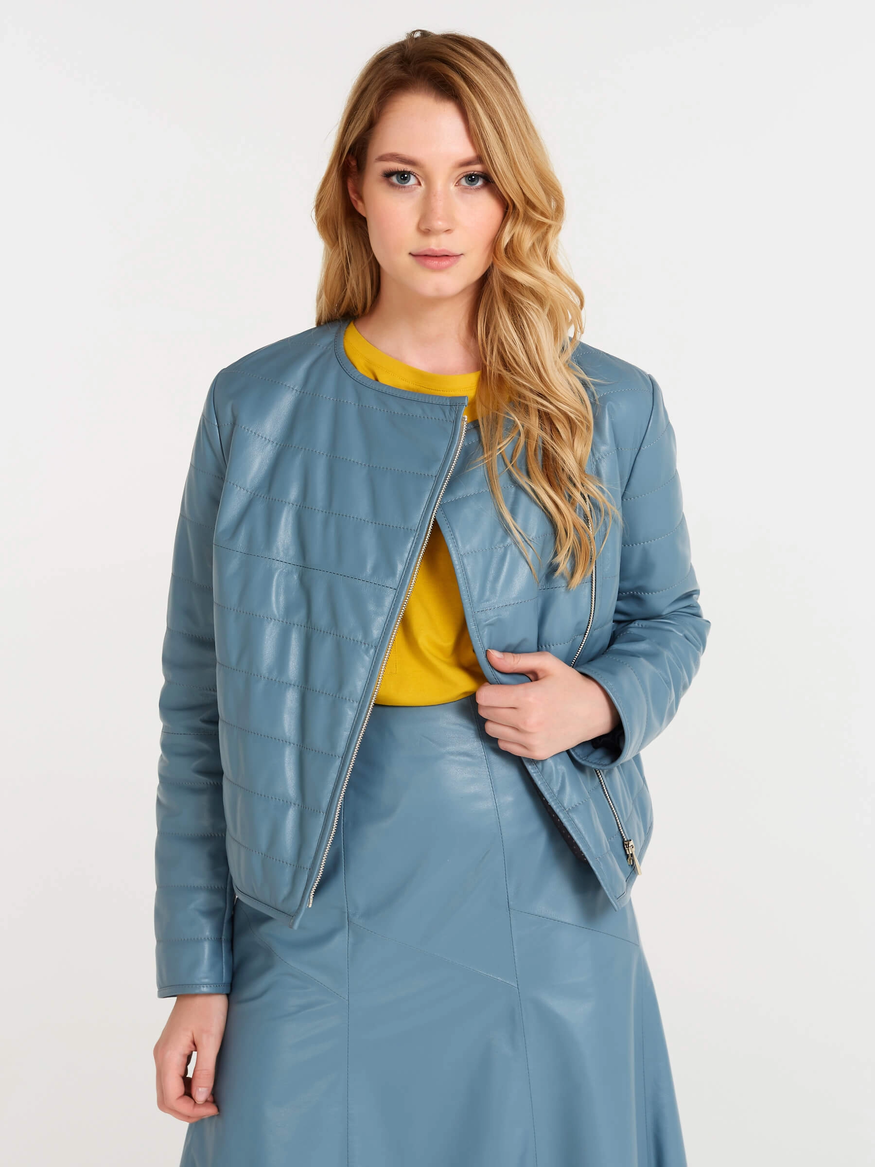 Утепленная кожаная женская косуха без воротника 306, голубая, размер 46, артикул 23610