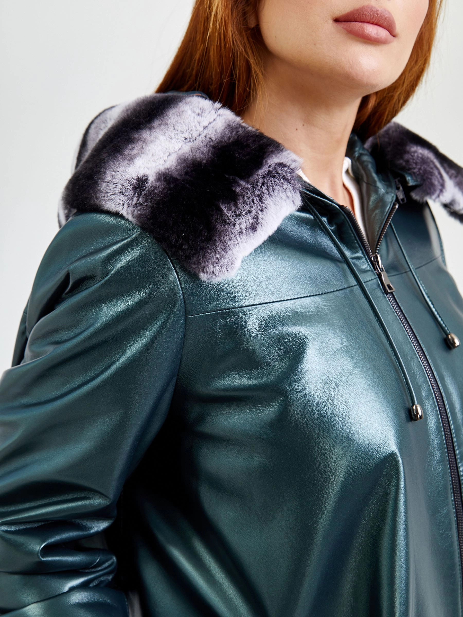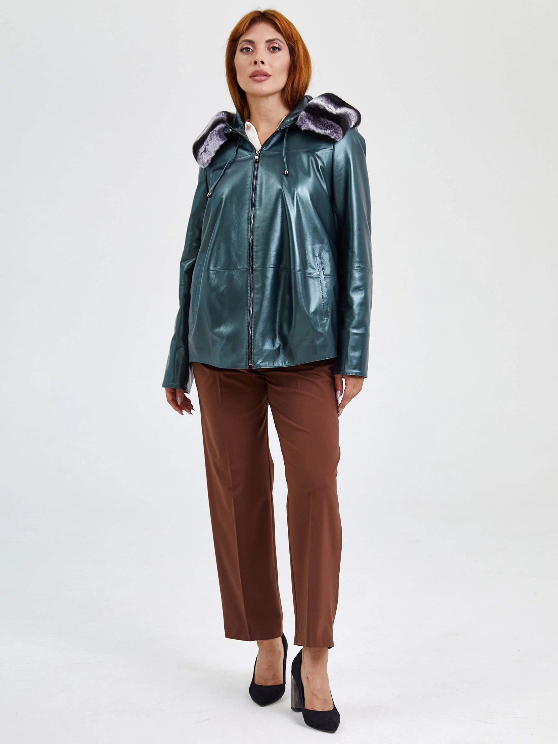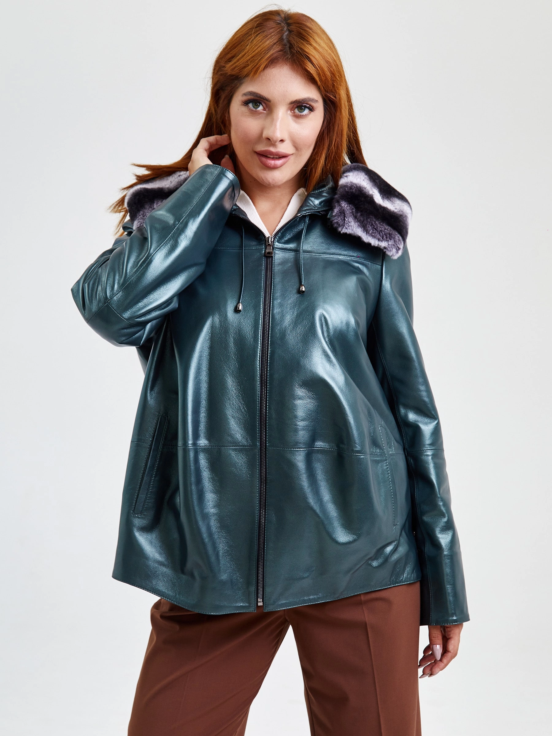 Кожаная женская куртка с капюшоном и мехом "рекса" 308уш, зеленый, размер 56, артикул 91751