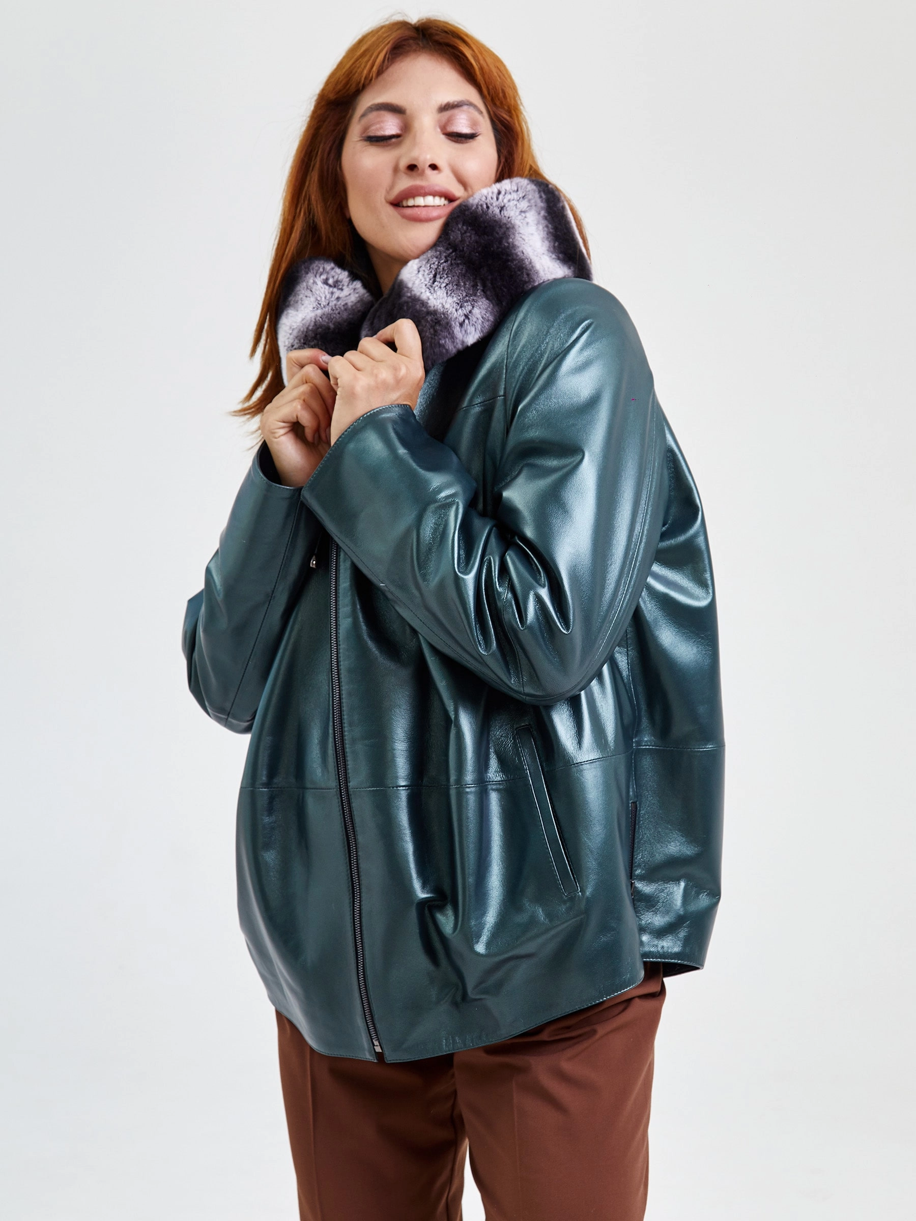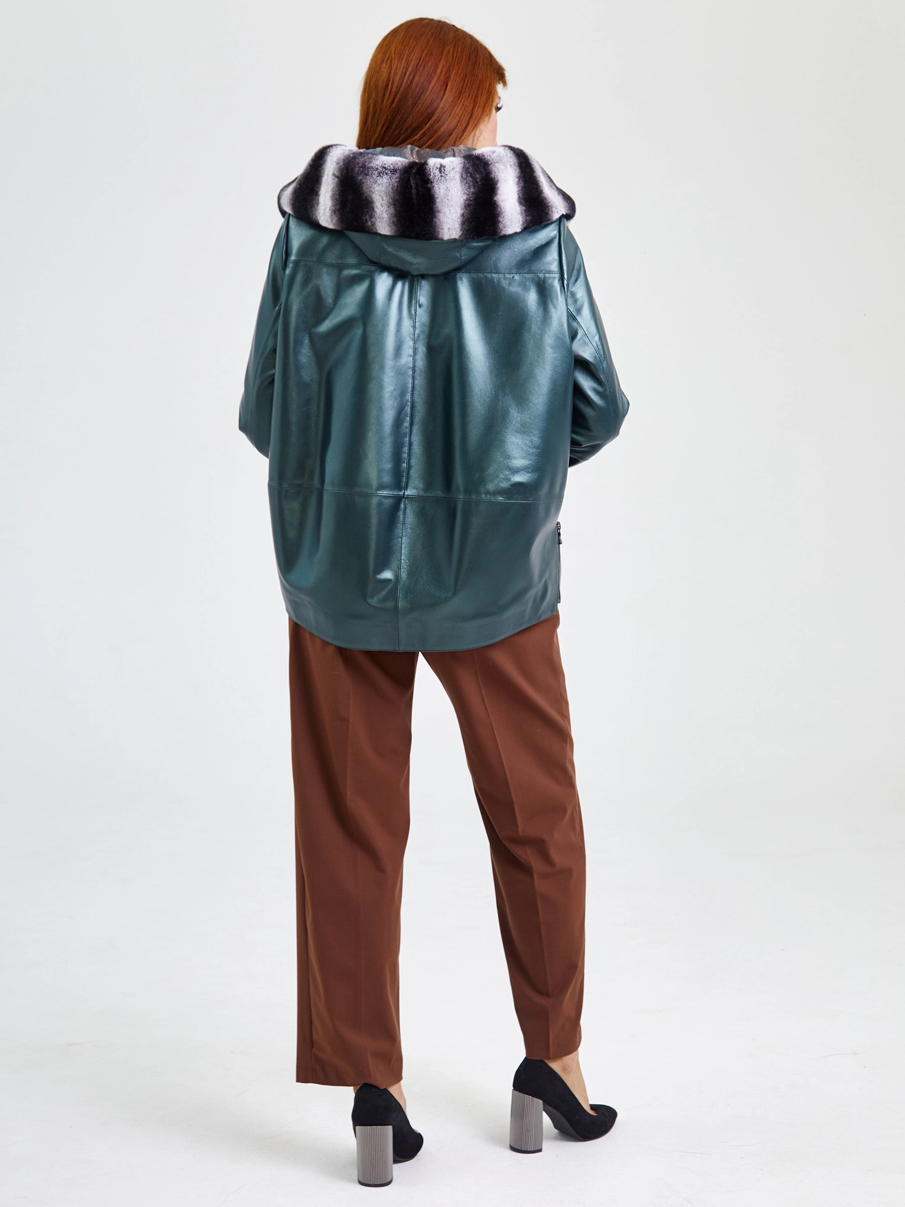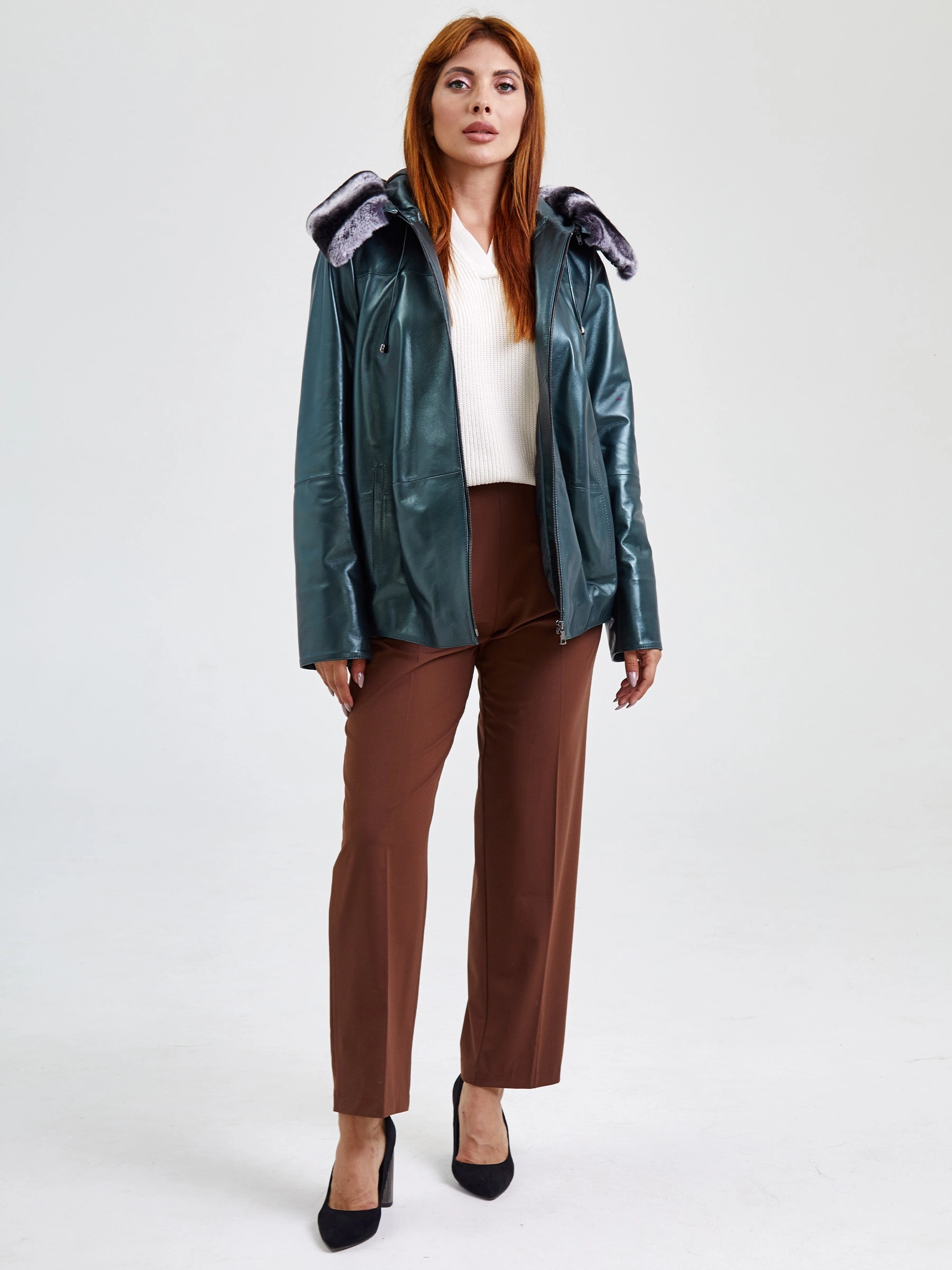 Кожаная женская куртка с капюшоном и мехом "рекса" 308уш, зеленый, размер 56, артикул 91751
