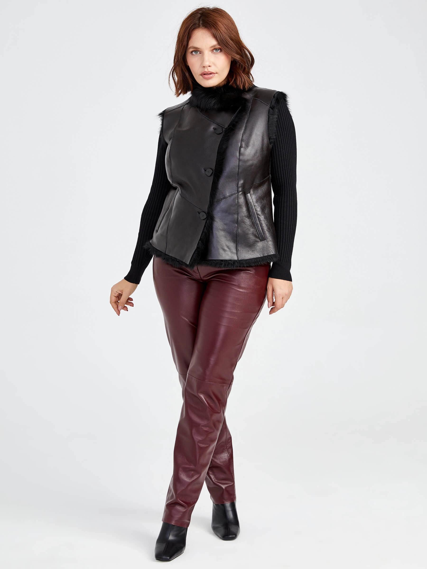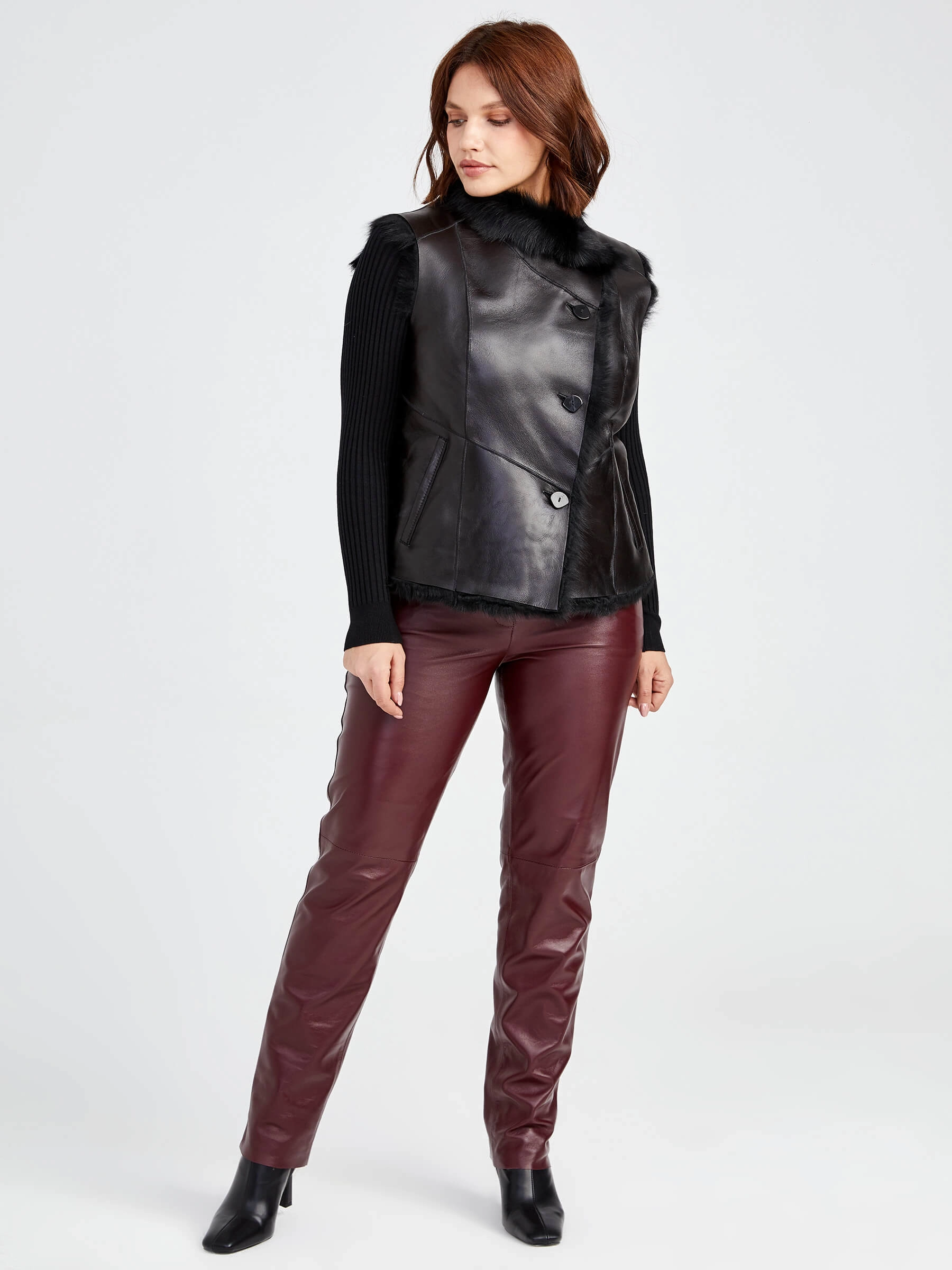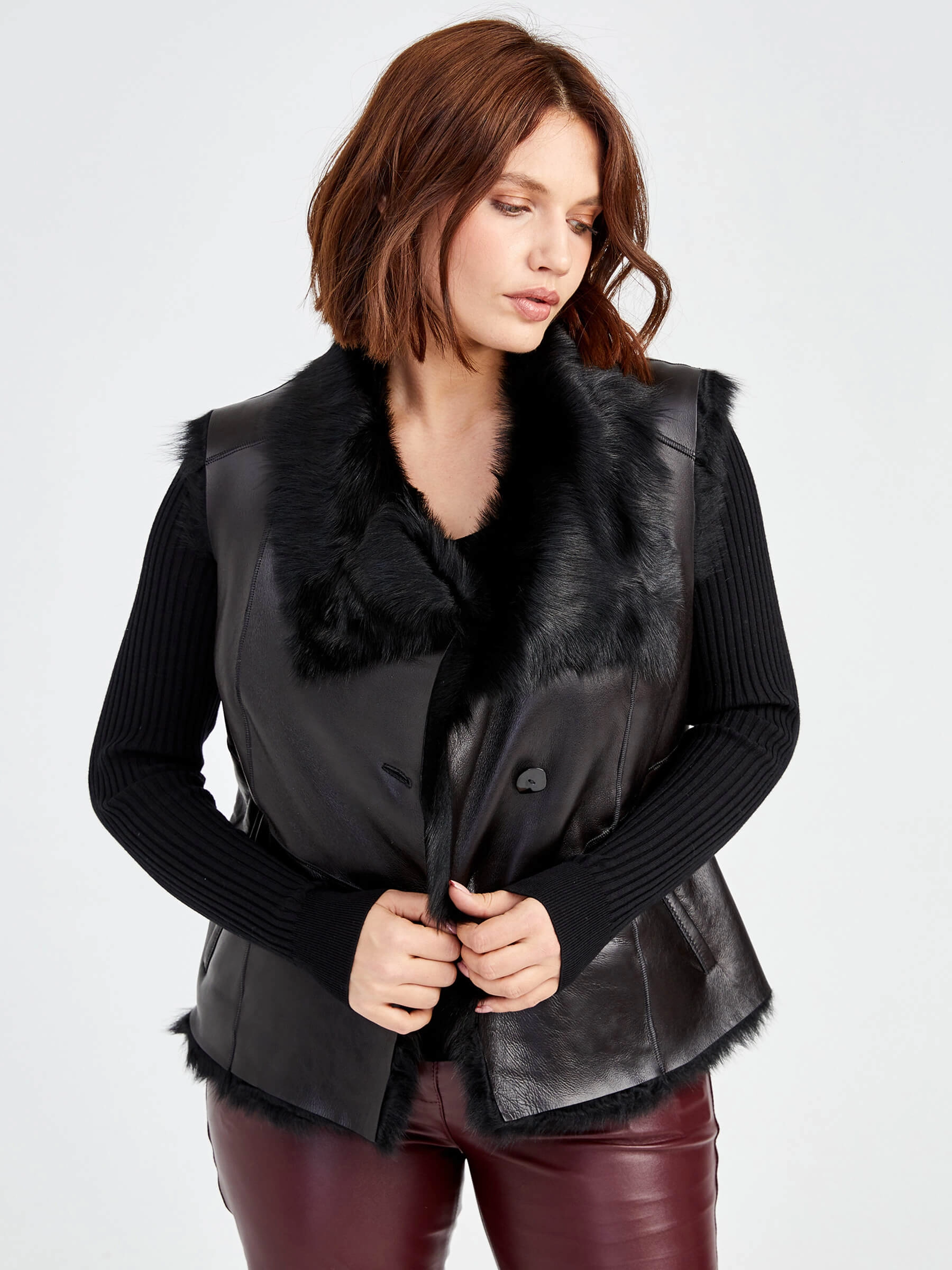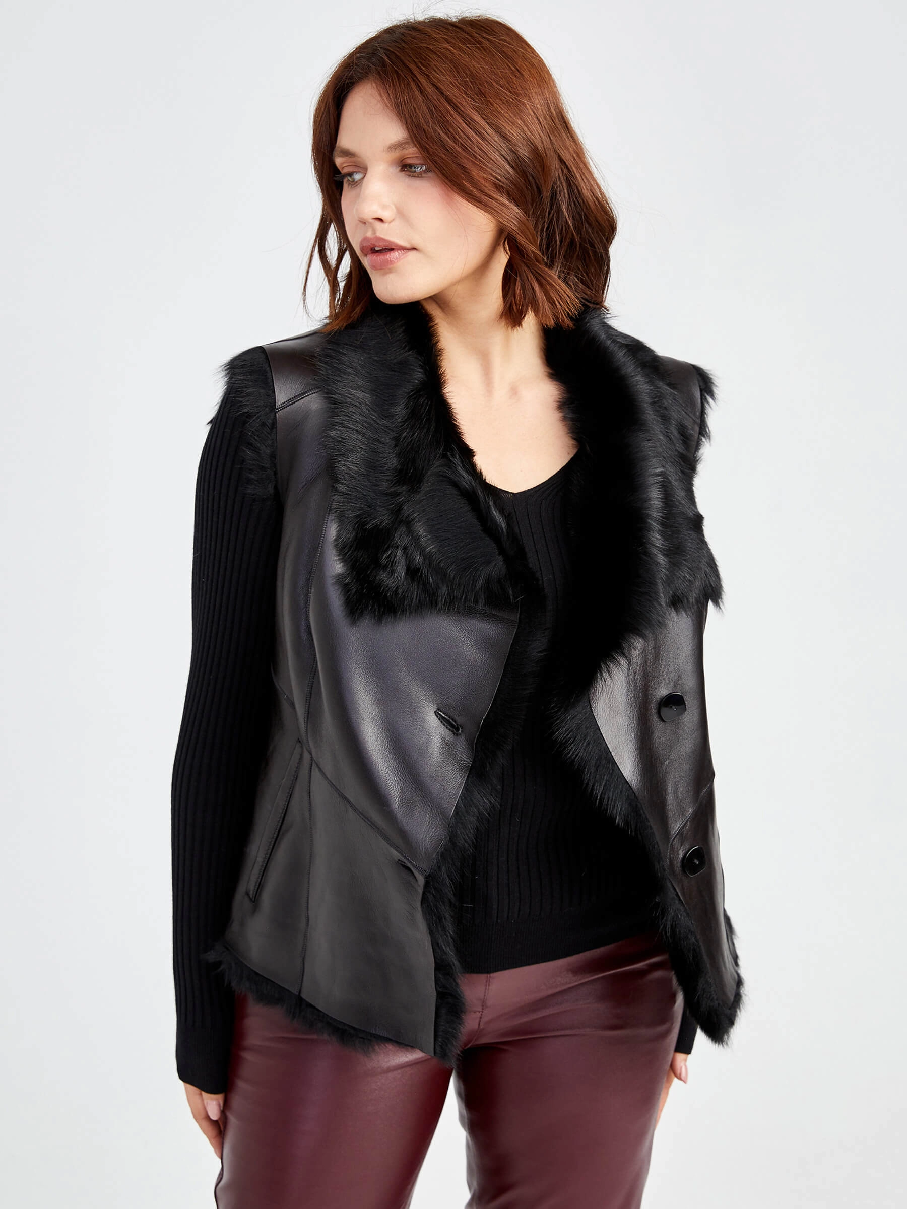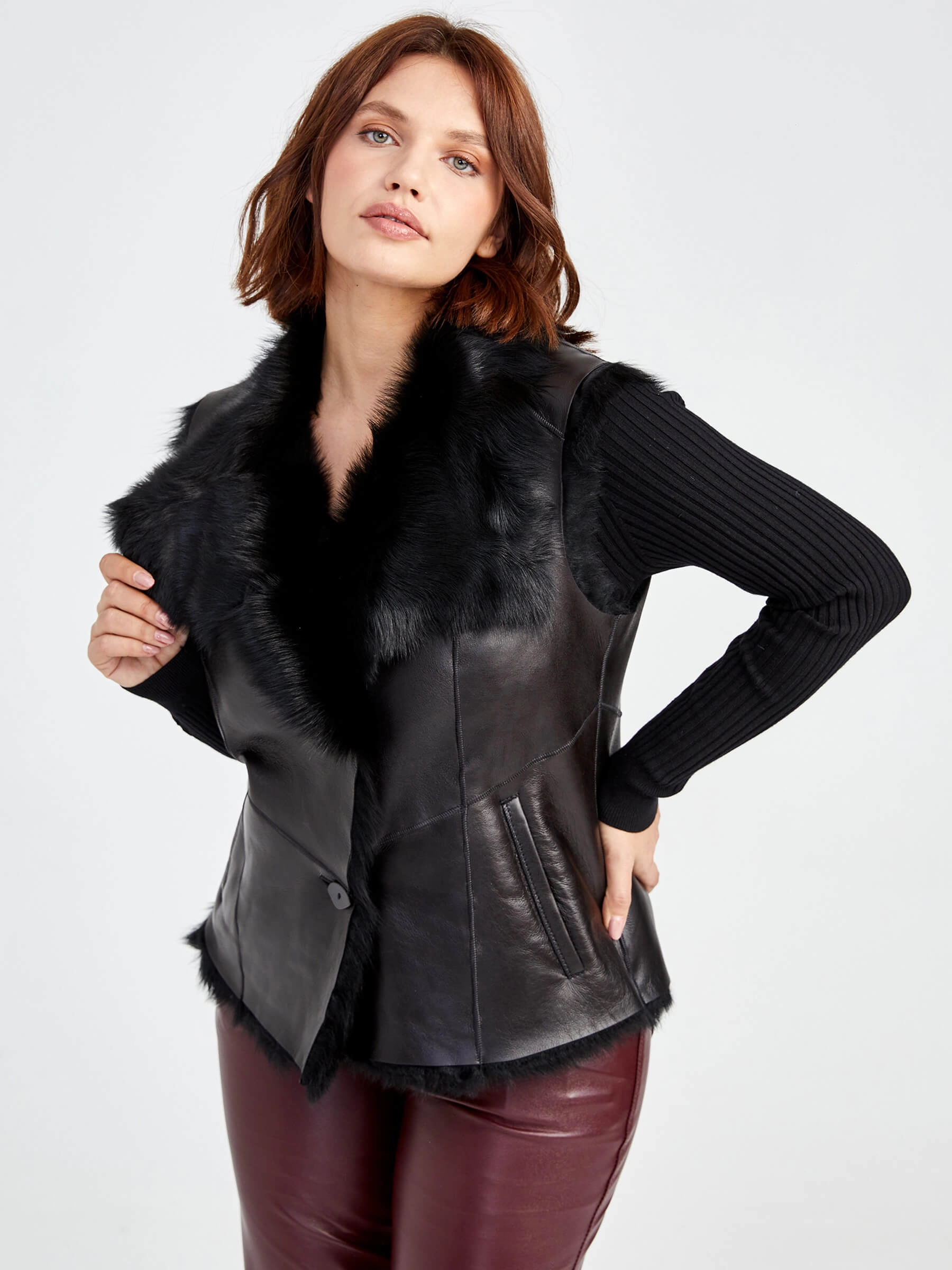 Женский меховой жилет из тосканской овчины. Элегантная модель из мягкой овчины с полуприлегающим силуэтом и регулируемой длиной 51-74 см. Застёжка на пуговицах и отложной воротник создают универсальный образ, а качественная отделка подчёркивает натуральную текстуру меха. Идеален для повседневной носки — сочетайте с водолазками и джинсами для городского стиля или с платьями для элегантного образа.