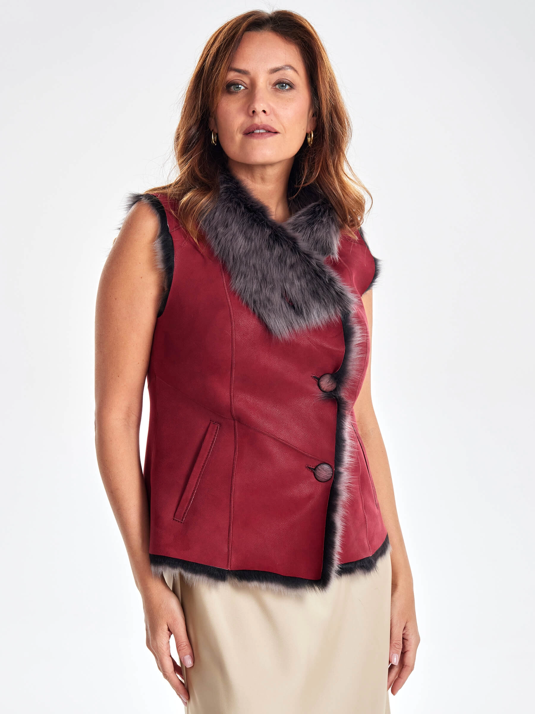 Товар меховой жилет из тосканы премиум класса для женщин 06, красный, размер 46, артикул 62430 выполнен из овчина "тоскана" с застежкой пуговицы. Рассчитан на сезон: осень-зима. Длина изделия 51-74 см, силуэт полуприлегающий.