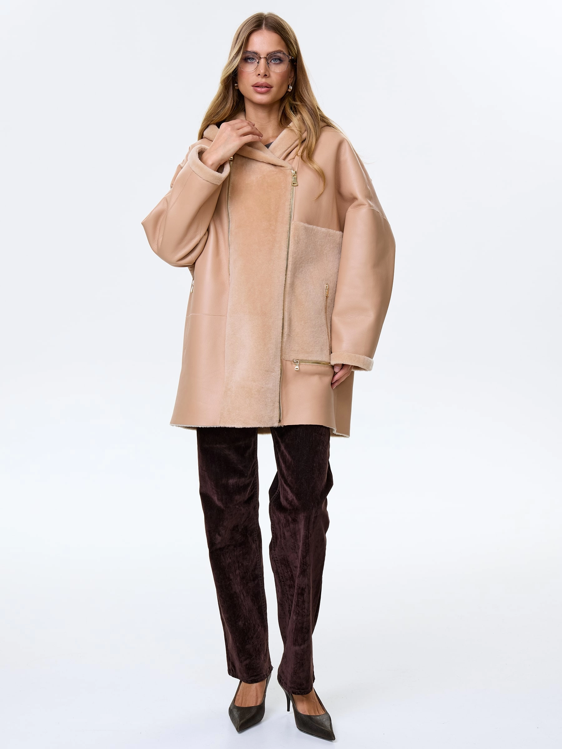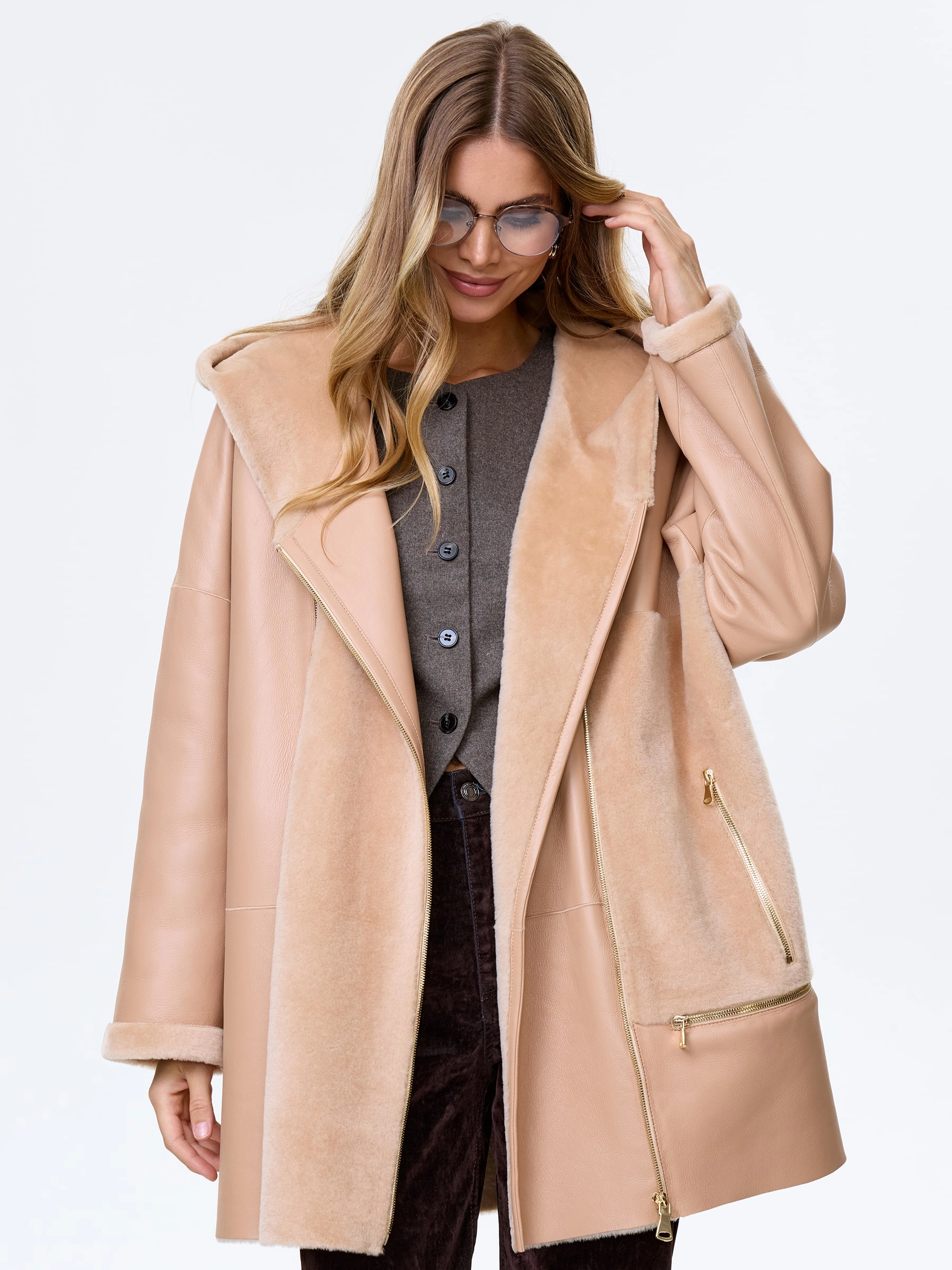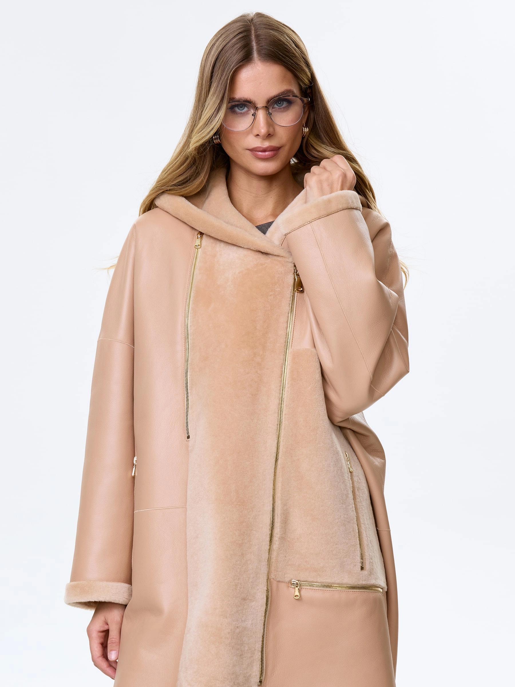 Молодежное комбинированное женское полупальто из овчины премиум-класса с капюшоном нежного бежевого цвета — идеальный выбор для тех, кто ценит современный стиль и абсолютный комфорт: короткую модель длиной 81 см выполнили из мягкой овчины «мерино» в эффектной комбинации с гладкой поверхностью, создавая выразительную игру фактур, а комфортный свободный крой со спущенным плечом не ограничивает движений и дарит ощущение легкости. Шалевидный объемный несъемный капюшон позволяет в холодную погоду обойтись без головного убора, надежно защищая от ветра, а боковые карманы, как и само изделие, застегиваются крупными молниями, подчеркивая современный функциональный стиль и добавляя брутальный акцент; отсутствие подкладки сохраняет естественную структуру натурального меха. Совет стилиста: укороченная длина и объемный силуэт идеально работают в многослойных молодежных образах — носите это полупальто поверх длинных свитеров оверсайз, худи или с высокими джинсами и грубыми ботинками, позволяя крупным молниям стать главным