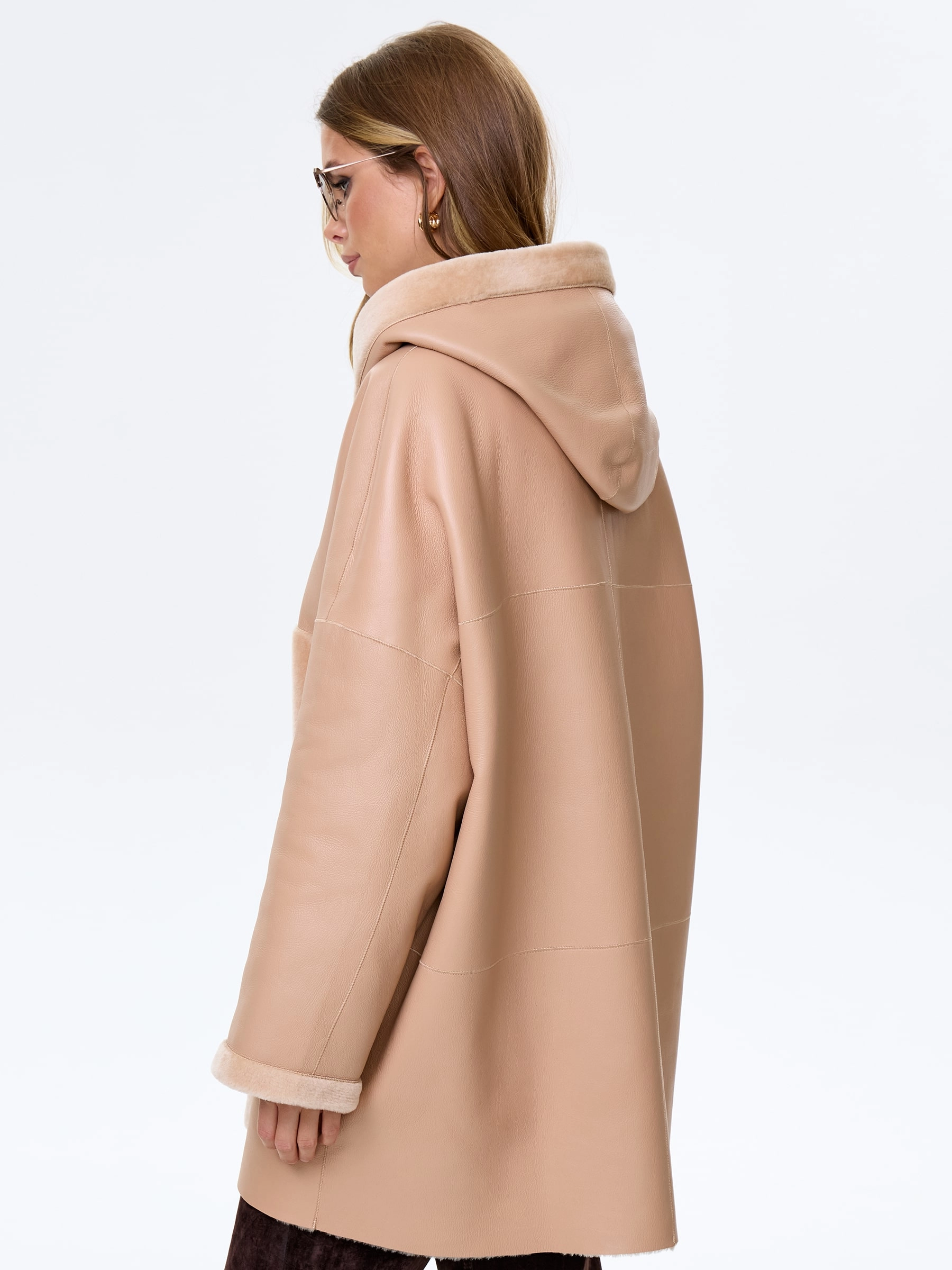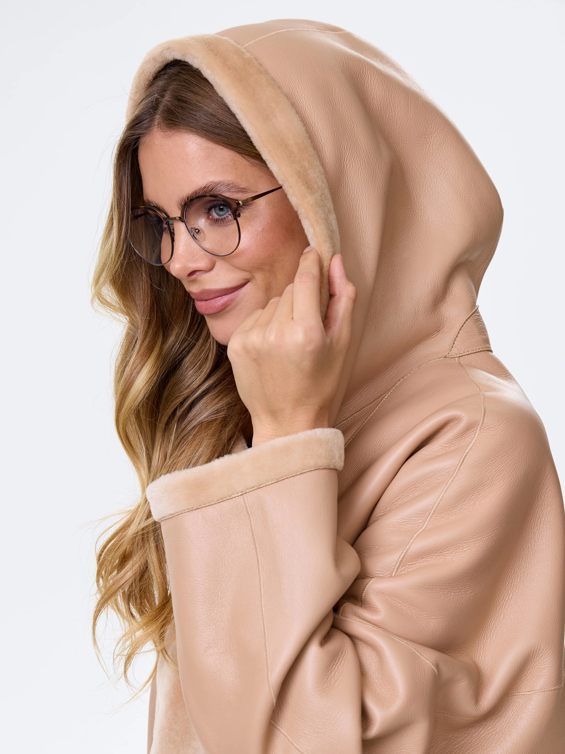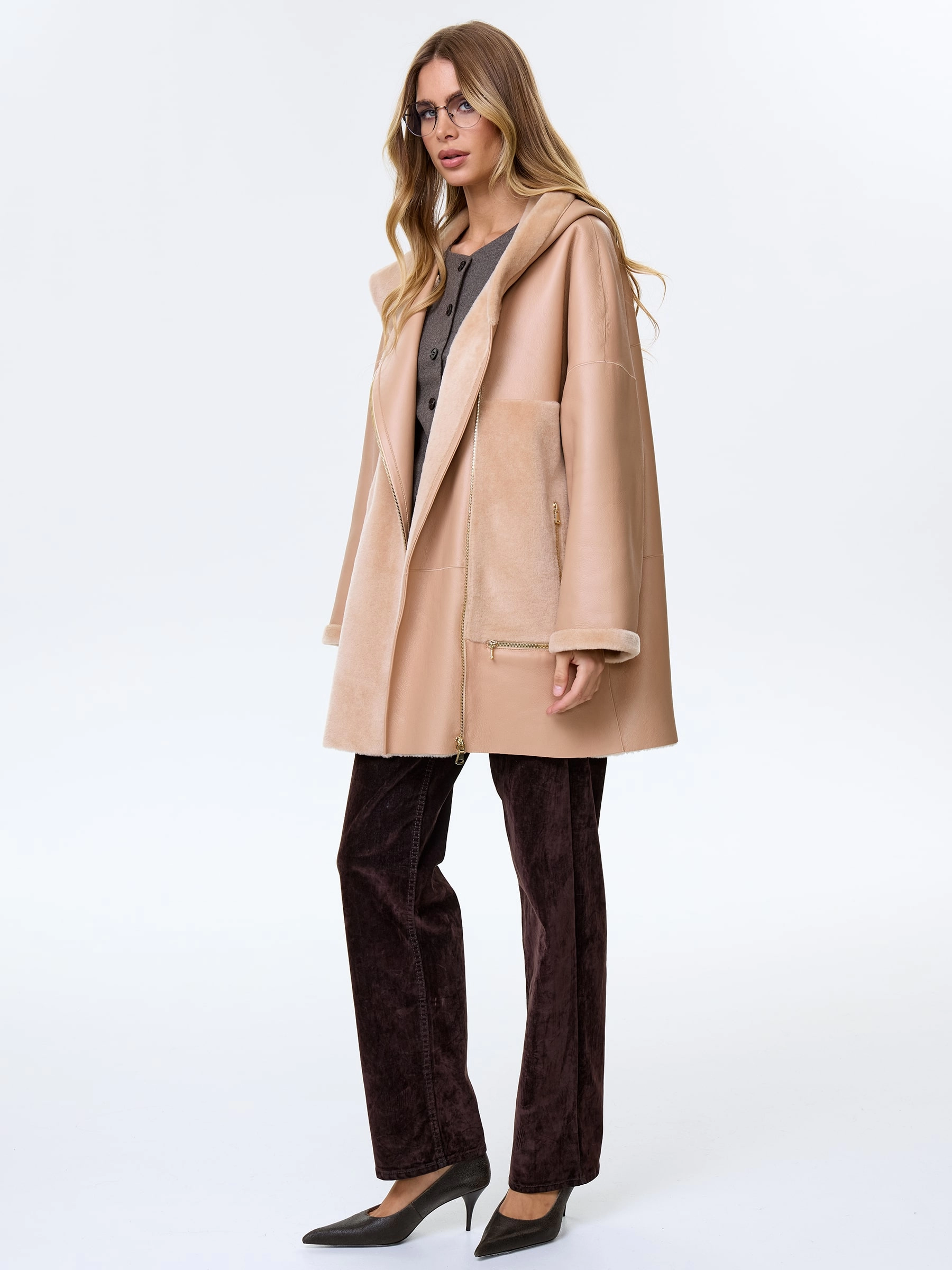 Молодежное комбинированное женское полупальто из овчины премиум-класса с капюшоном нежного бежевого цвета — идеальный выбор для тех, кто ценит современный стиль и абсолютный комфорт: короткую модель длиной 81 см выполнили из мягкой овчины «мерино» в эффектной комбинации с гладкой поверхностью, создавая выразительную игру фактур, а комфортный свободный крой со спущенным плечом не ограничивает движений и дарит ощущение легкости. Шалевидный объемный несъемный капюшон позволяет в холодную погоду обойтись без головного убора, надежно защищая от ветра, а боковые карманы, как и само изделие, застегиваются крупными молниями, подчеркивая современный функциональный стиль и добавляя брутальный акцент; отсутствие подкладки сохраняет естественную структуру натурального меха. Совет стилиста: укороченная длина и объемный силуэт идеально работают в многослойных молодежных образах — носите это полупальто поверх длинных свитеров оверсайз, худи или с высокими джинсами и грубыми ботинками, позволяя крупным молниям стать главным