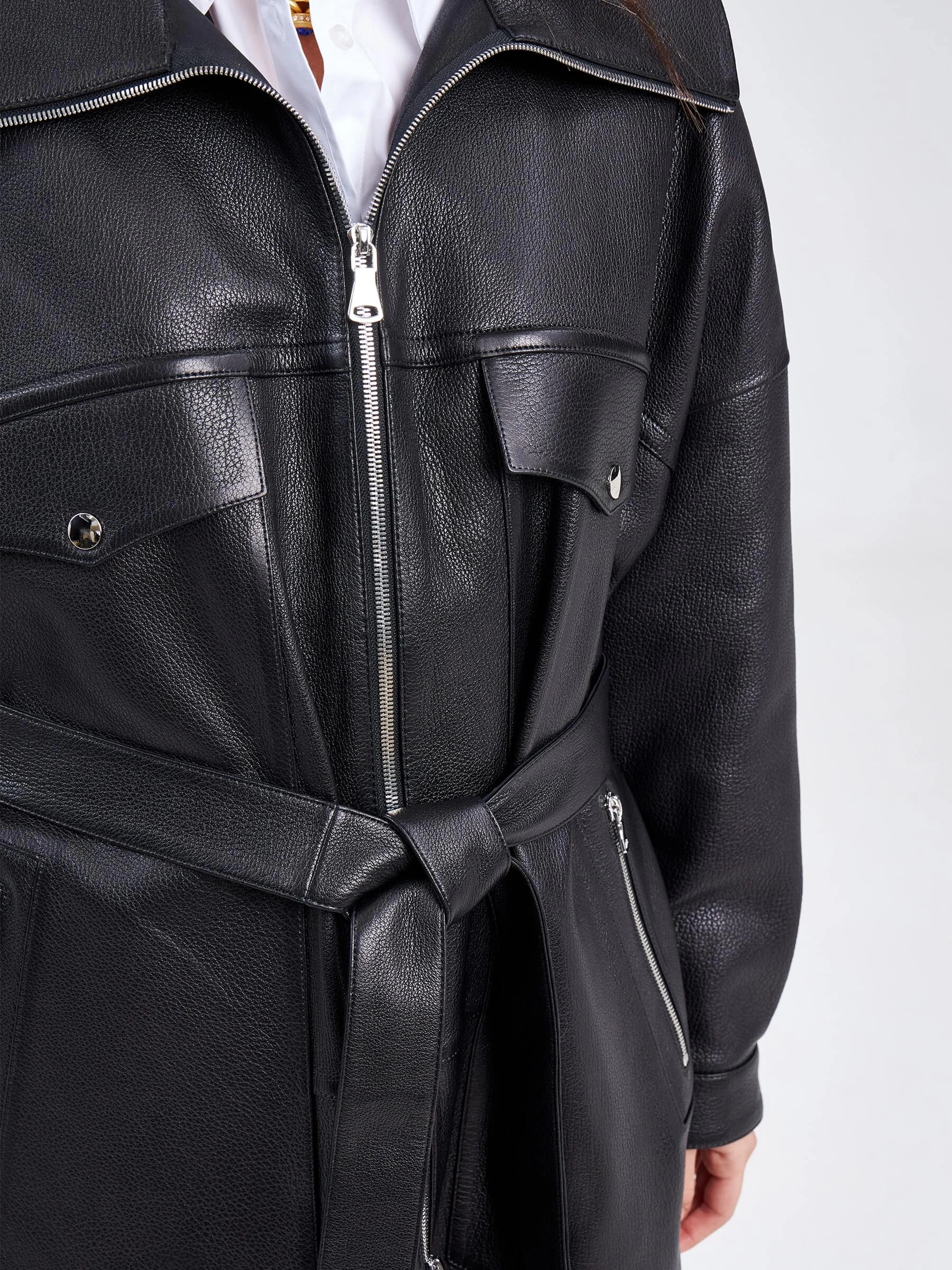 Эту модель кожаного пальто позаимствовали у рубашки, лишь слегка изменив детали. Свободный крой, четыре кармана, боковые разрезы как и сама модель застегиваются на молнию. Отложной воротник можно легко превратить в стойку. Широкий пояс-лента формирует приталенный силуэт. Идеальное сочетание с любой одеждой.