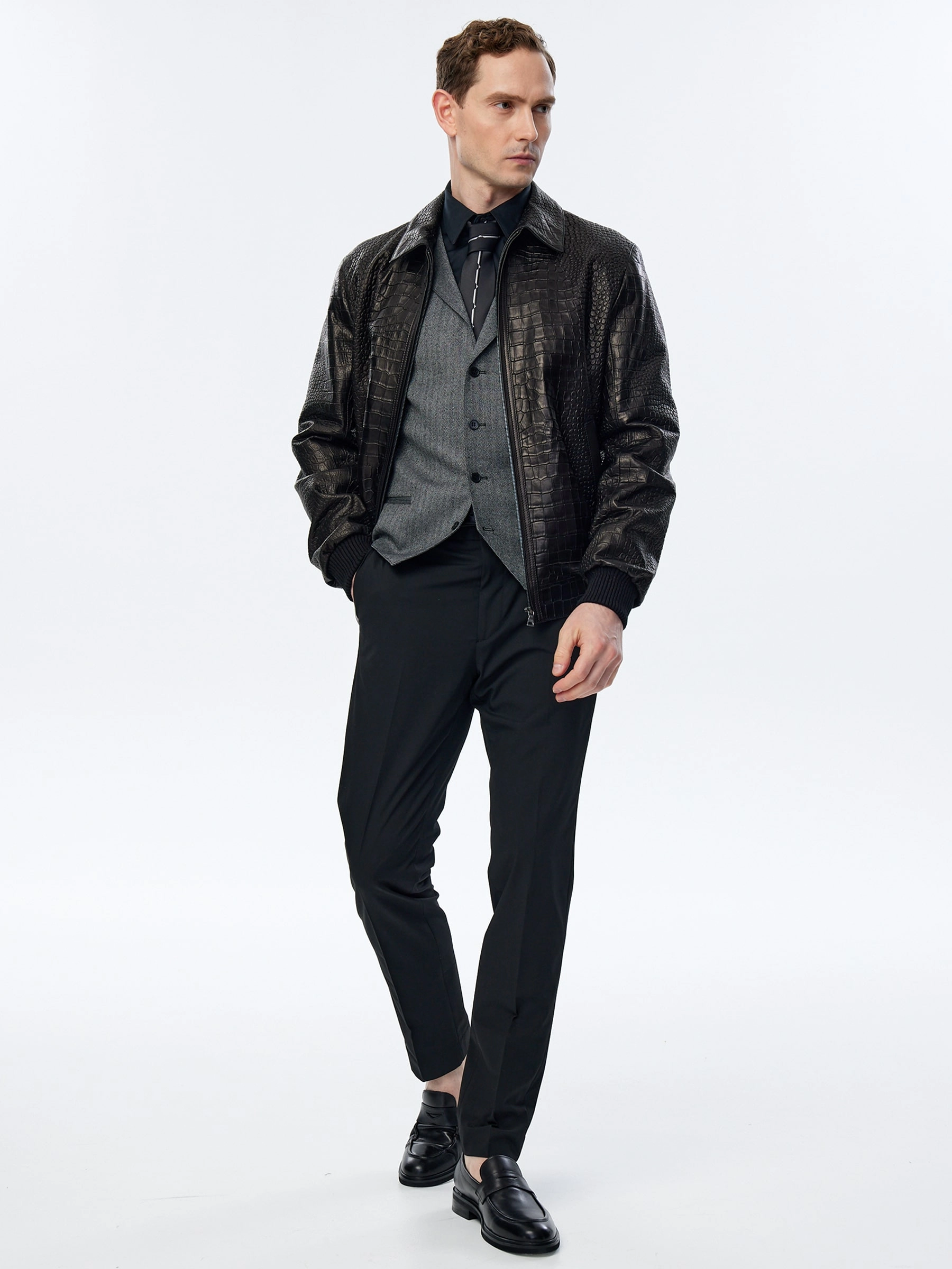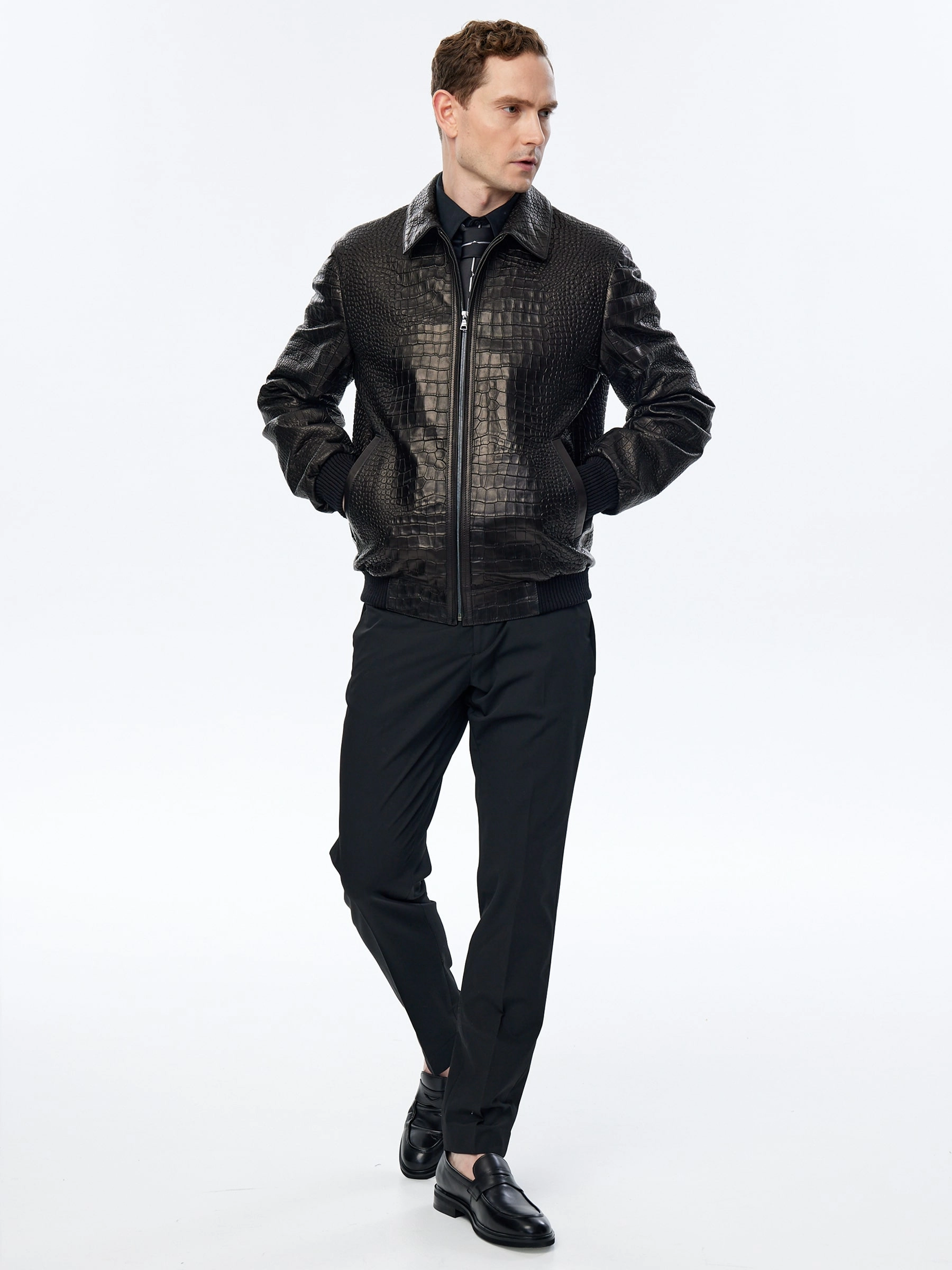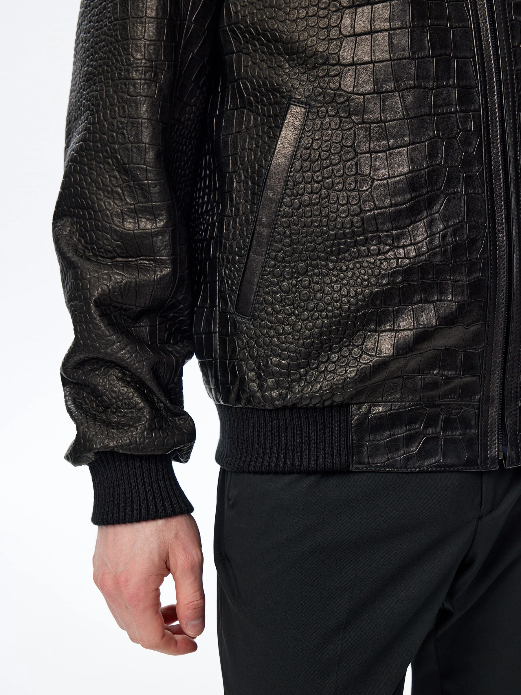 Для пошива куртки-бомбера с отложным воротником использовали мягую фактурную кожу кроко премиального качества. Сдержанный черный цвет, свободный крой и полное отсутствие декора подчеркивают комфорт и универсальность модели. Изделие дополнили плотными трикотажными манжетами и поясом.