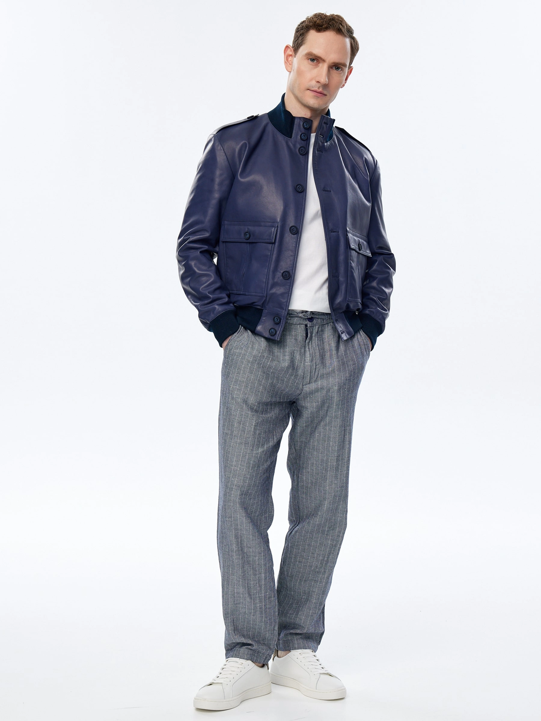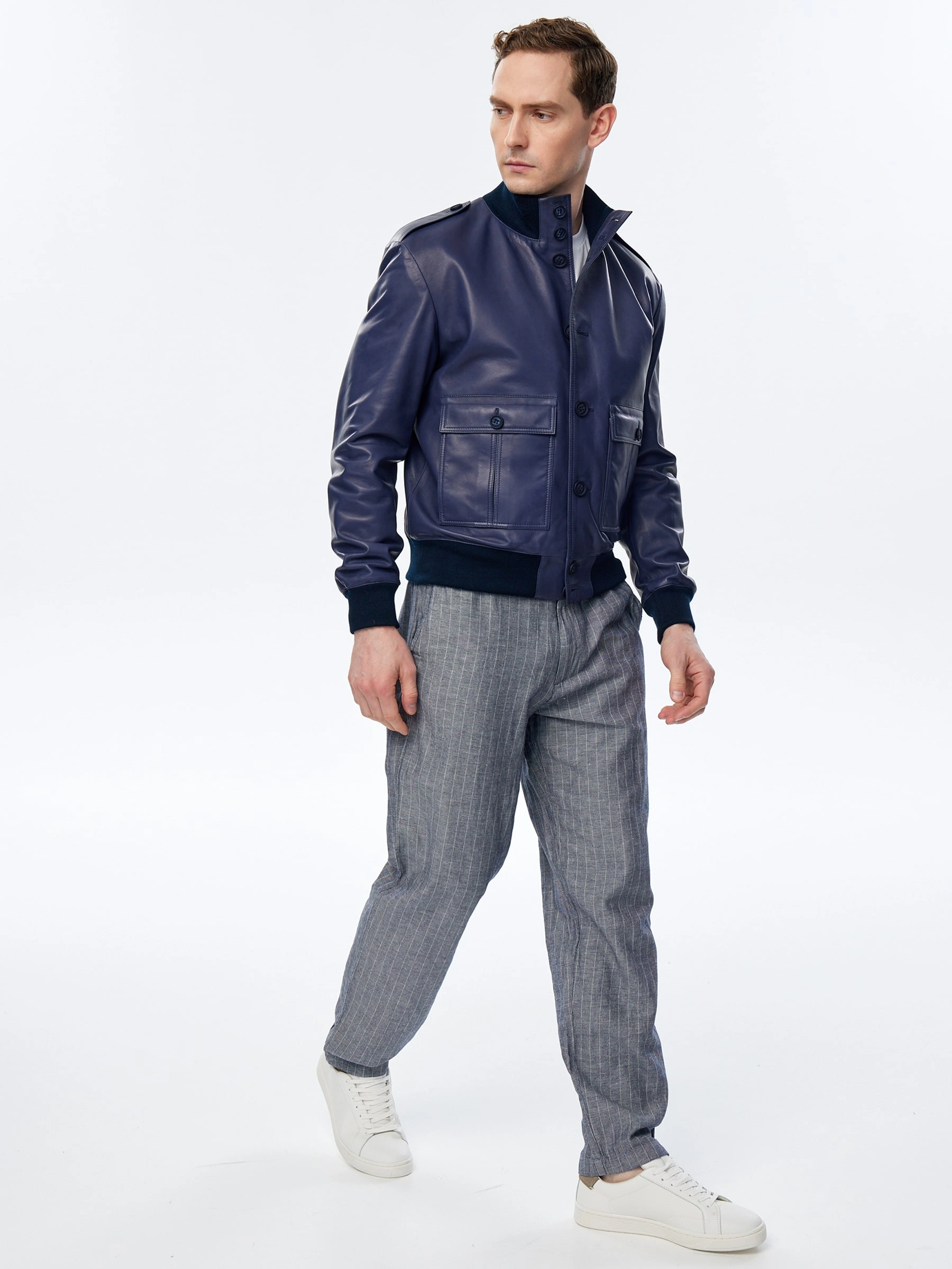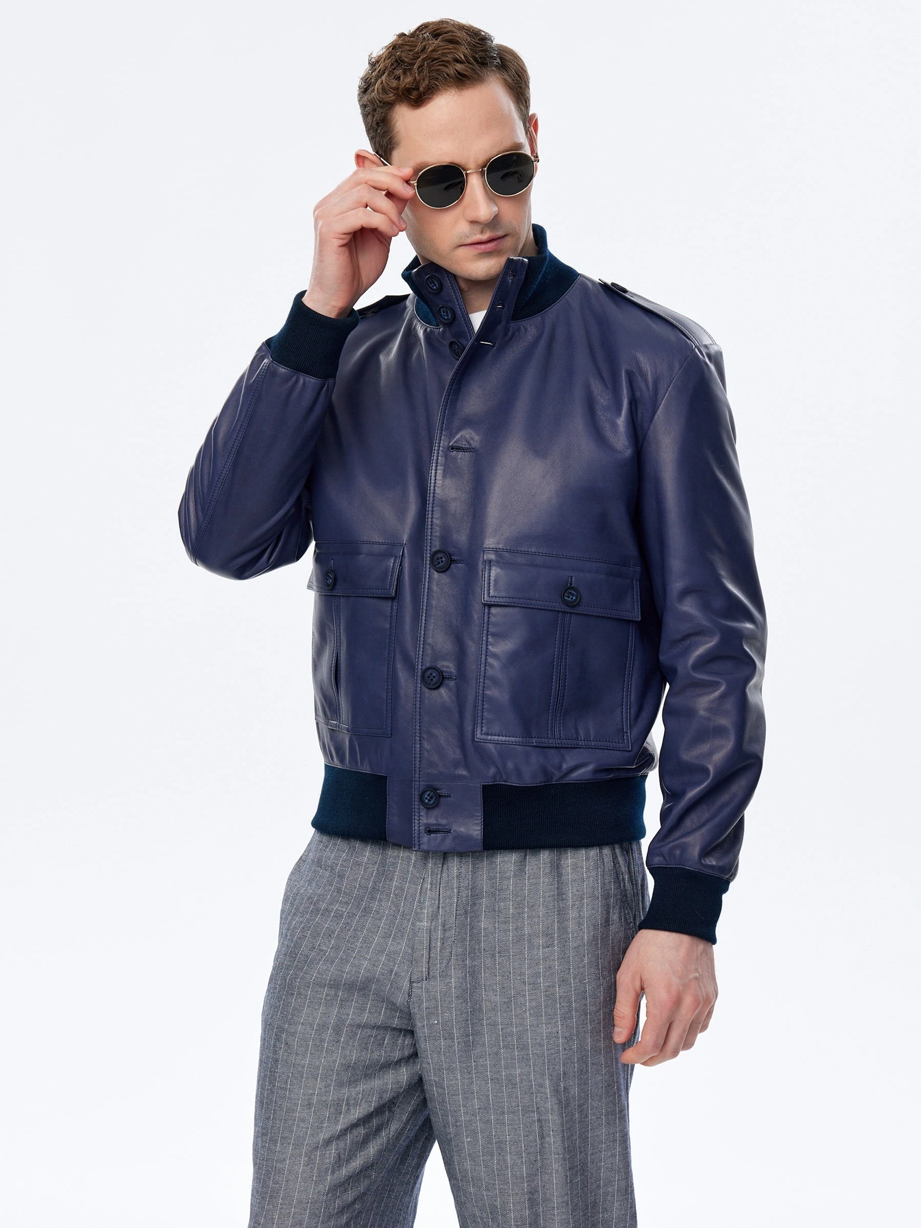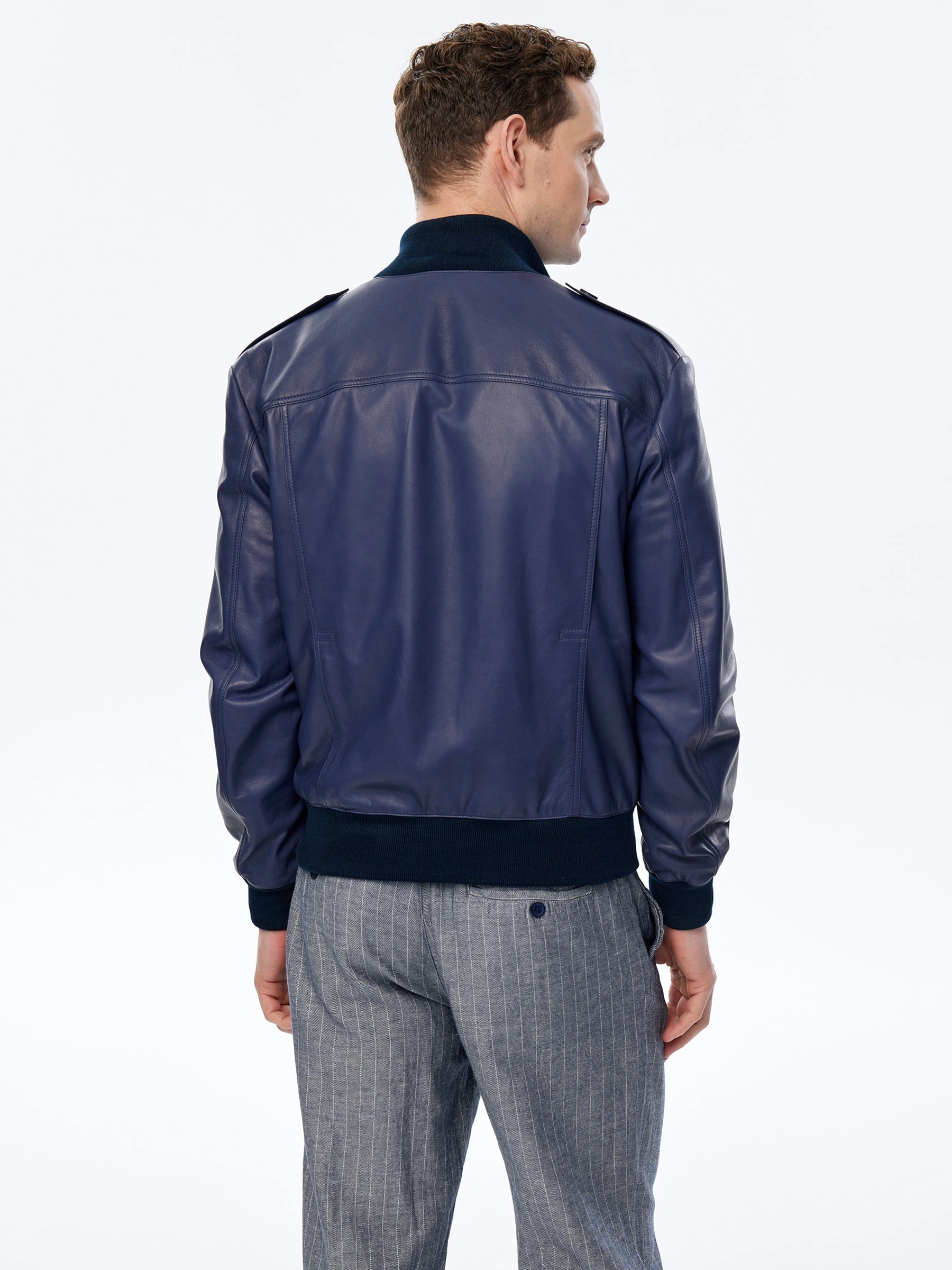 Мужская кожаная куртка бомбер премиум класса Роми, синяя, размер 48, артикул 29720