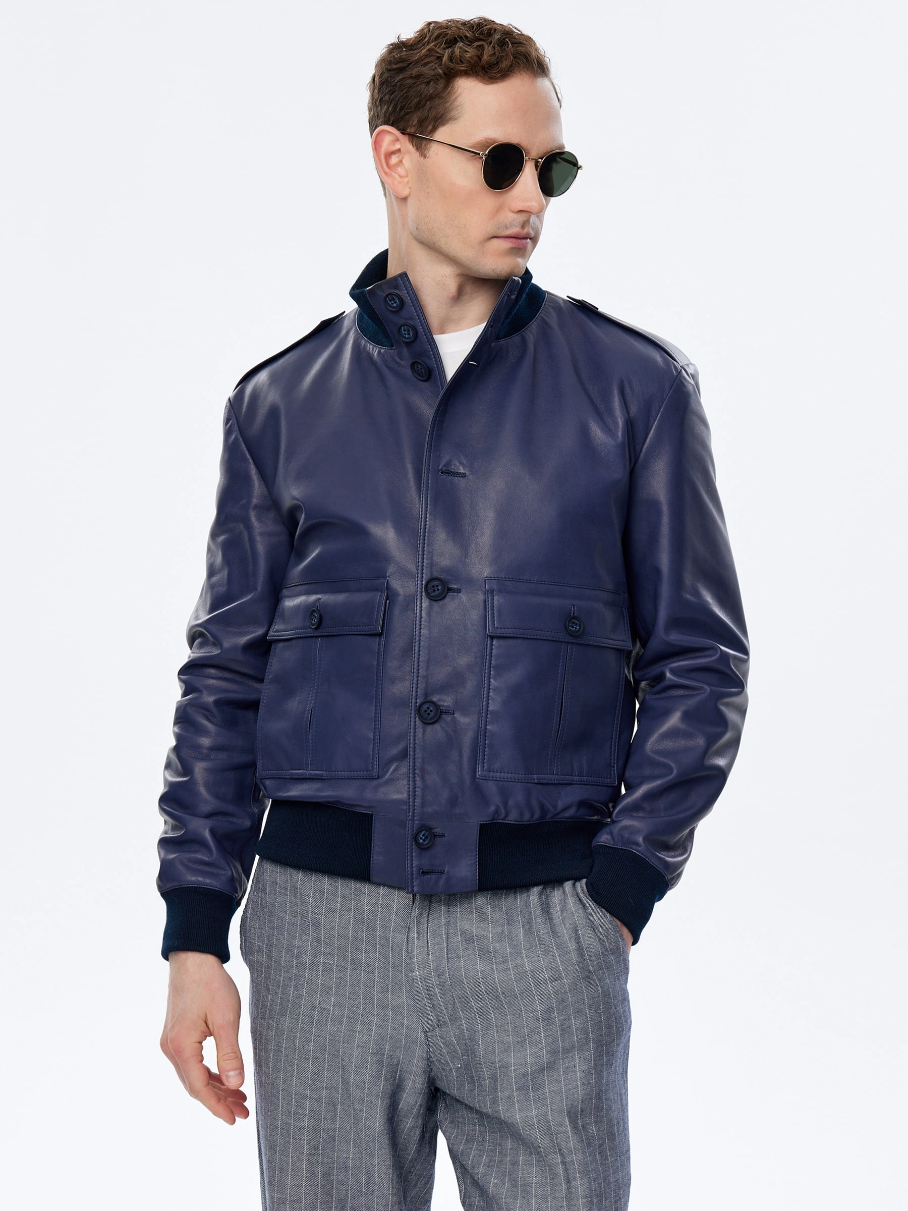 Товар мужская кожаная куртка бомбер премиум класса роми, синяя, размер 48, артикул 29720 выполнен из натуральной кожи с застежкой пуговицы. Рассчитан на сезон: весна-лето. Длина изделия 65 см, силуэт свободный.