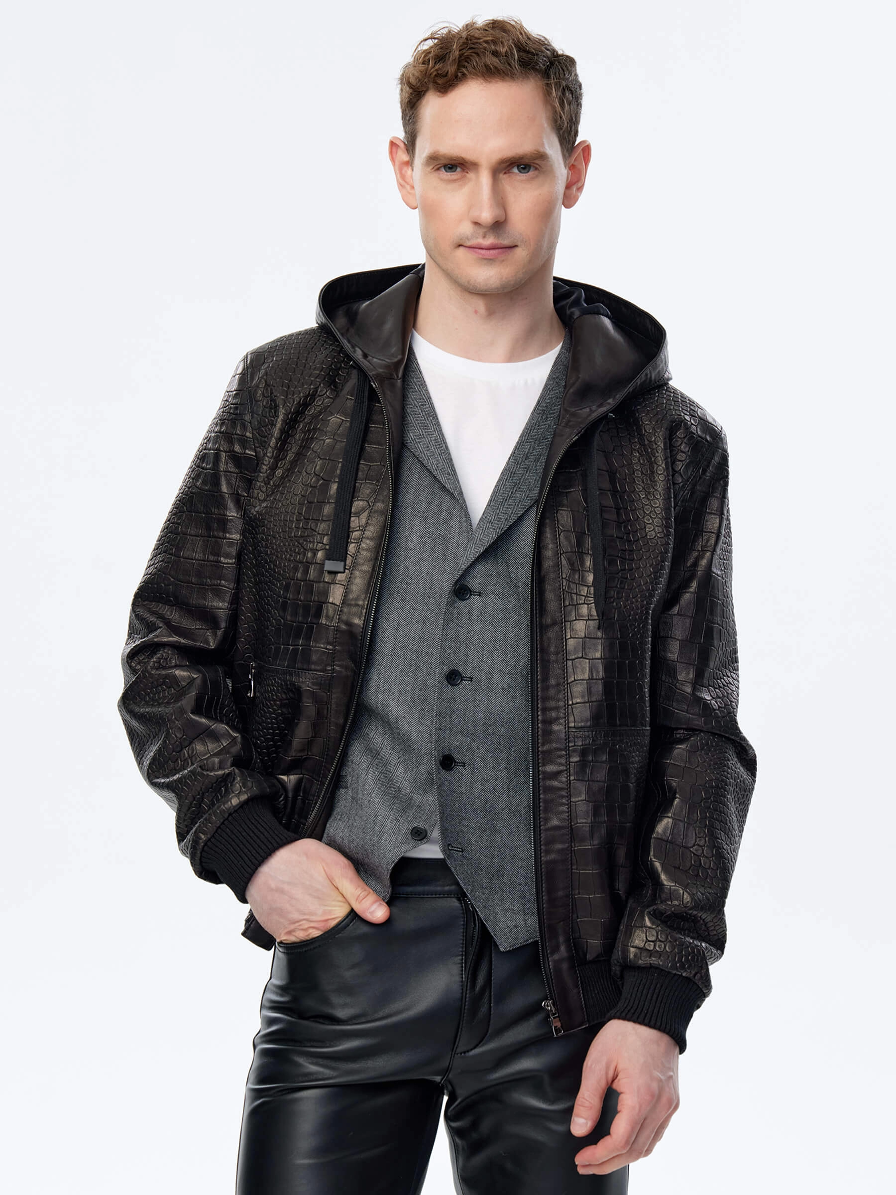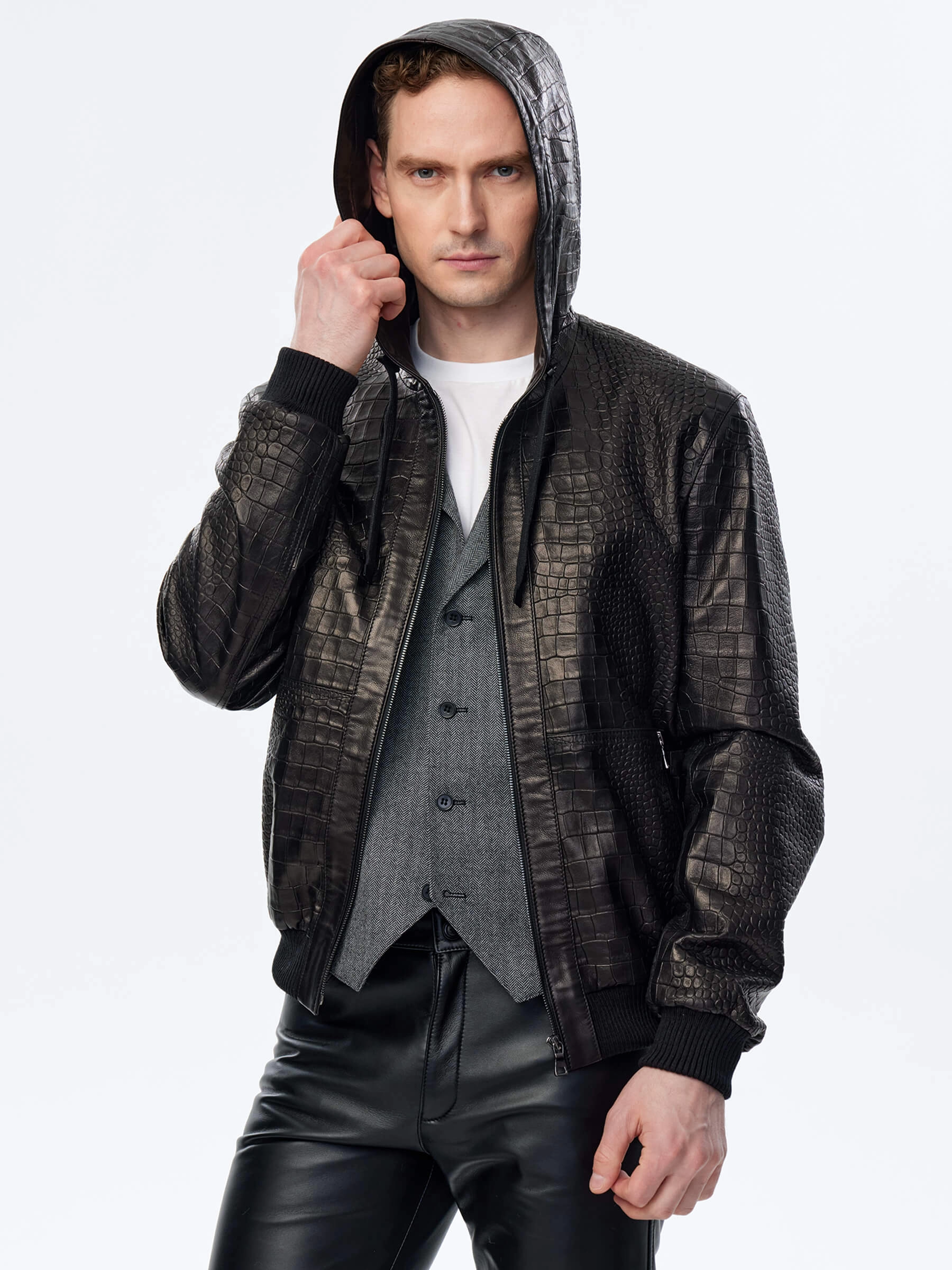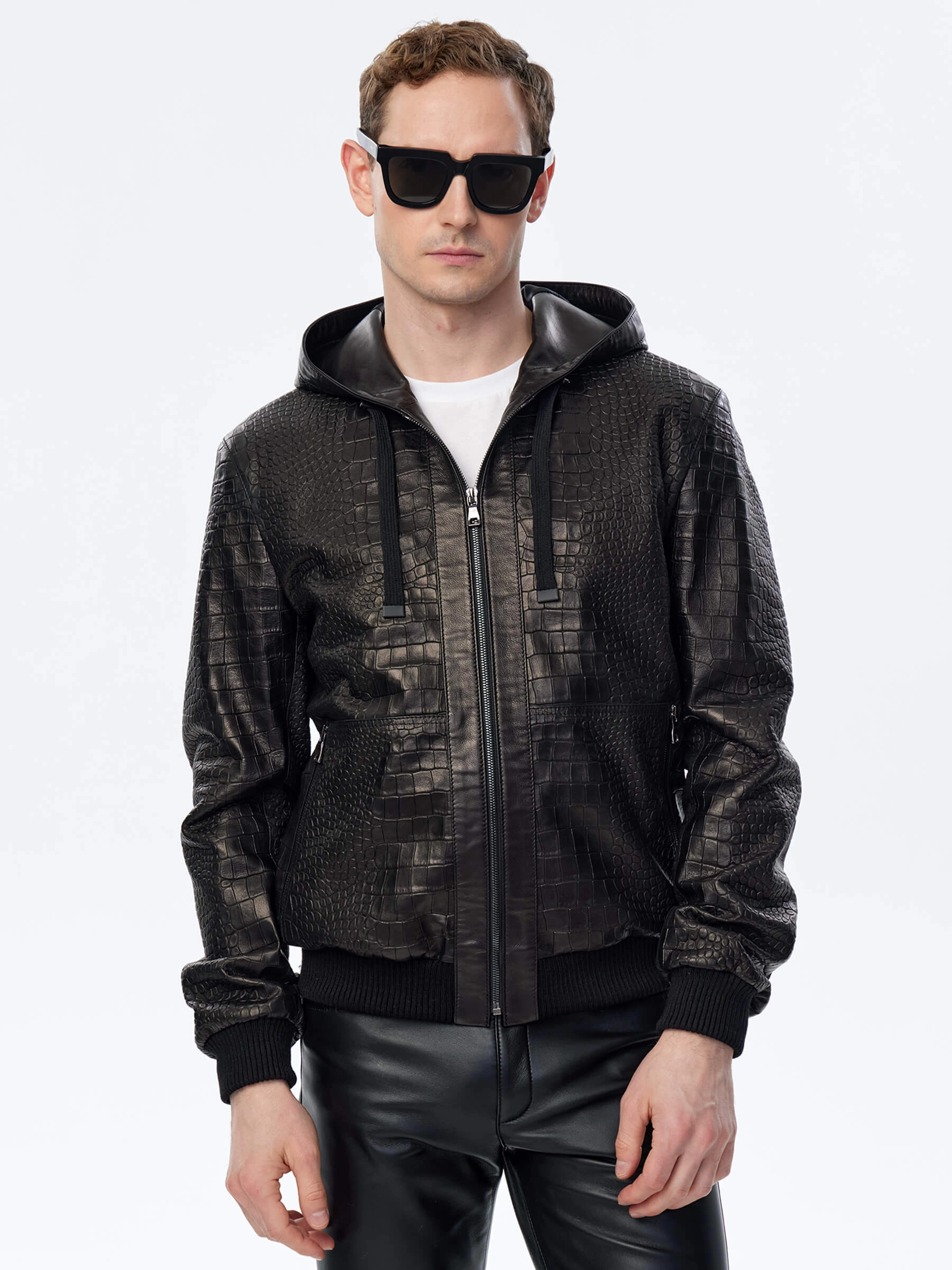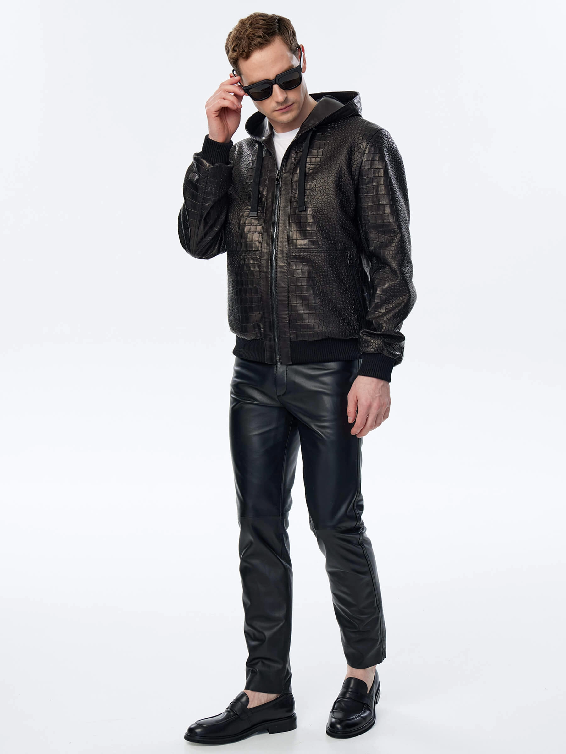 Для пошива бомбера с глубоким регулируемым капюшоном и двумя боковыми карманами использовали мягкую фактурную кожу премиум класс. Куртка свободного кроя комфортно садится по фигуре, не ограничивает движения. Модель дополнили плотными трикотажными манжетами и поясом.
