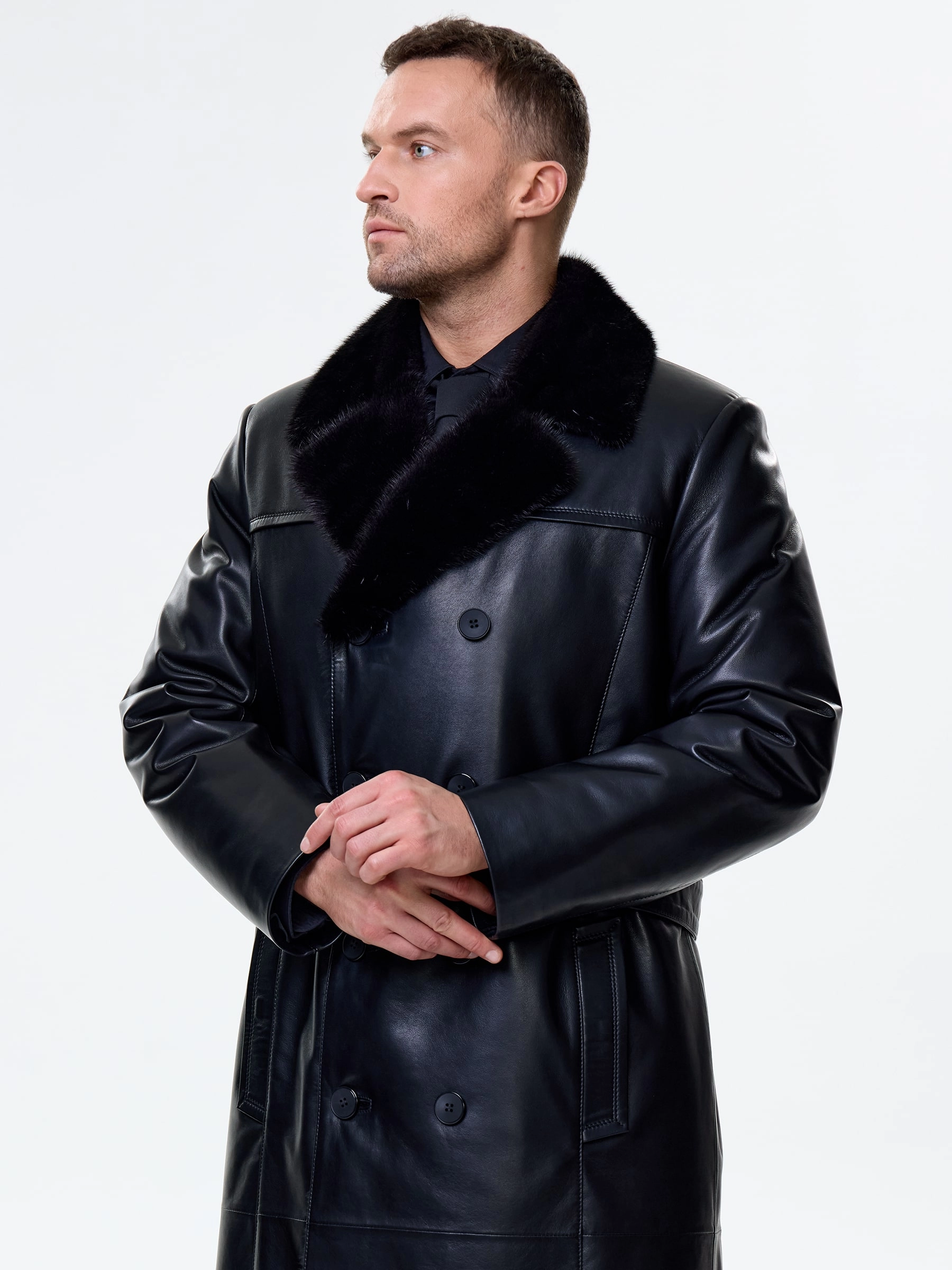 Товар мужское зимнее кожаное пальто с норковым воротником премиум класса 563мех, черное, размер 48, артикул 41110 выполнен из натуральной кожи с застежкой пуговицы. Рассчитан на сезон: осень-зима. Длина изделия 115 см, силуэт прямой.