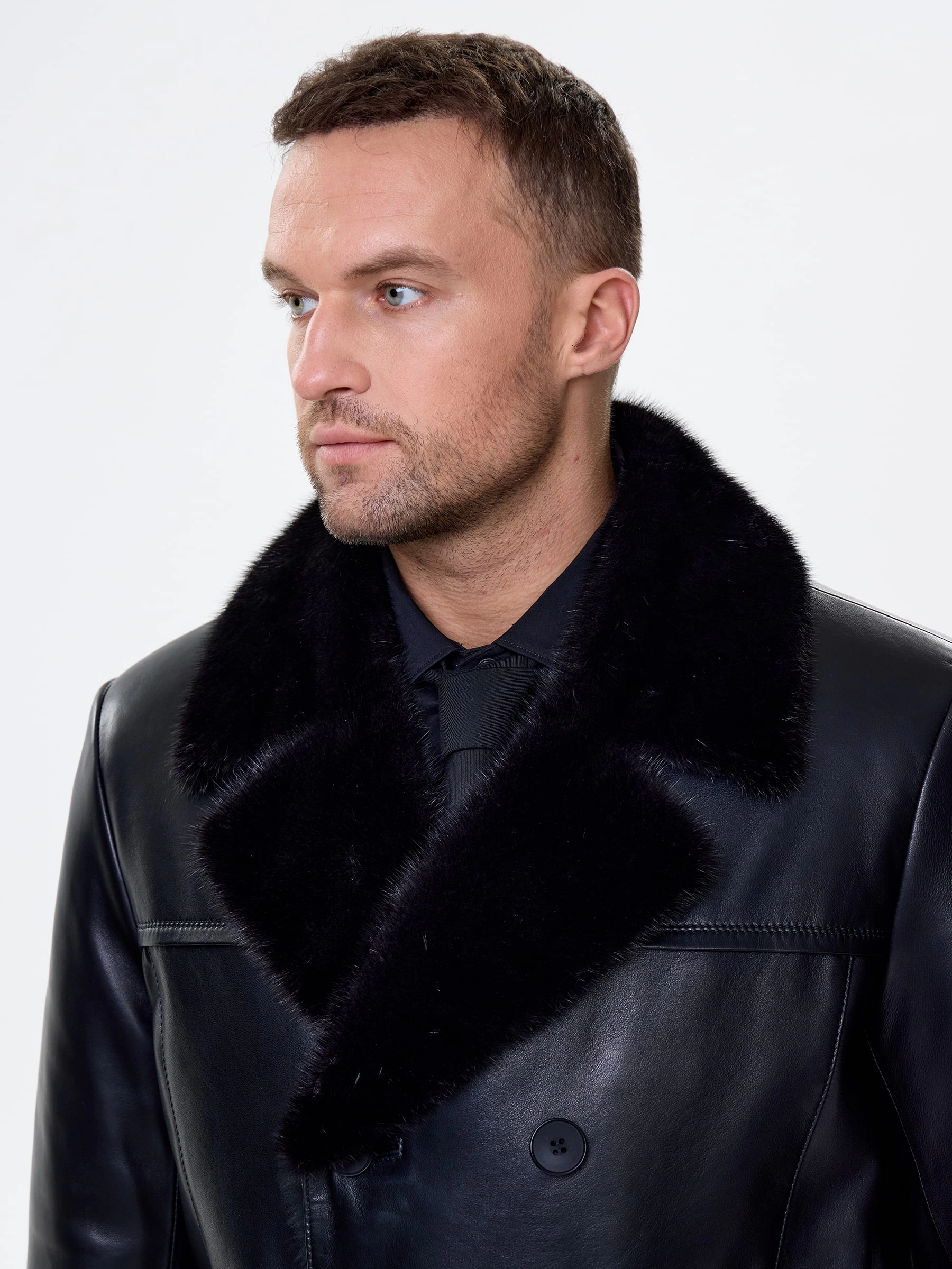 Мужской зимний кожаный плащ с норковым воротником премиум класса 563мех, черный, размер 48, артикул 41120