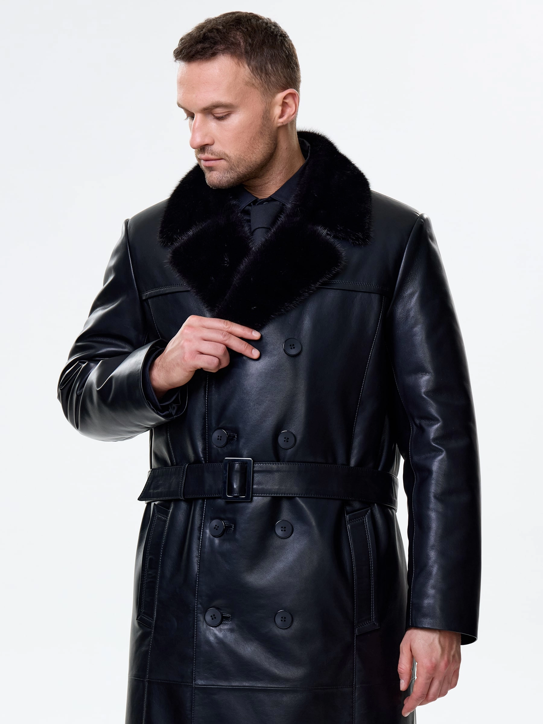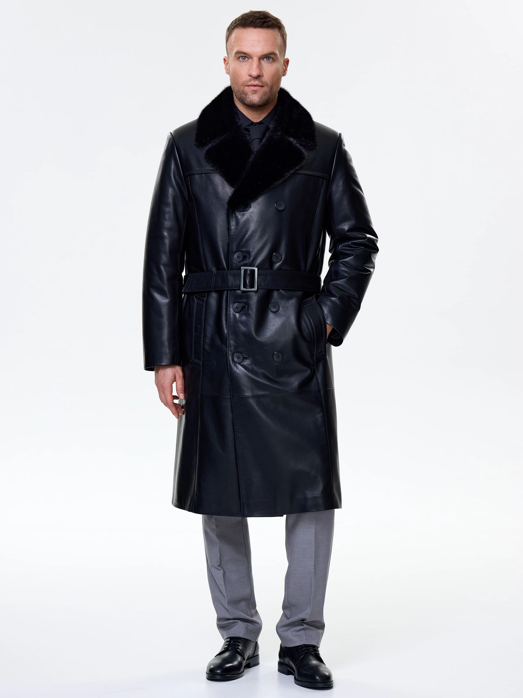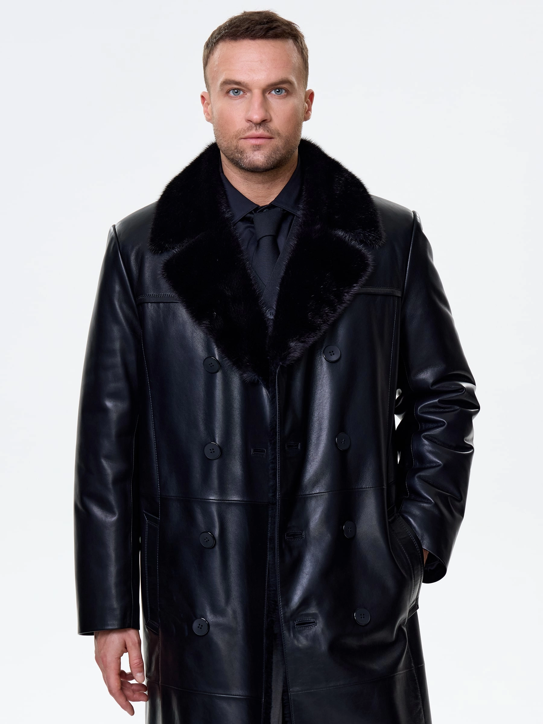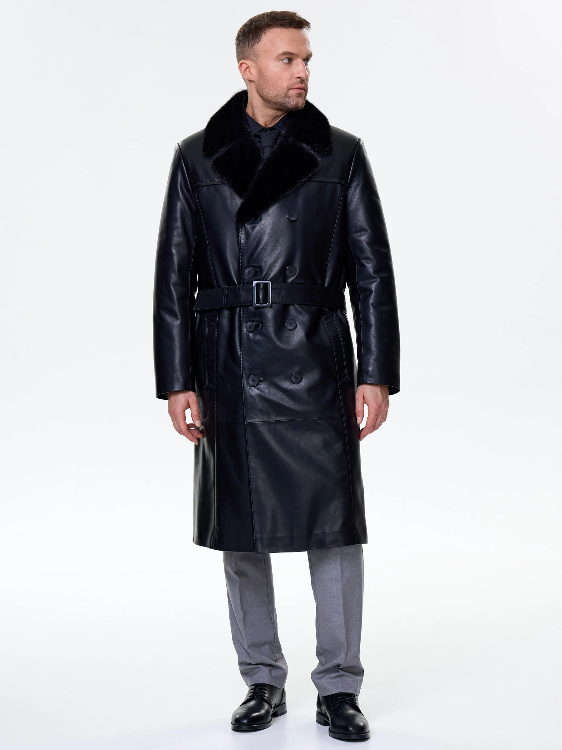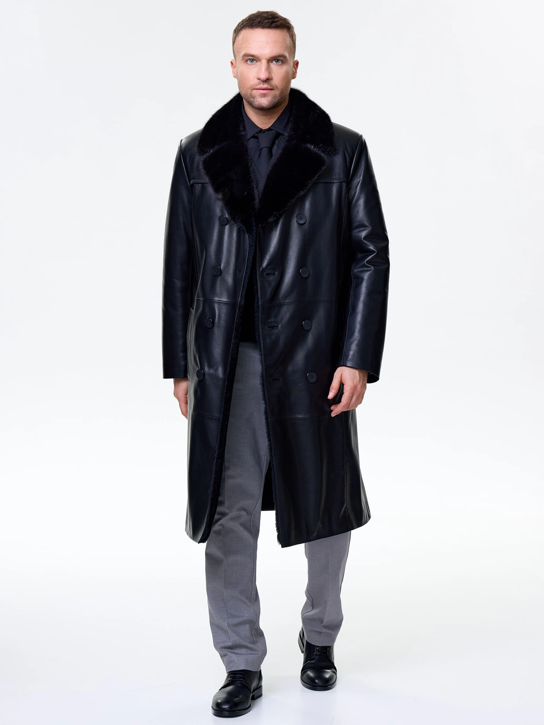 Товар мужской зимний кожаный плащ с норковым воротником премиум класса 563мех, черный, размер 48, артикул 41120 выполнен из натуральной кожи с застежкой пуговицы. Рассчитан на сезон: осень-зима. Длина изделия 115 см, силуэт прямой.