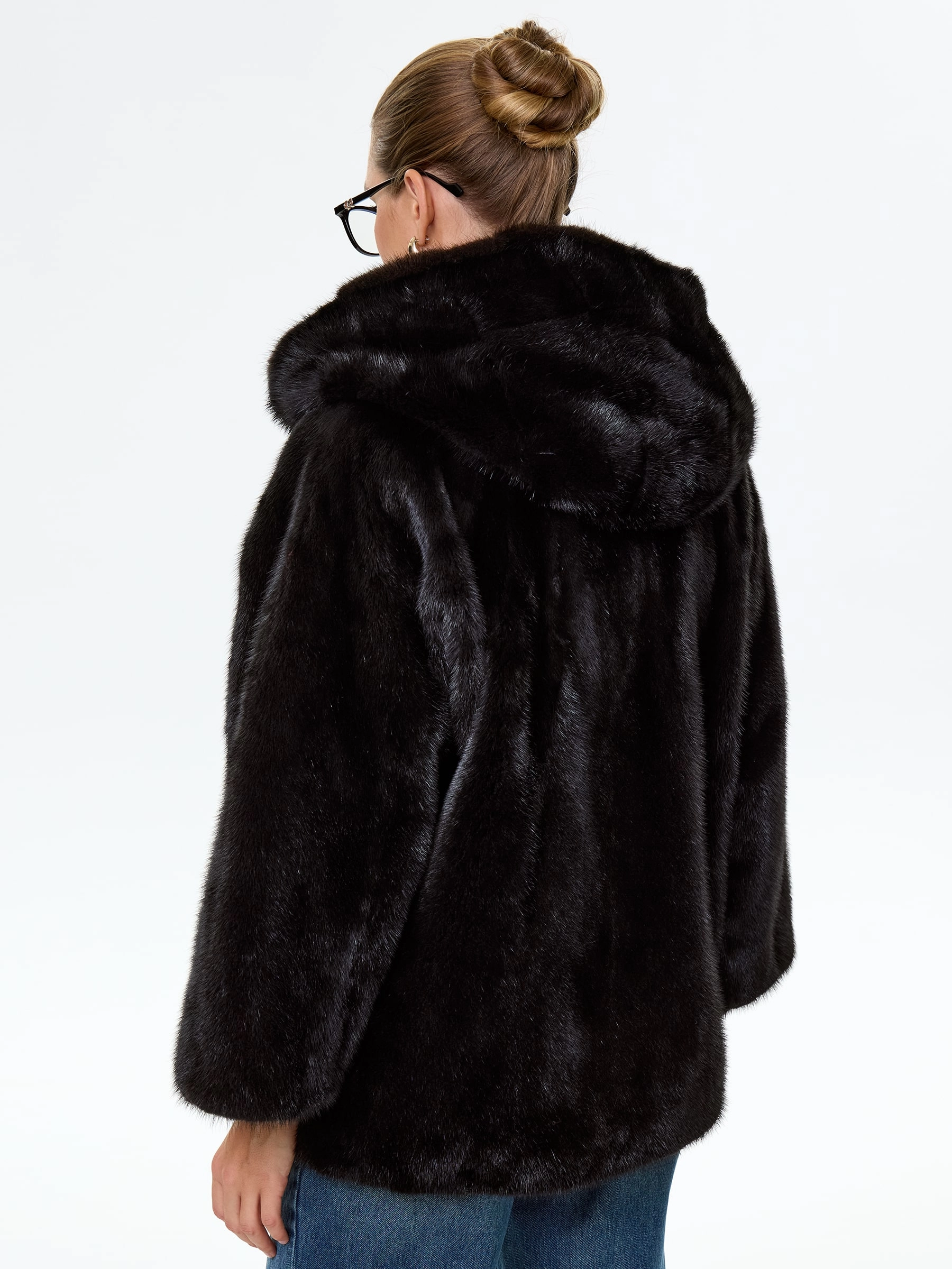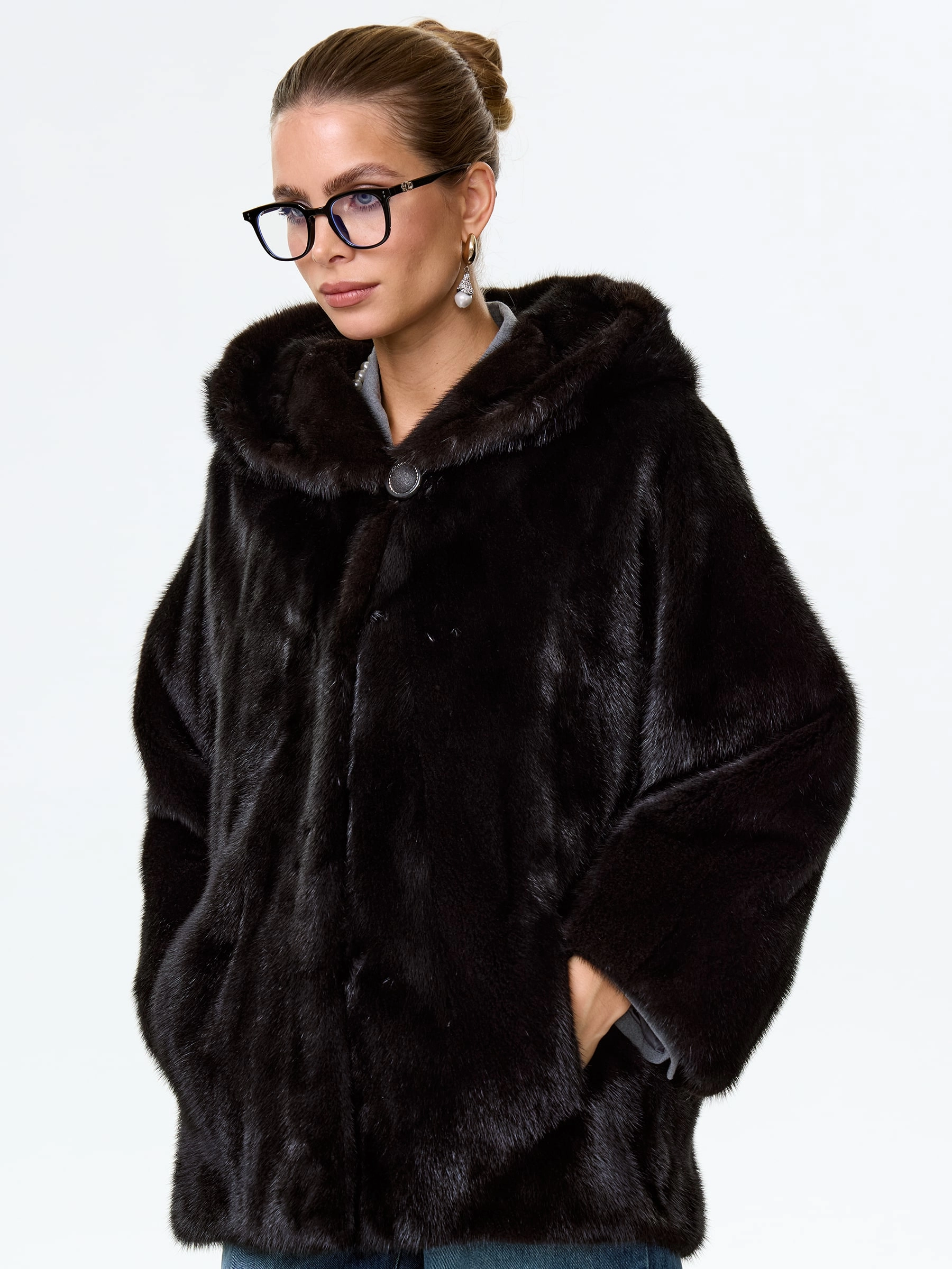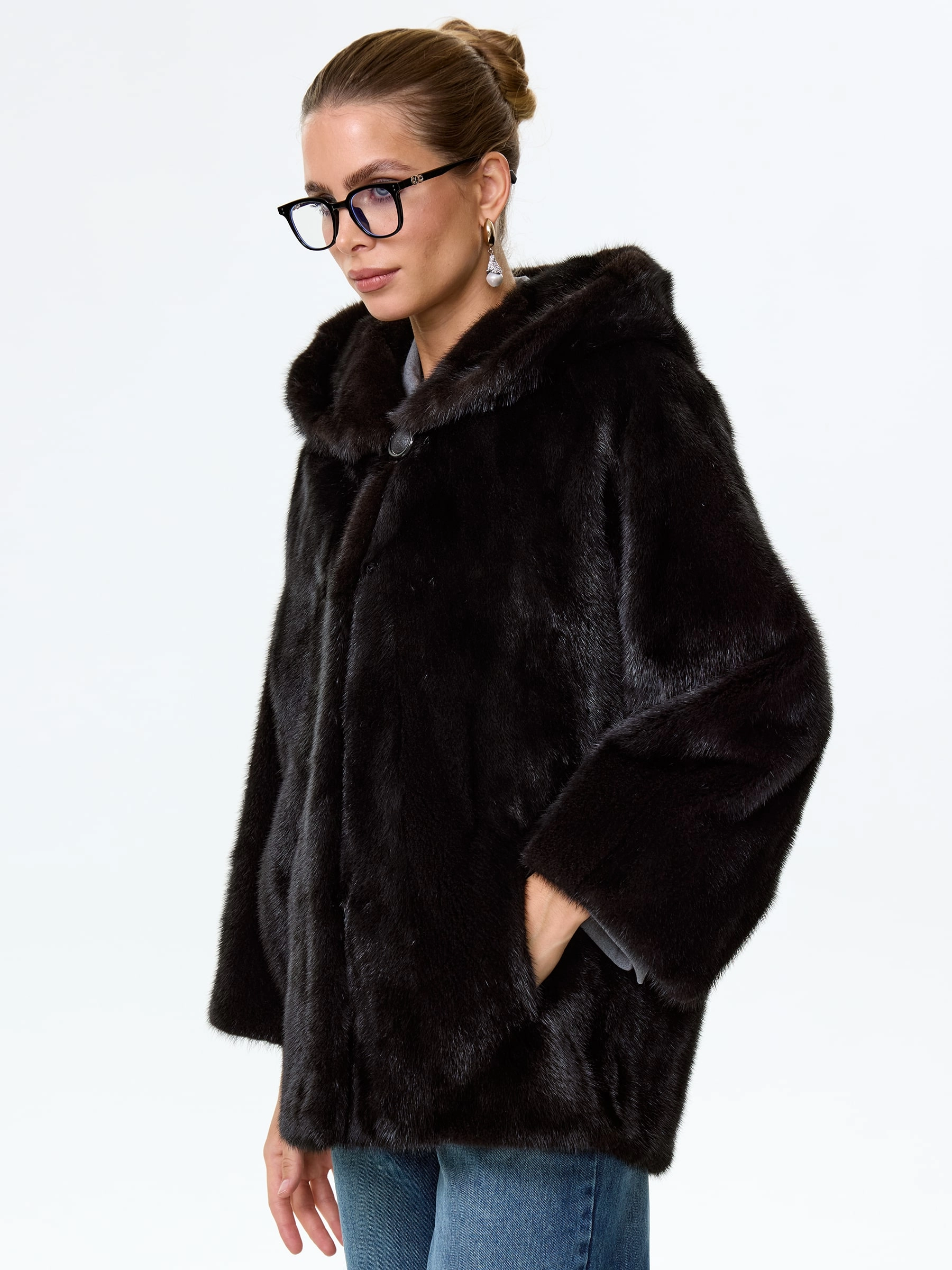 Норковая женская шуба автоледи с капюшоном Яна(к), черная, размер 48, артикул 34150