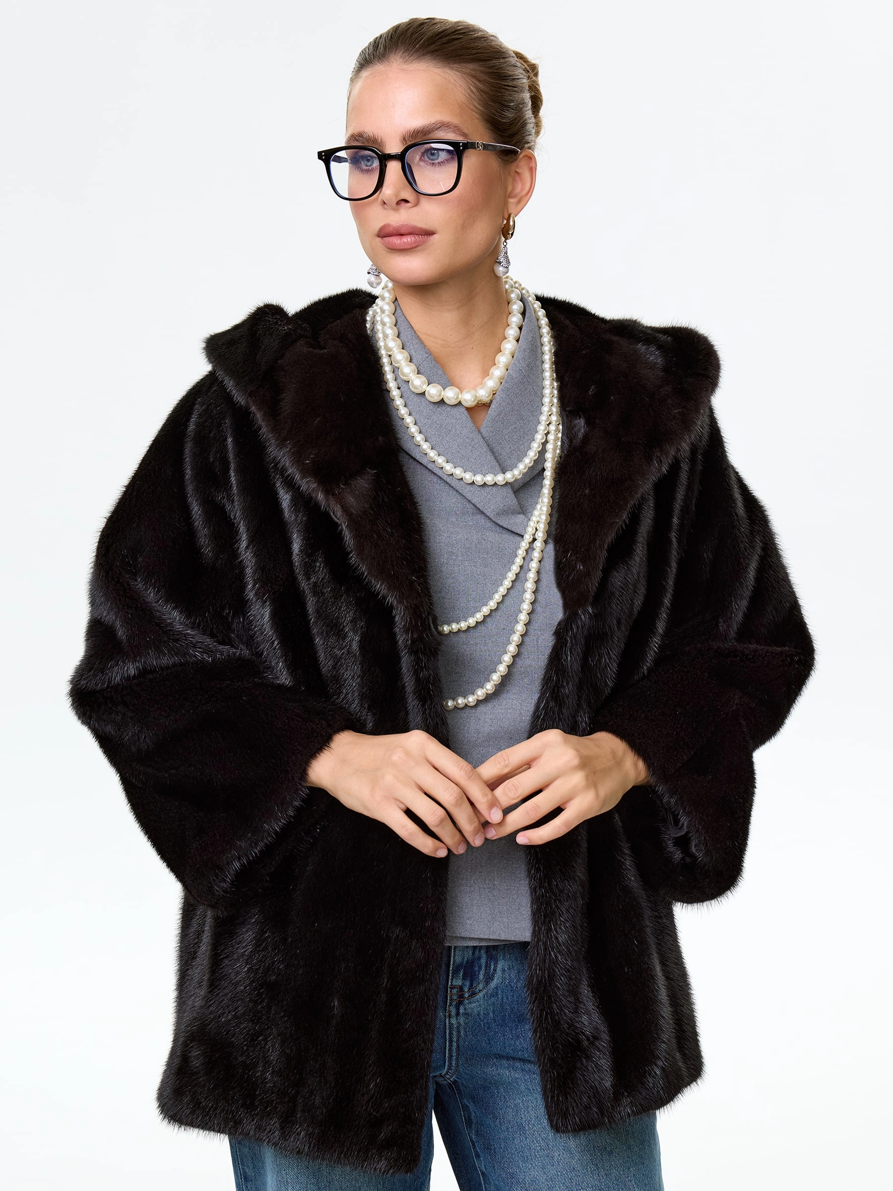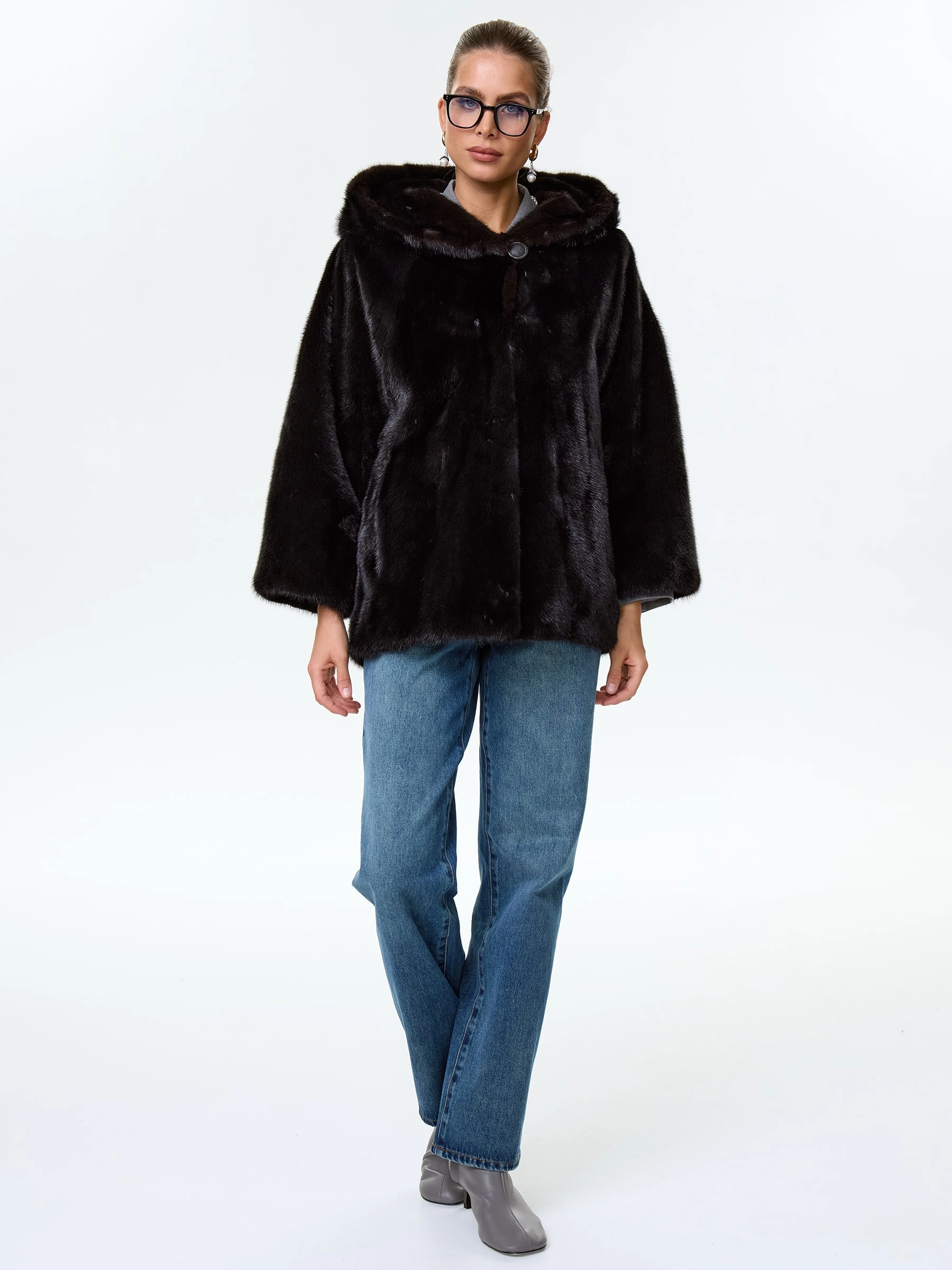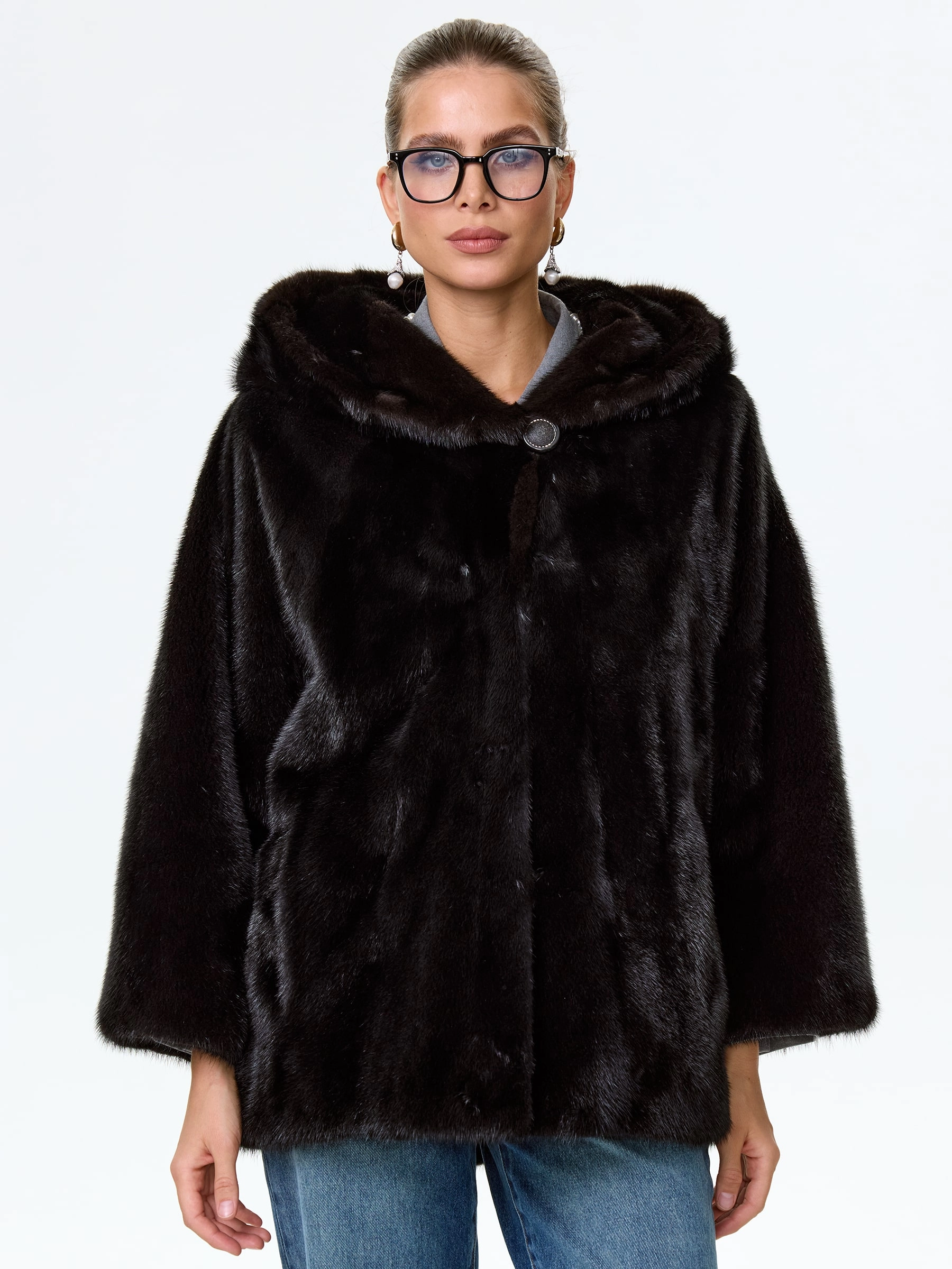 Норковая женская шуба автоледи с капюшоном Яна(к), черная, размер 48, артикул 34150