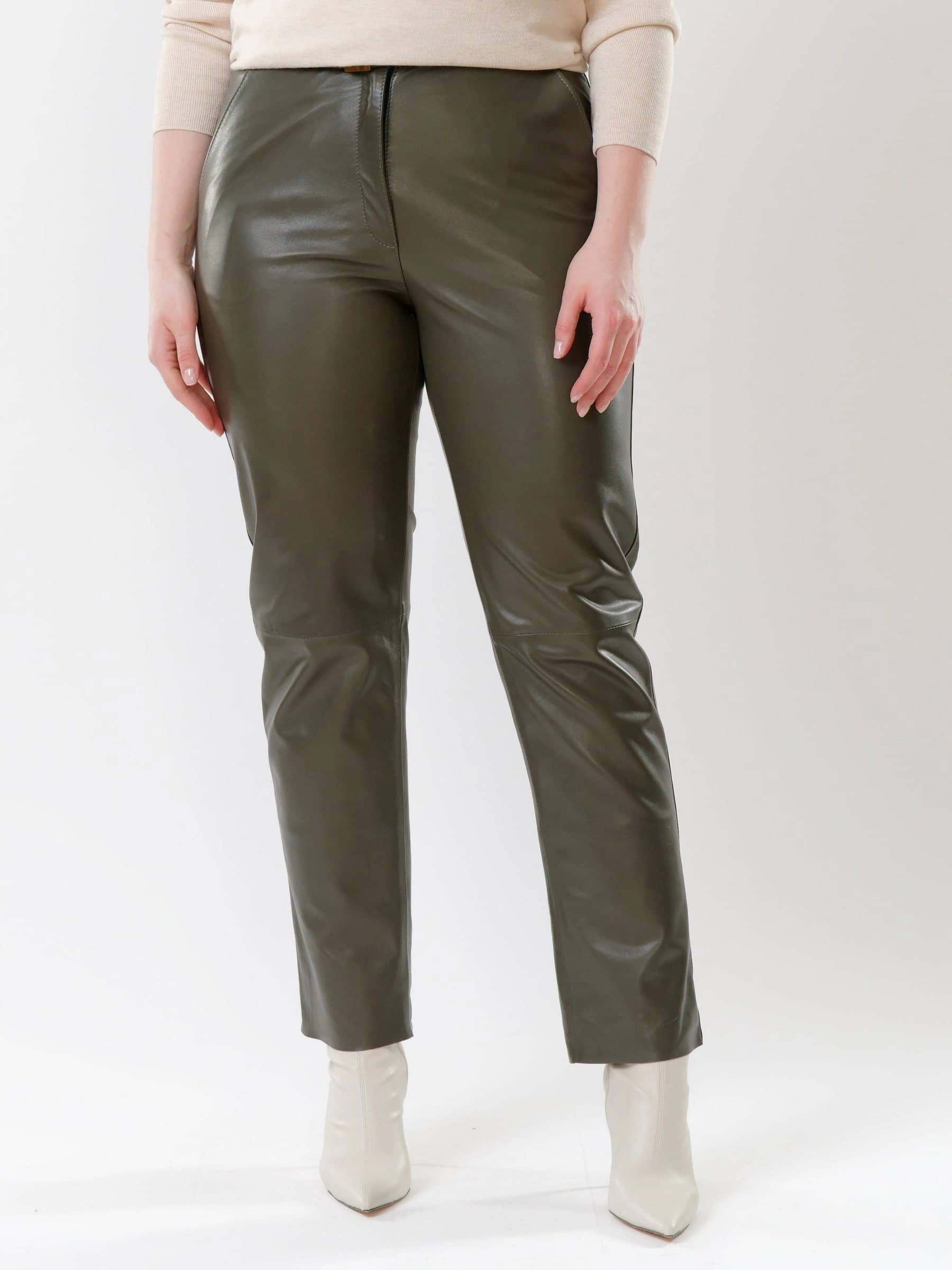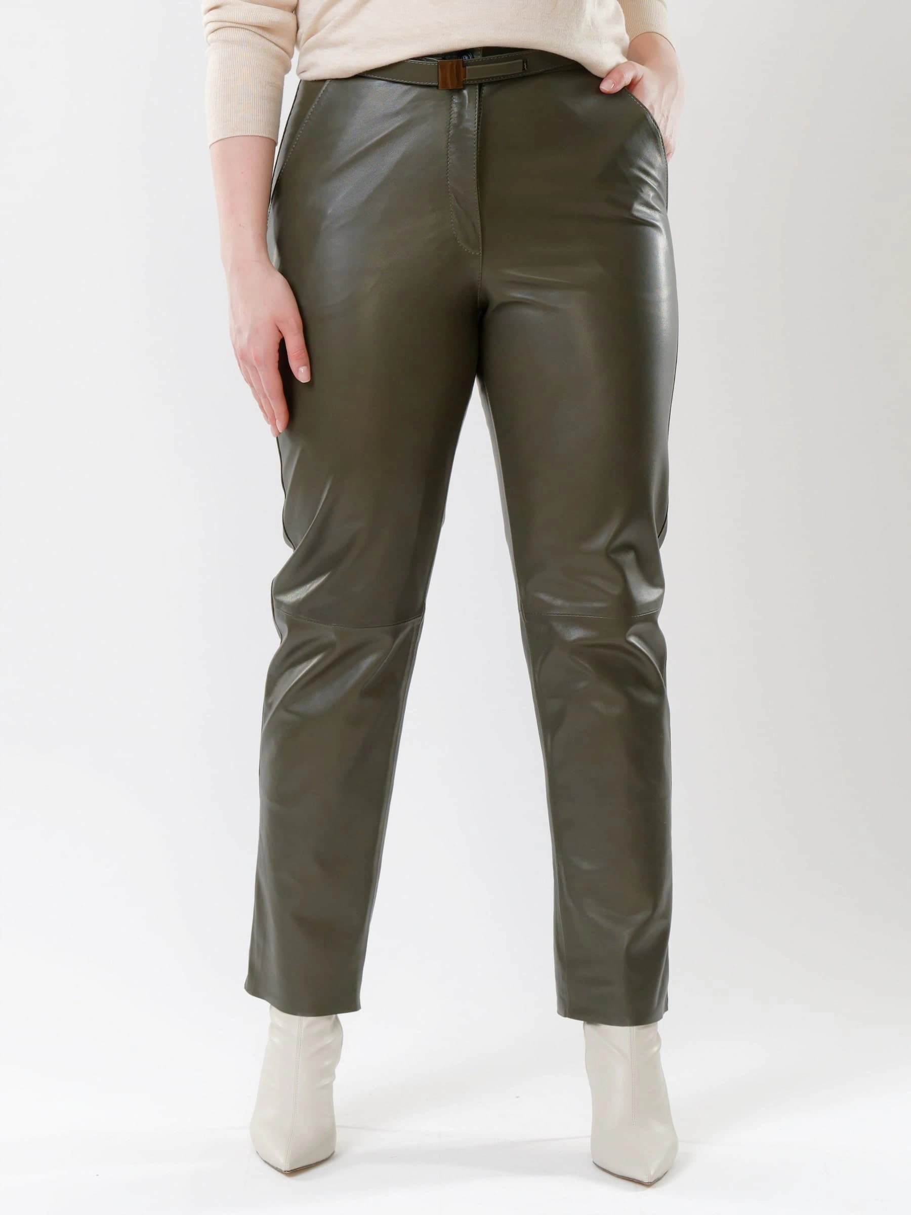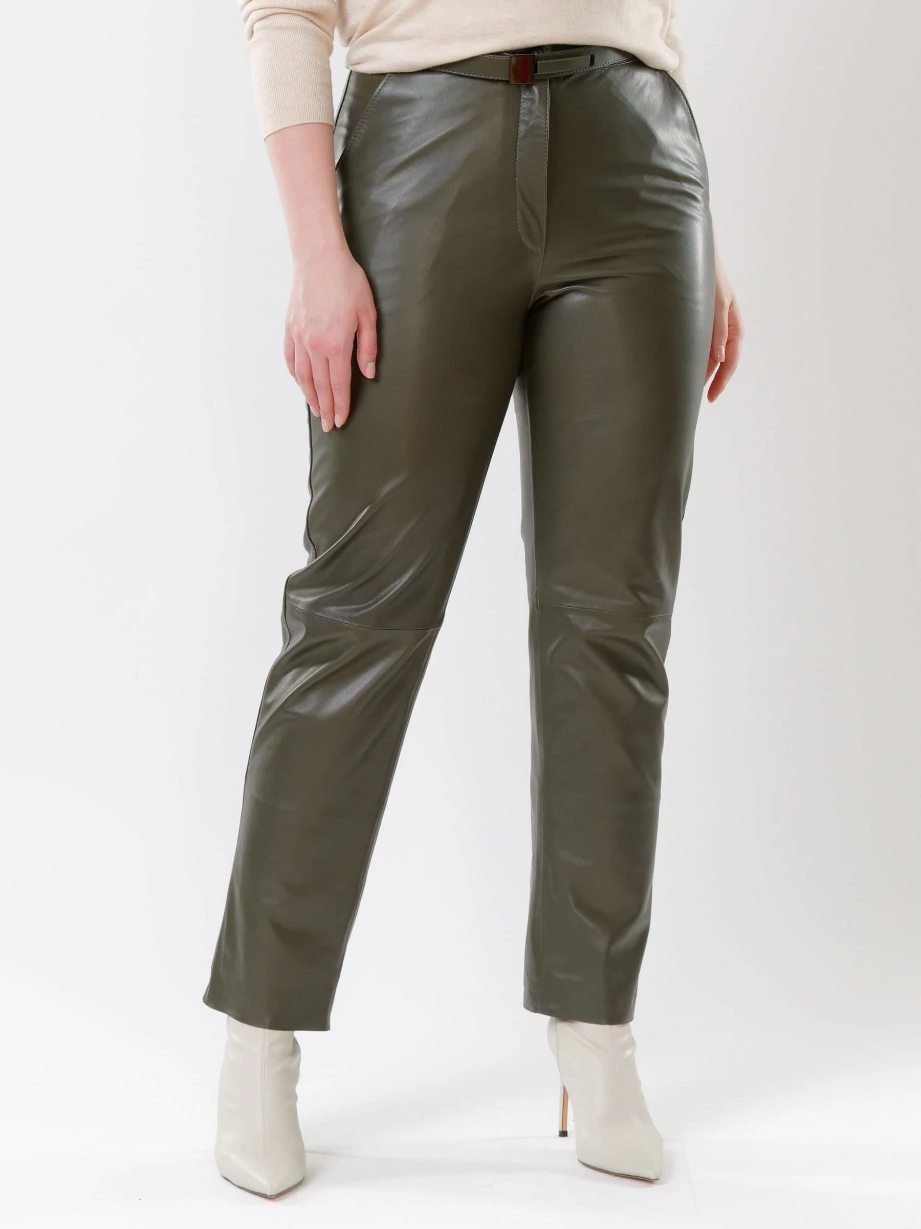 Оливковые прямые женские кожаные брюки 04, размер 46, артикул 85532