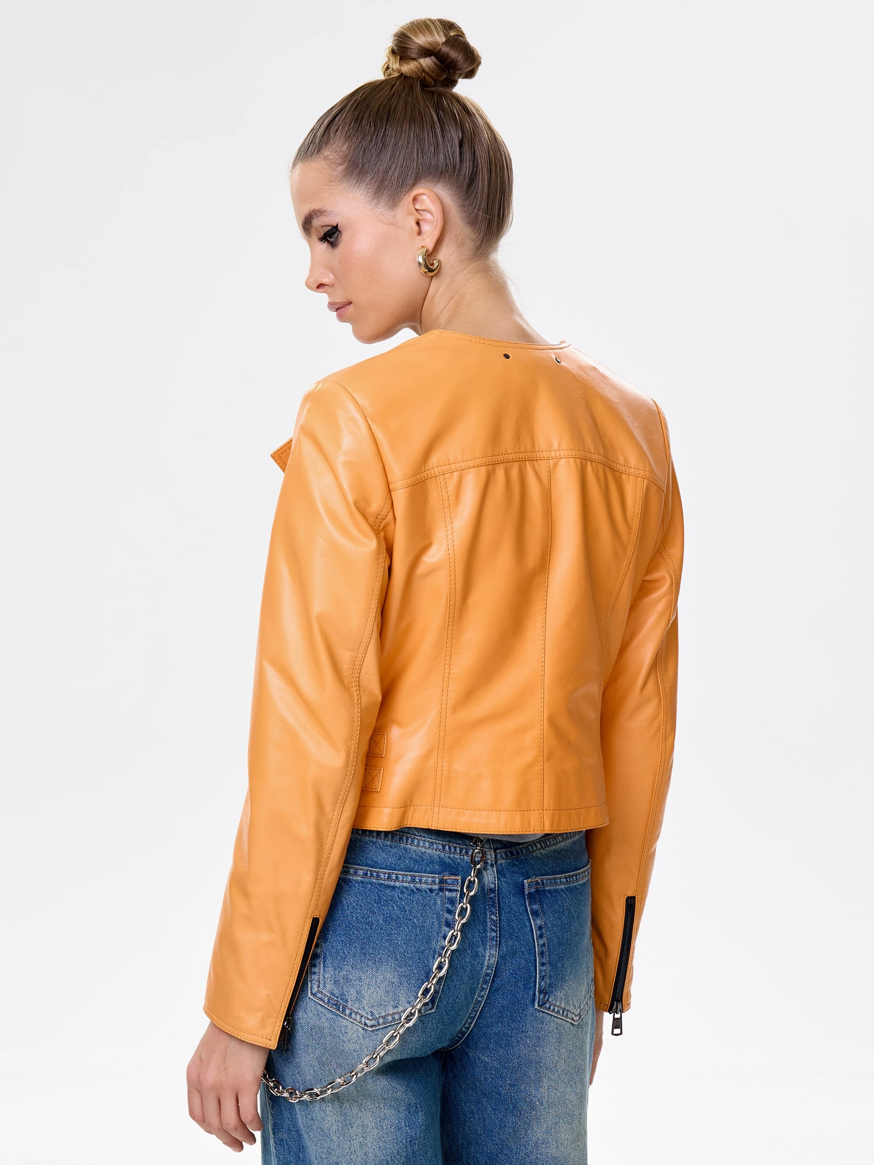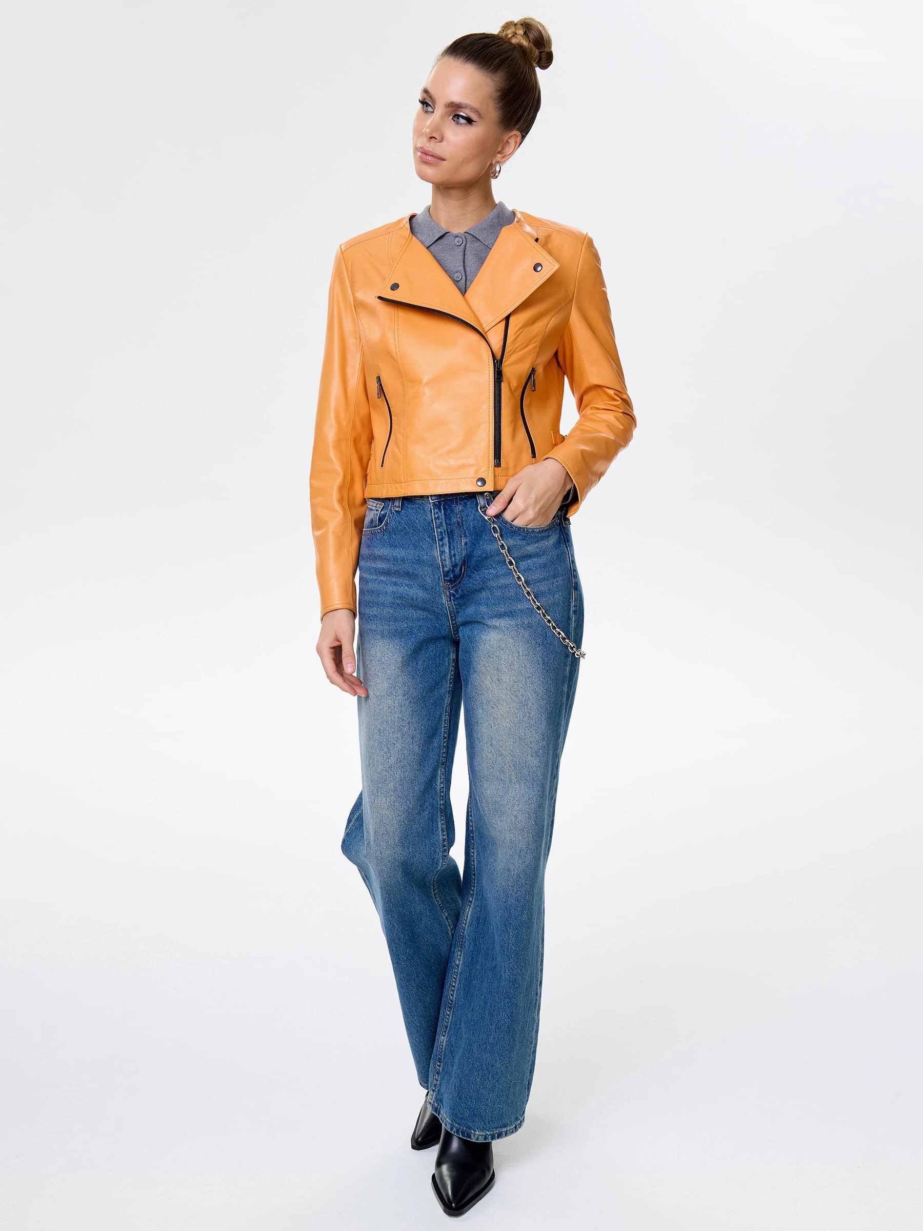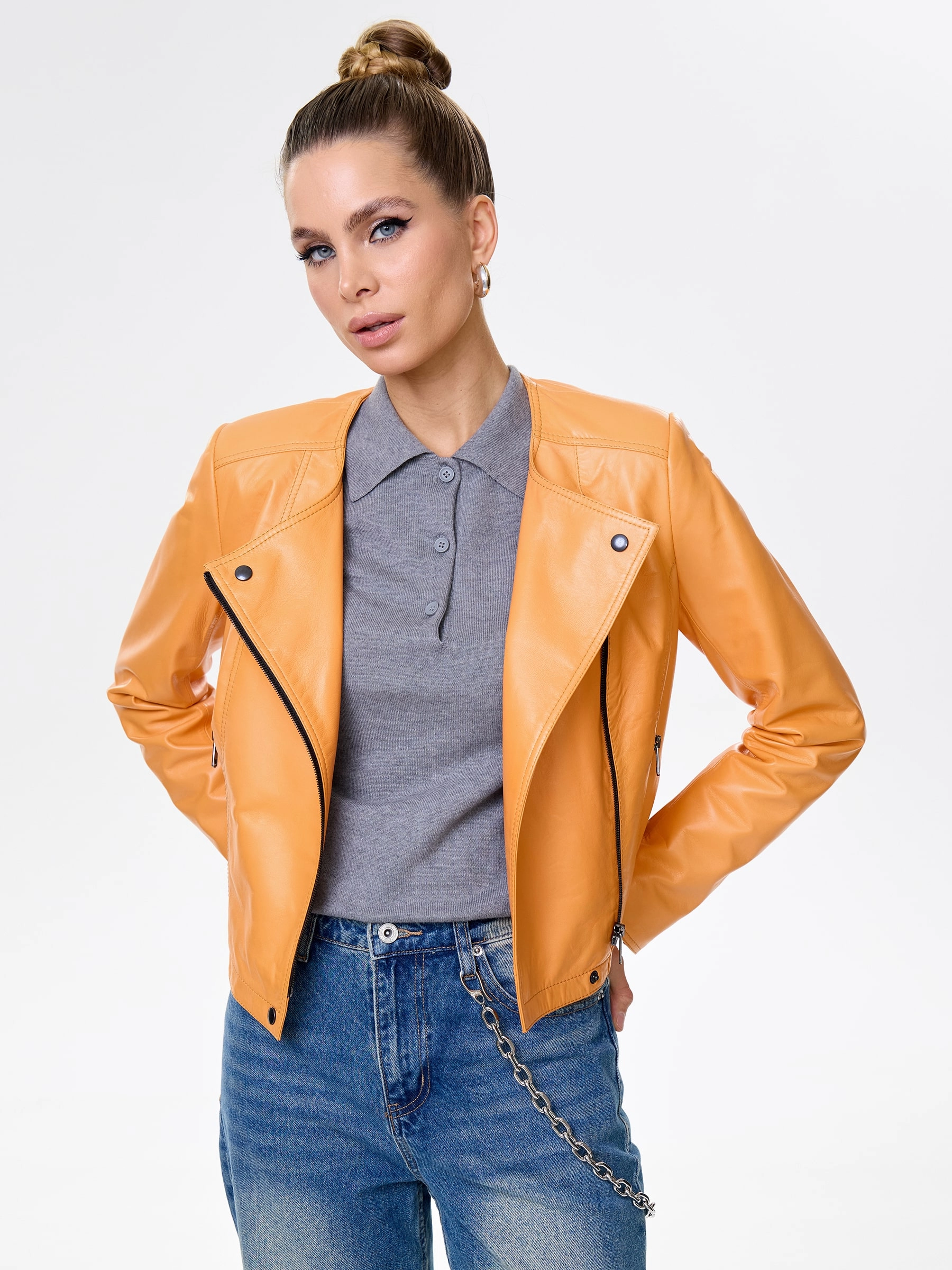 Женская косуха из роскошной натуральной кожи апельсиново-оранжевого оттенка. Полуприлегающий силуэт на молнии без воротника, врезные карманы подчеркивают спортивный шик. Регулируемые боковые паты обеспечивают идеальную посадку, акцентируя фигуру, а втачные рукава гарантируют комфорт. Этот must-have мгновенно заряжает образ энергией — наденьте с базовой белой футболкой, черными скинни и кедами для смелого повседневного стиля или с черным платьем-чехлом и ботфортами для яркого вечернего акцента.