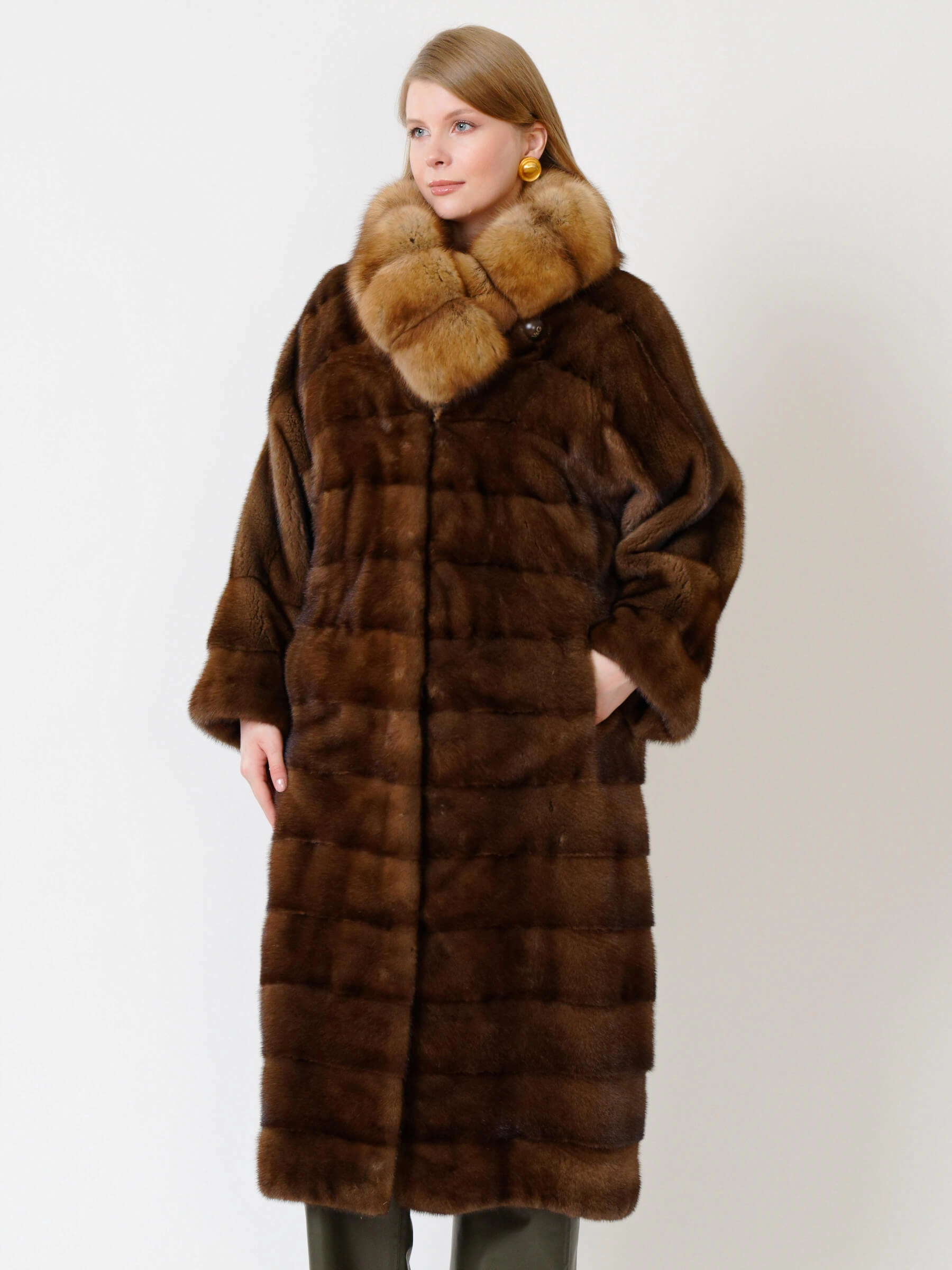 Товар женская норковая шуба с воротником меха соболя 1150(вс), пастельная, размер 44, артикул 33400 выполнен из норка крашенной с застежкой клипсы. Рассчитан на сезон: осень-зима. Длина изделия свыше 90 см, силуэт прямой.