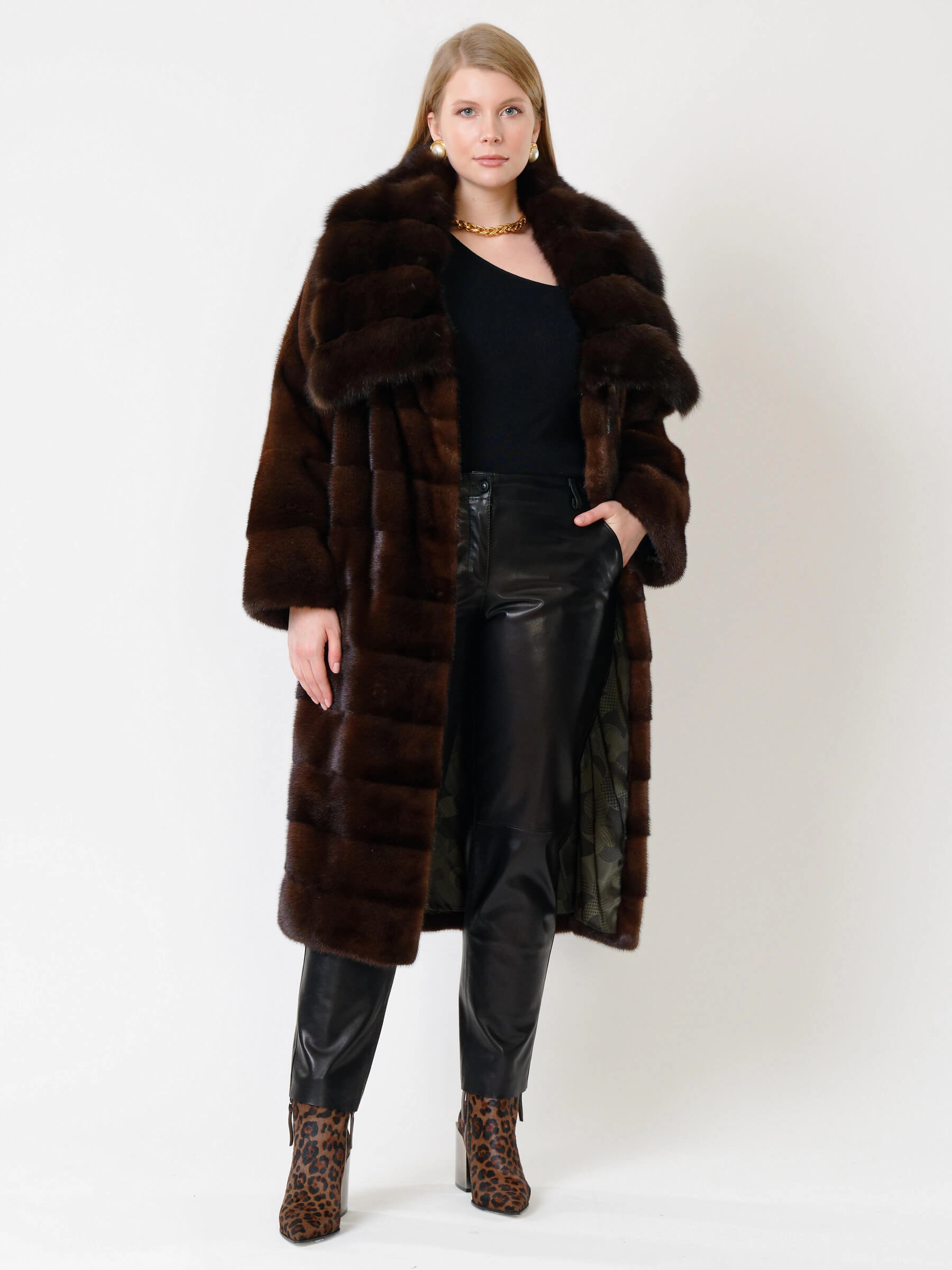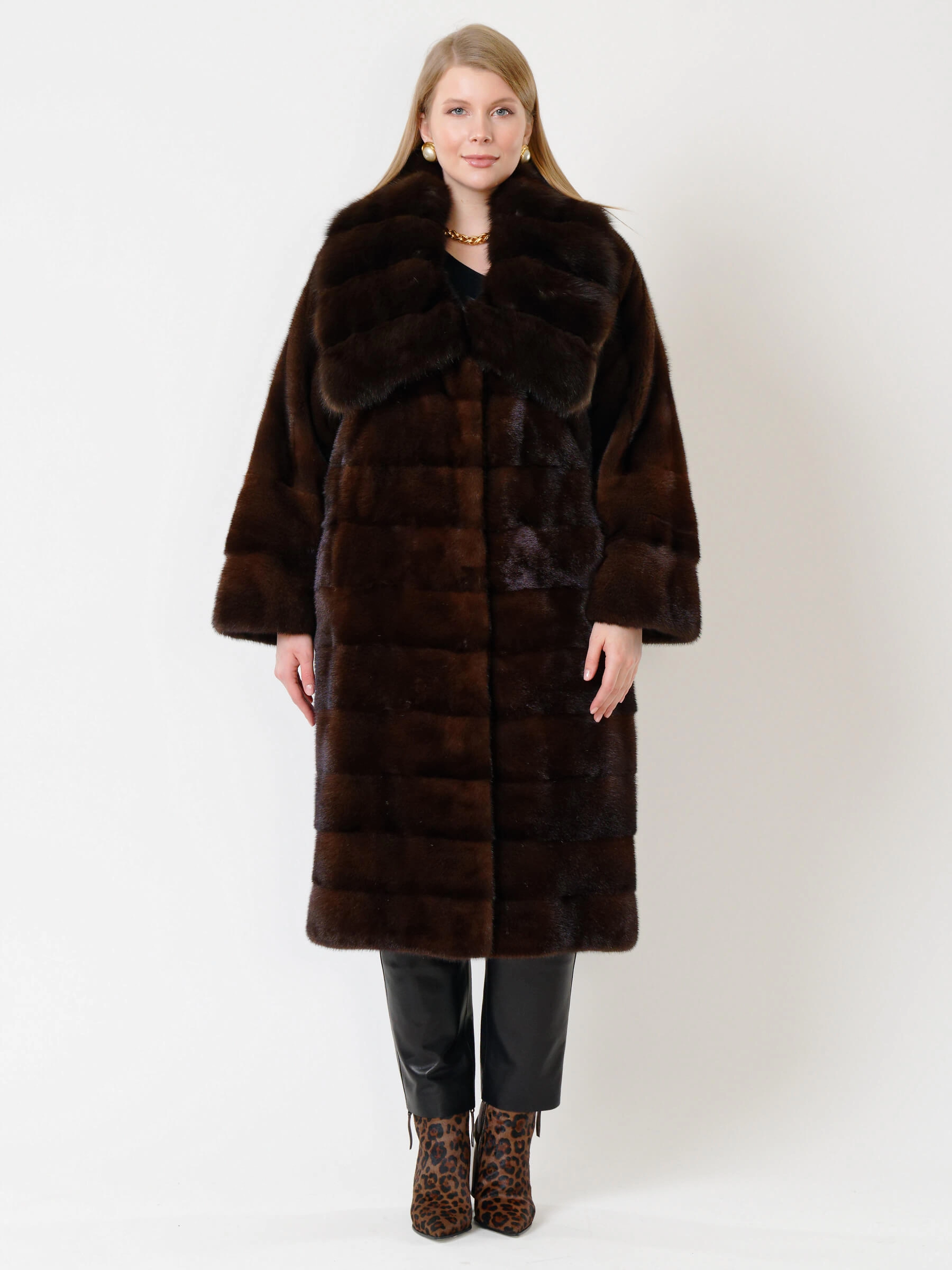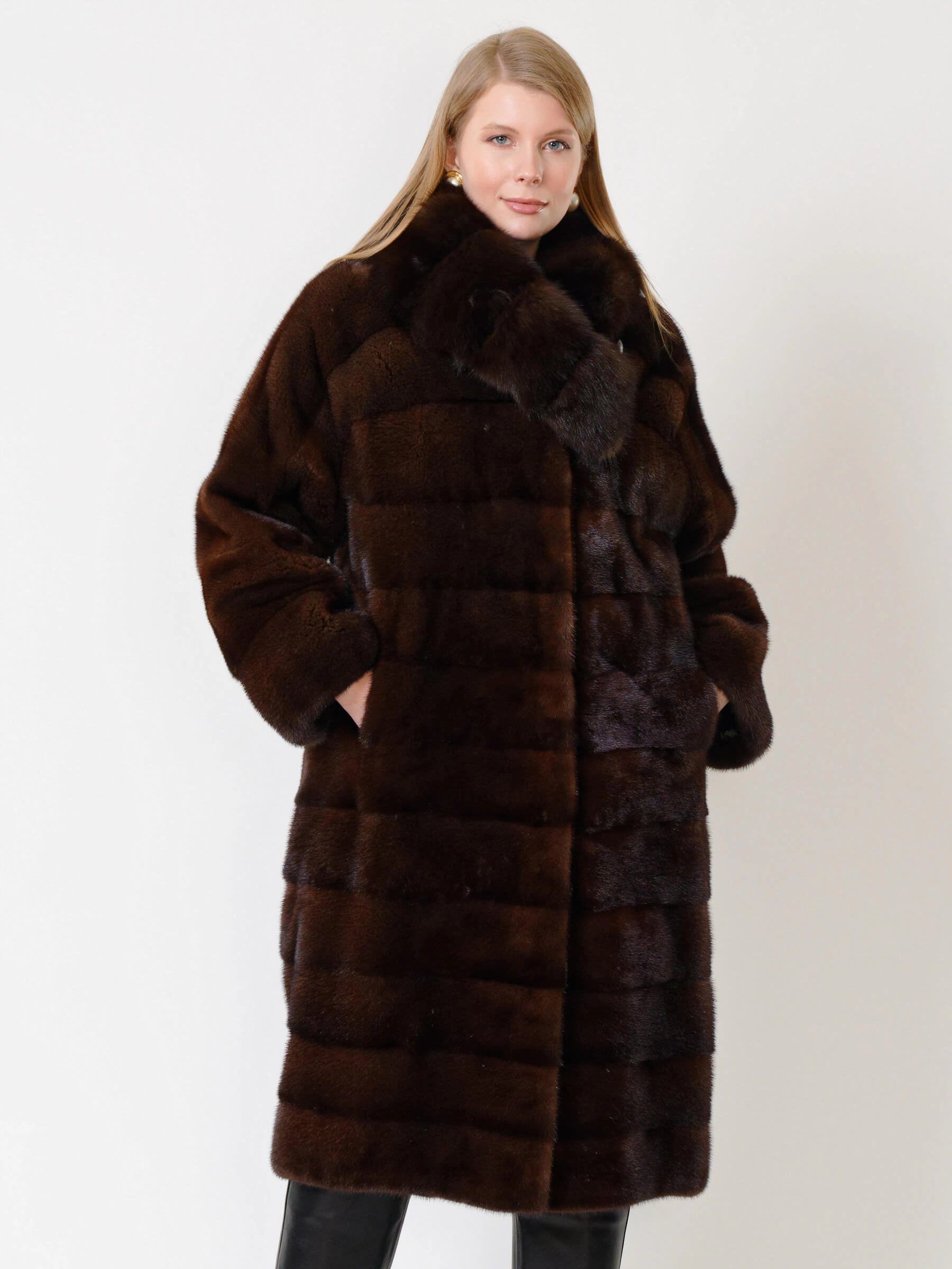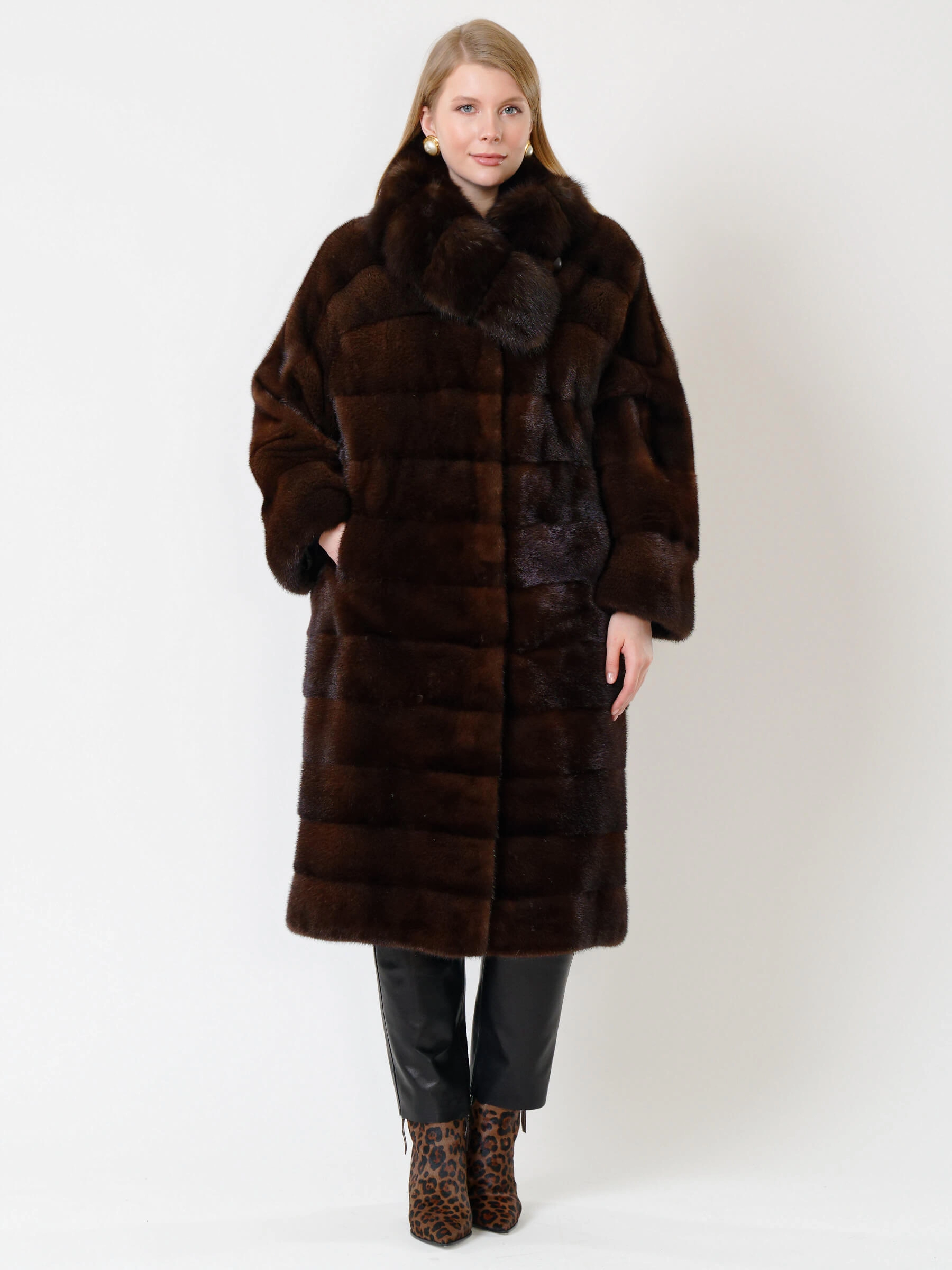 Роскошная шуба из крашеной норки с поперечной раскладкой меха: прямой силуэт длиной свыше 105 см с шалевым воротником-трансформером из соболя и двумя боковыми карманами. Густой мех с короткой остью и застёжка на клипсах обеспечивают элегантность и тепло. Сочетайте её с кожаными брюками и сапогами для дерзкого образа или с вечерним платьем для выхода в свет.
