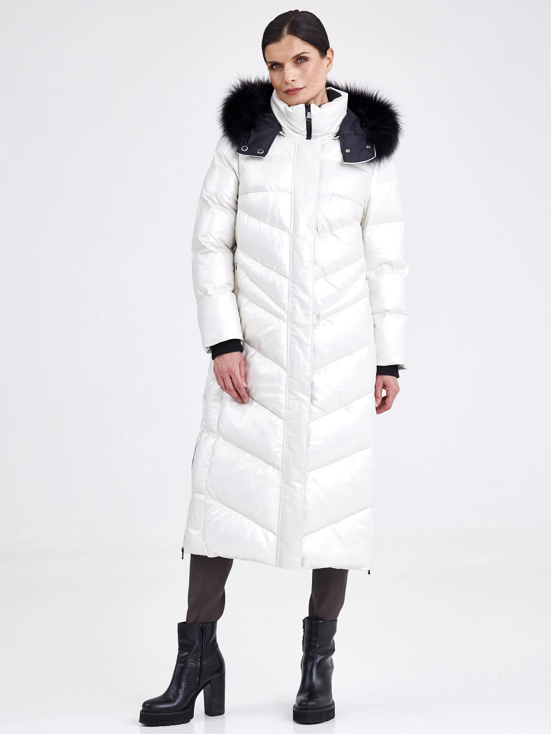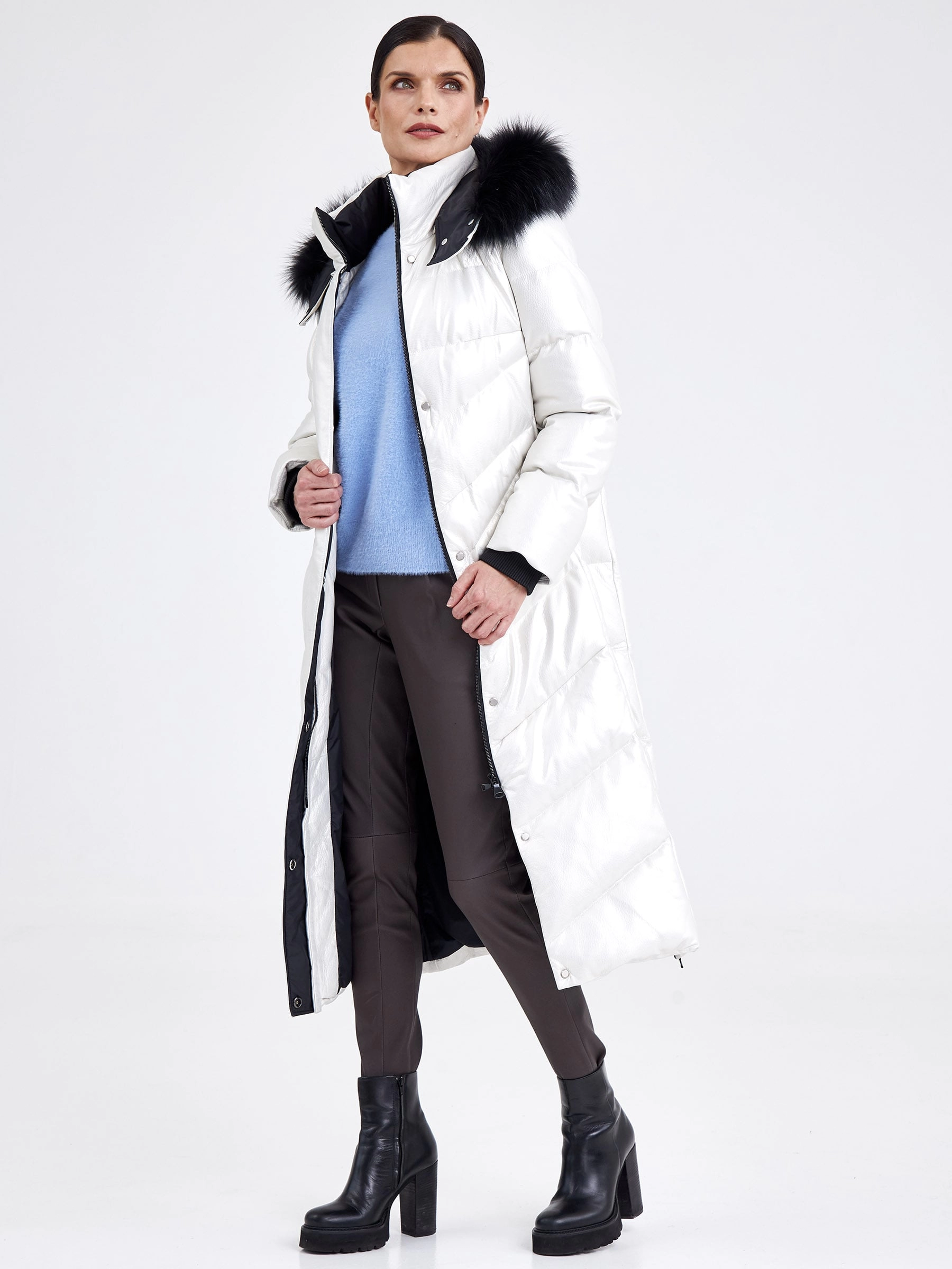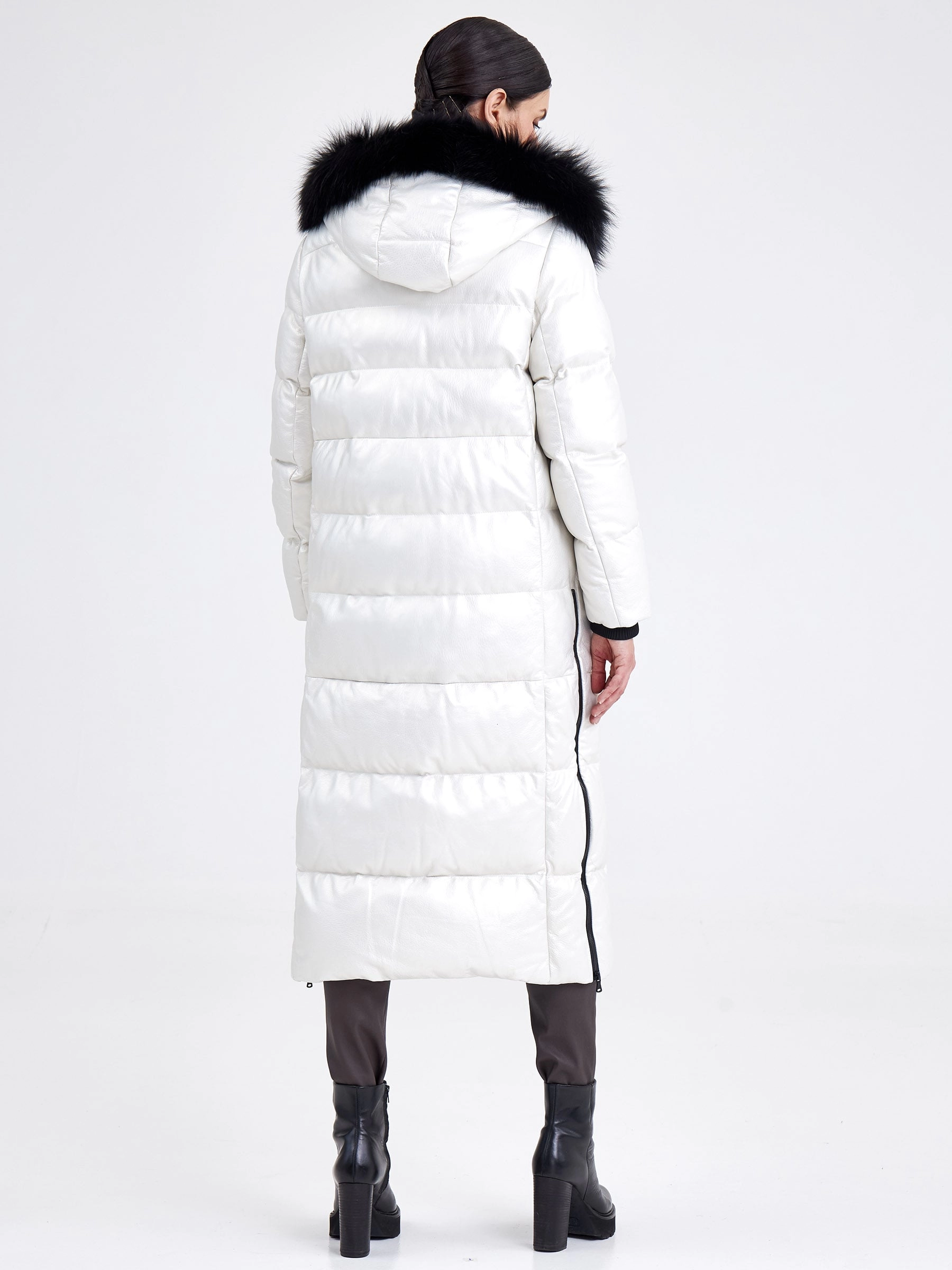 Белоснежное пальто-пуховик длиной более 90 см, сшитое из зернистой кожи с мягким перламутровым блеском, создаёт образ зимней сказки — словно искрящийся на солнце снег. Модель прямого кроя подчеркивает элегантность силуэта, а её функциональность продумана до мелочей: надёжная застёжка-молния, практичные боковые разрезы на молниях для удобства движения и, конечно, роскошный глубокий капюшон, декорированный пушистым натуральным мехом песца. Внутреннее наполнение обеспечивает идеальный микроклимат: подкладка из 100% полиэстера приятна к телу, а высокоэффективный утеплитель — немецкий синтепон Freudenberg — гарантирует тепло, воздухопроницаемость и лёгкость даже в морозные дни. Совет стилиста: Это пальто самодостаточно, поэтому выбирайте лаконичные сочетания. Носите его с монохромной базой глубоких тонов — тёмно-синими, графитовыми или чёрными брюками, платьем-футляром или водолазкой и джинсами скинни. Высокие сапоги-ботфорты или лаконичные ботильоны на каблуке завершат образ. Мех на капюшоне — уже яркий акцент, о