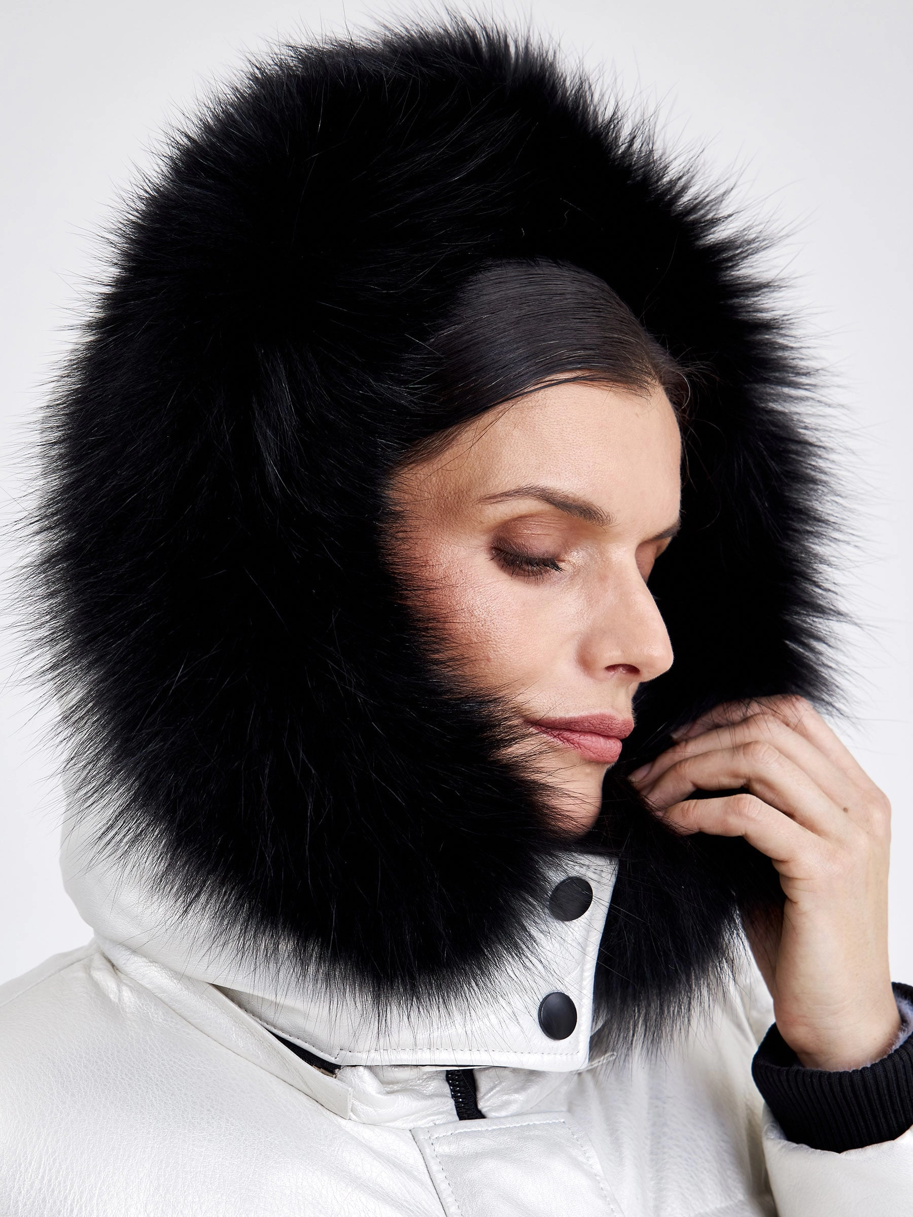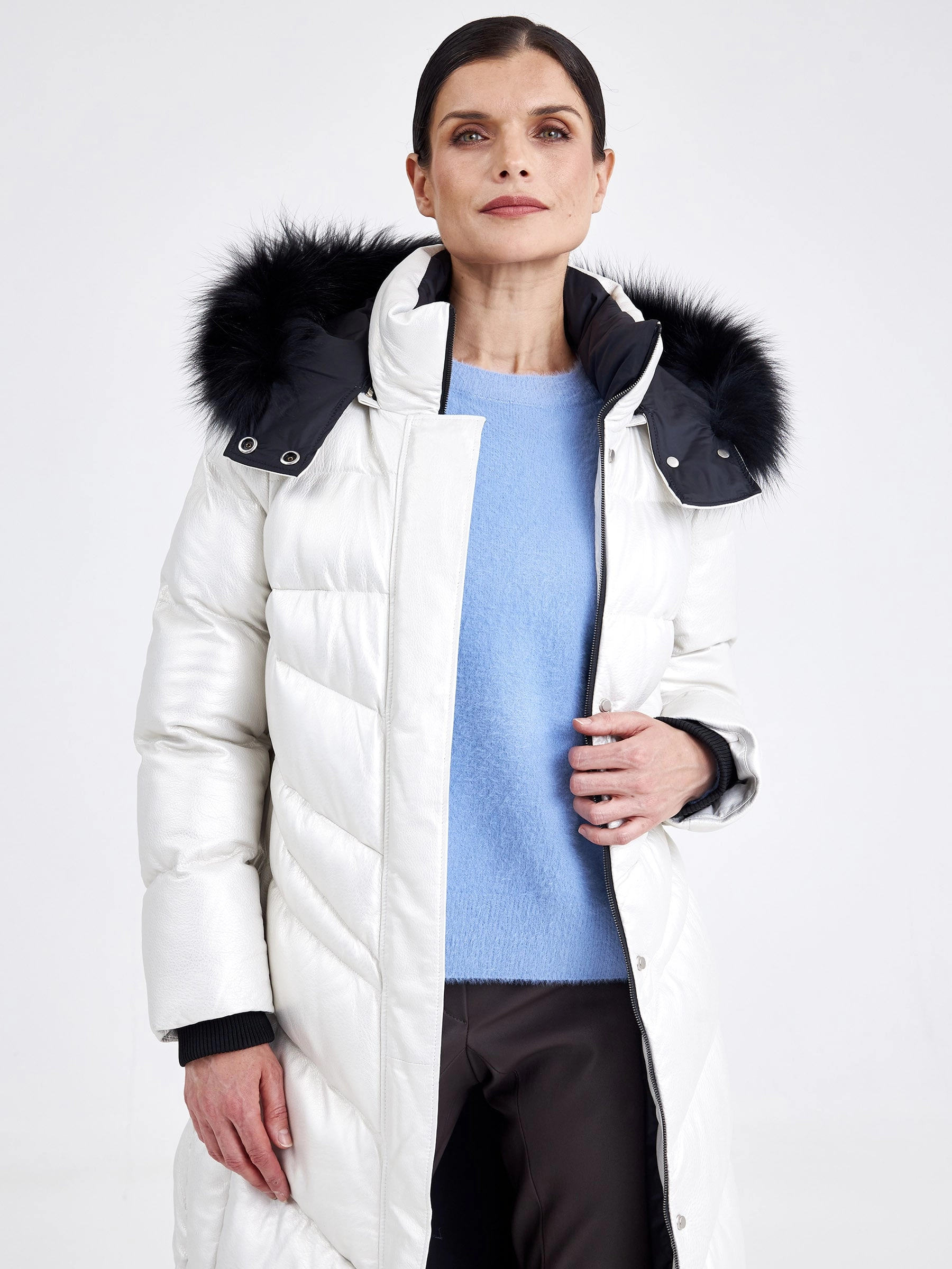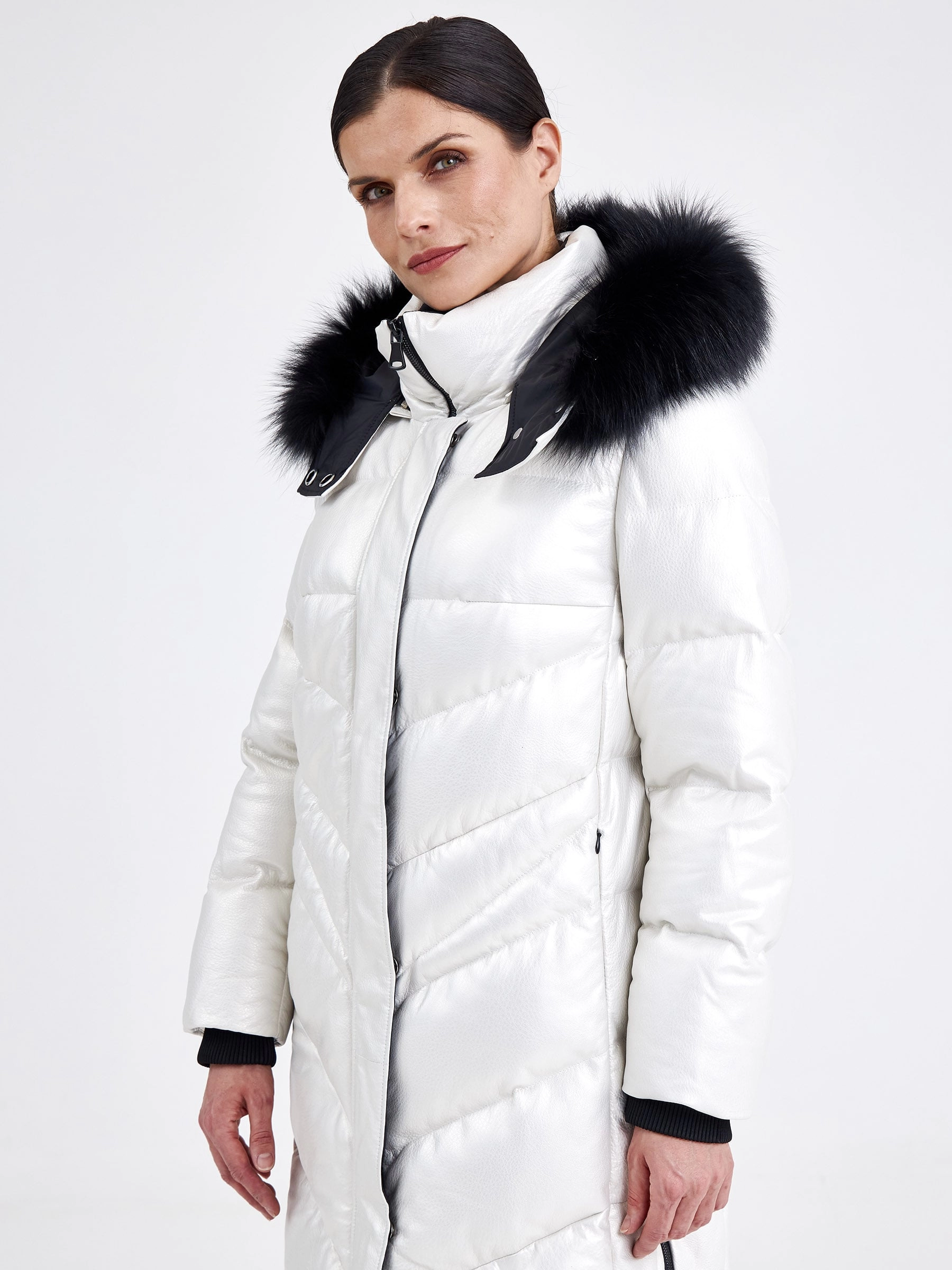 Белоснежное пальто-пуховик длиной более 90 см, сшитое из зернистой кожи с мягким перламутровым блеском, создаёт образ зимней сказки — словно искрящийся на солнце снег. Модель прямого кроя подчеркивает элегантность силуэта, а её функциональность продумана до мелочей: надёжная застёжка-молния, практичные боковые разрезы на молниях для удобства движения и, конечно, роскошный глубокий капюшон, декорированный пушистым натуральным мехом песца. Внутреннее наполнение обеспечивает идеальный микроклимат: подкладка из 100% полиэстера приятна к телу, а высокоэффективный утеплитель — немецкий синтепон Freudenberg — гарантирует тепло, воздухопроницаемость и лёгкость даже в морозные дни. Совет стилиста: Это пальто самодостаточно, поэтому выбирайте лаконичные сочетания. Носите его с монохромной базой глубоких тонов — тёмно-синими, графитовыми или чёрными брюками, платьем-футляром или водолазкой и джинсами скинни. Высокие сапоги-ботфорты или лаконичные ботильоны на каблуке завершат образ. Мех на капюшоне — уже яркий акцент, о