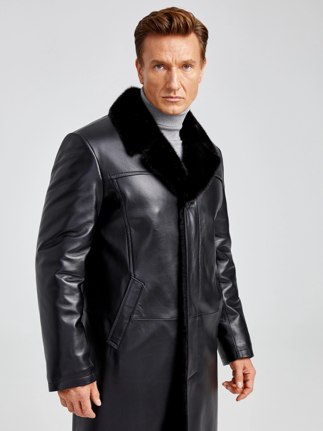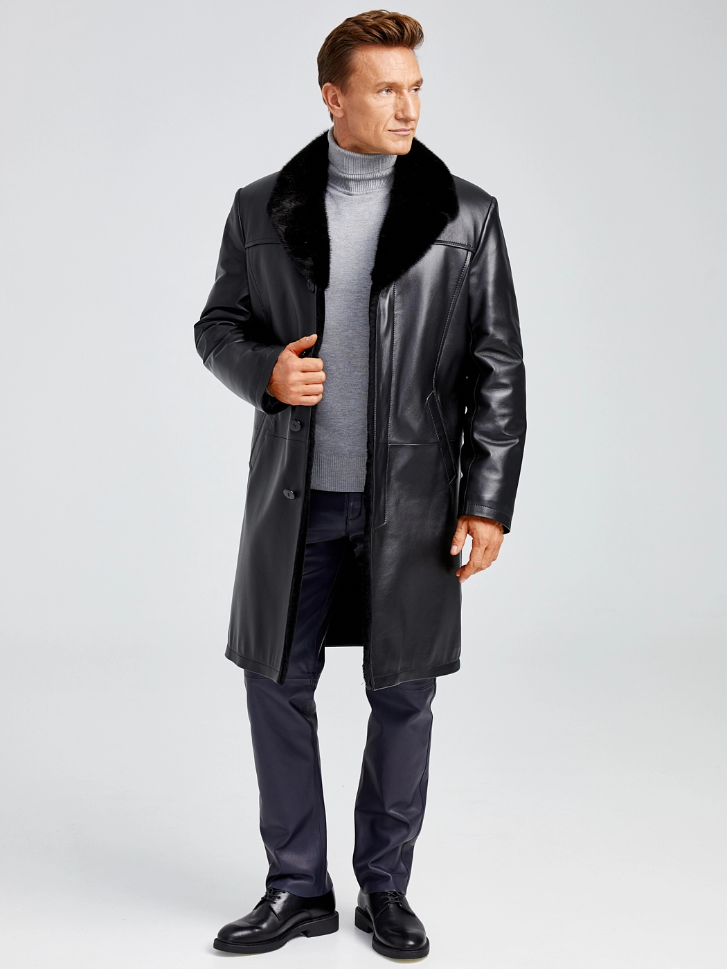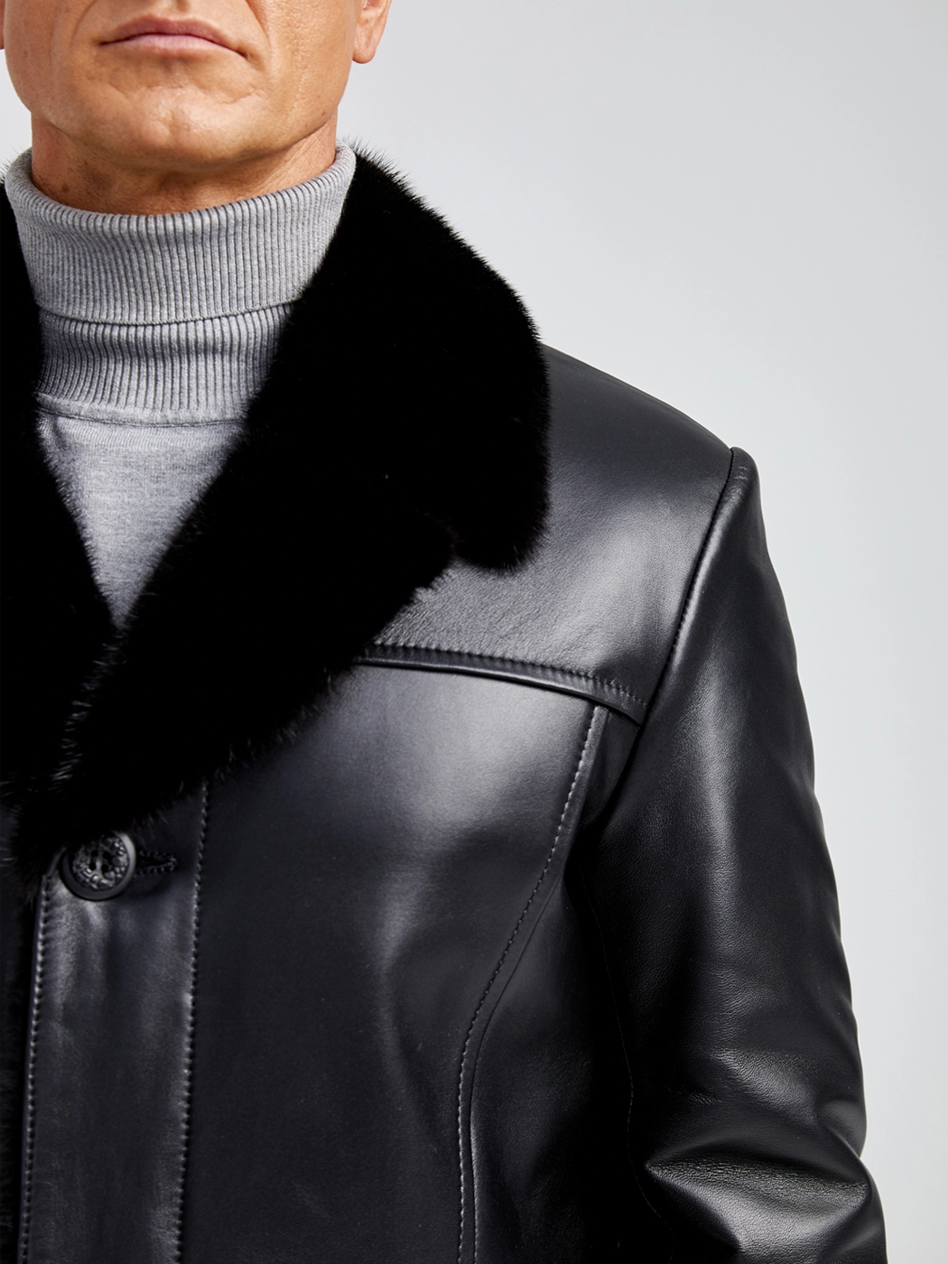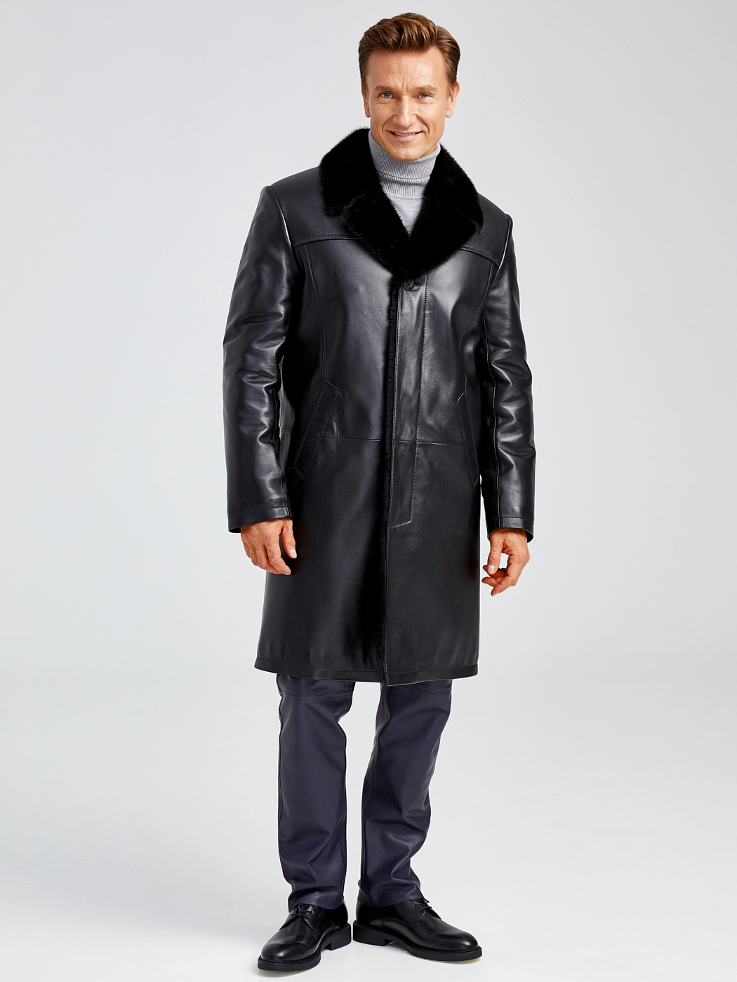 Товар кожаная мужская дубленка с воротником меха норки премиум класса 533мех, черная, размер 50, артикул 40431 выполнен из натуральной кожи с застежкой пуговицы. Рассчитан на сезон: осень-зима. Длина изделия 104 см, силуэт прямой.