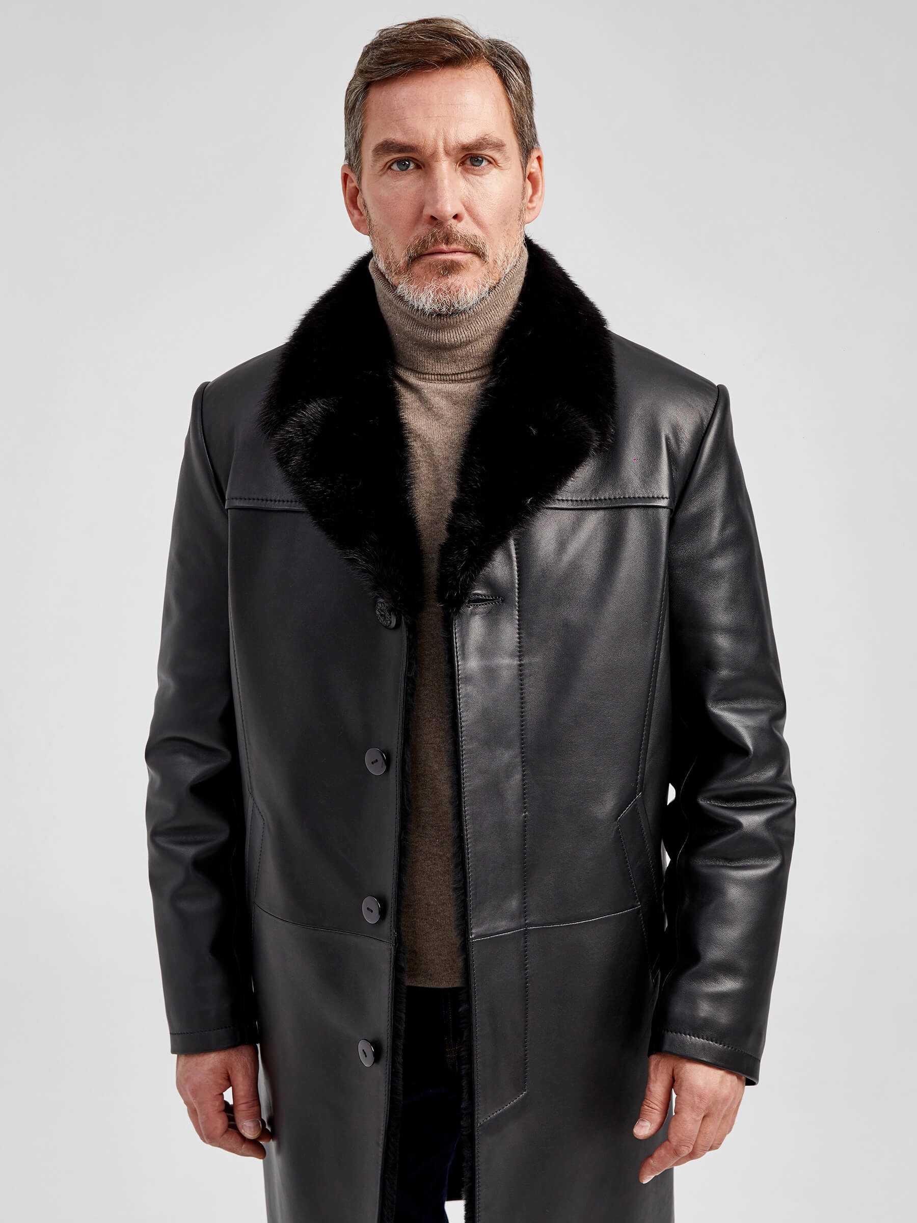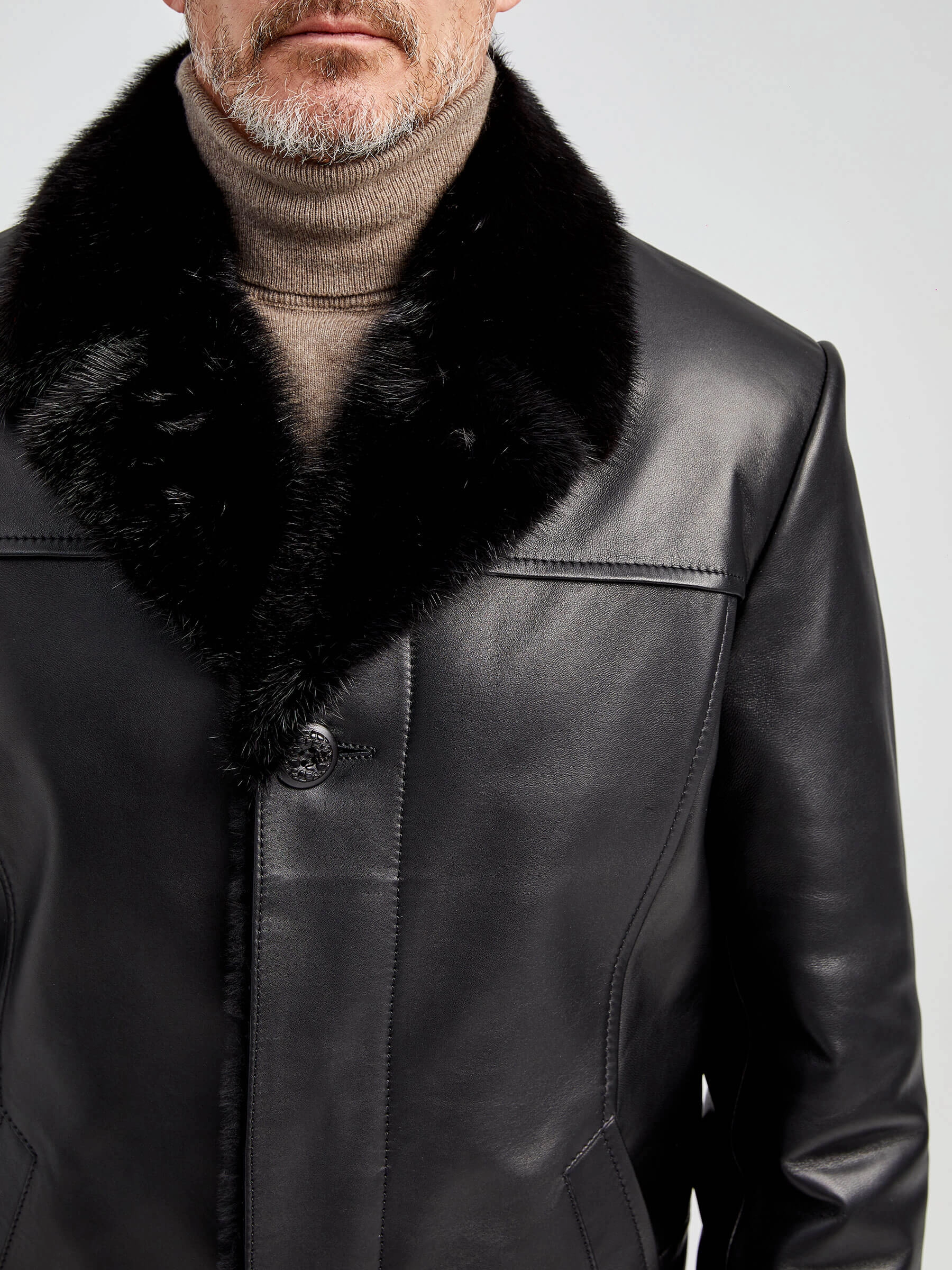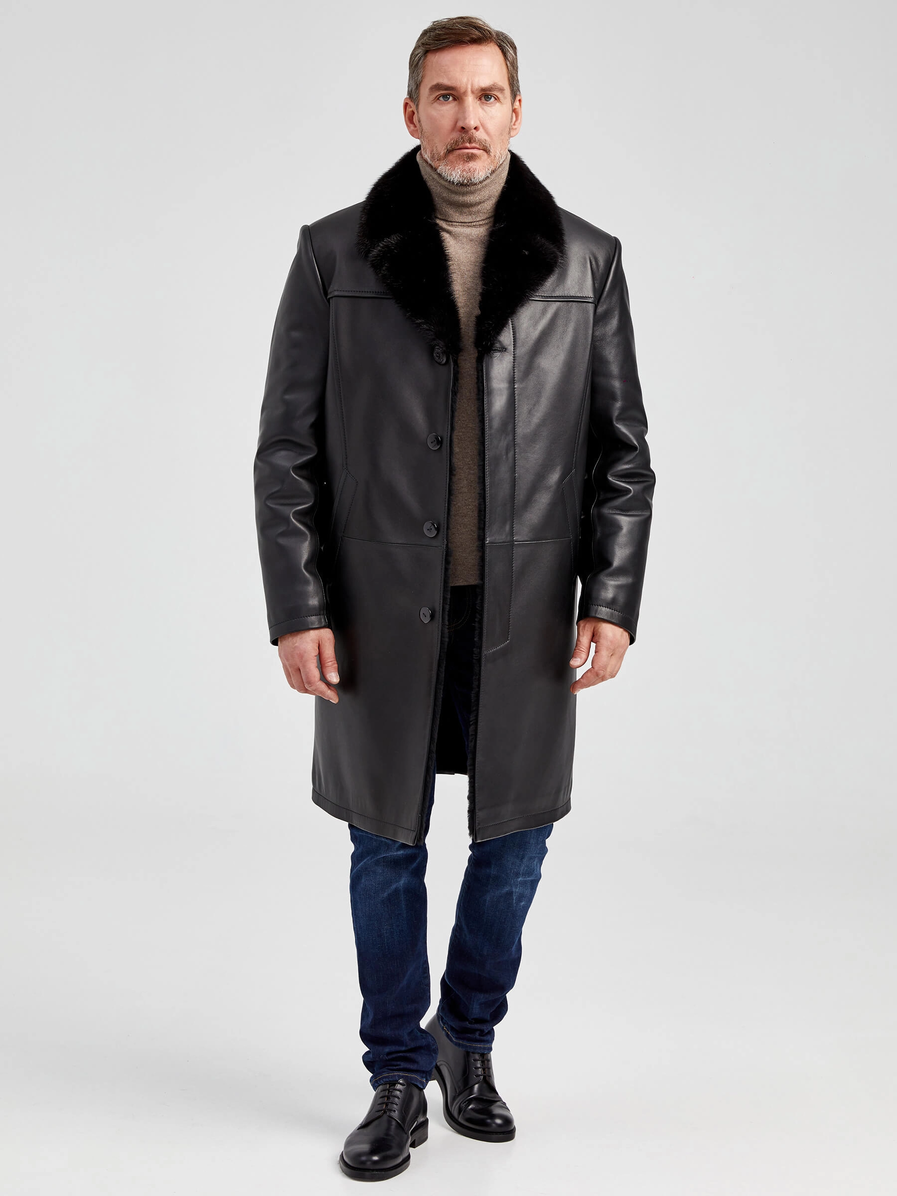 Товар кожаная мужская дубленка с воротником меха норки премиум класса 533мех, черная, размер 50, артикул 40562 выполнен из натуральной кожи с застежкой пуговицы. Рассчитан на сезон: осень-зима. Длина изделия 104 см, силуэт прямой.