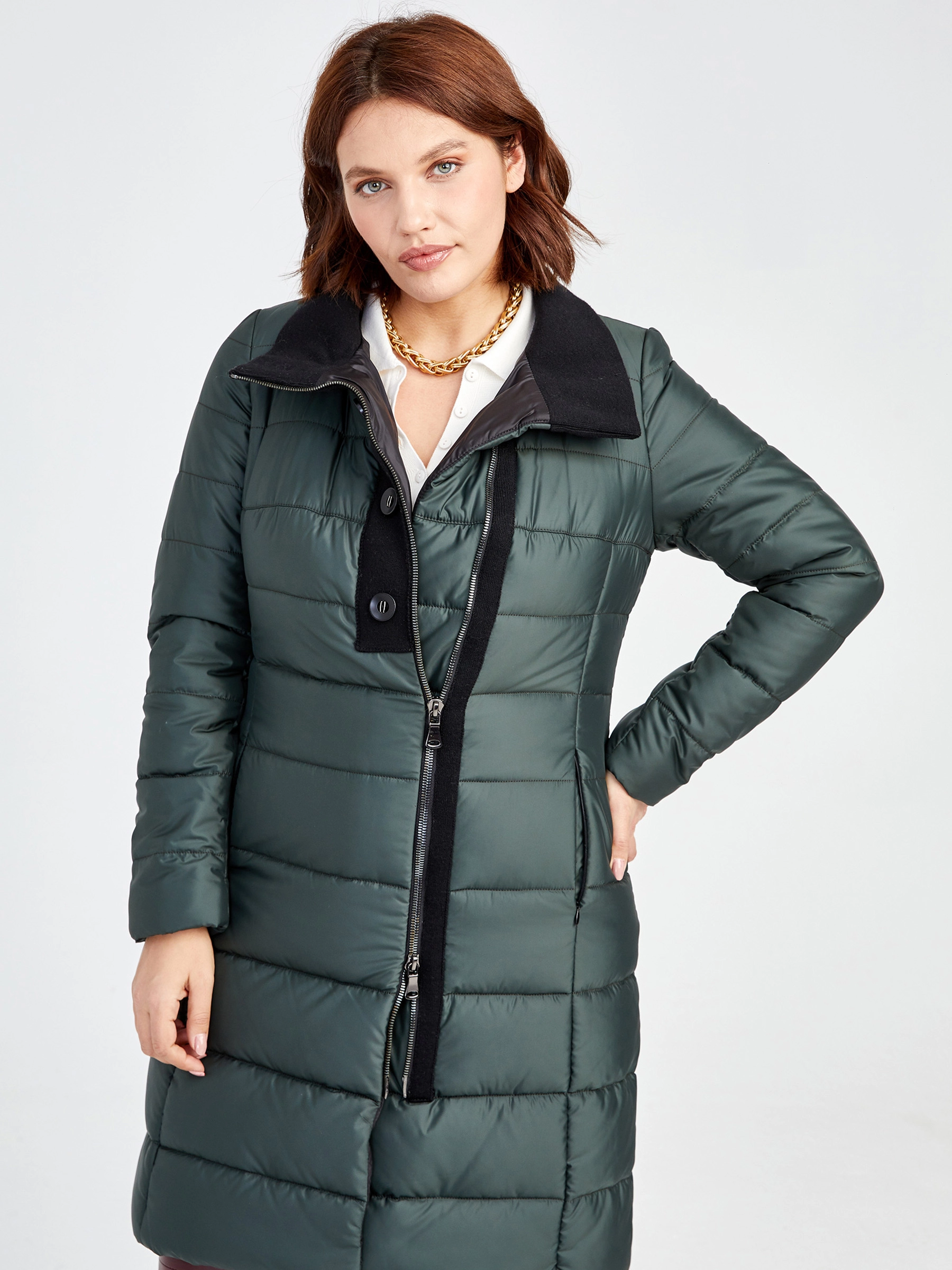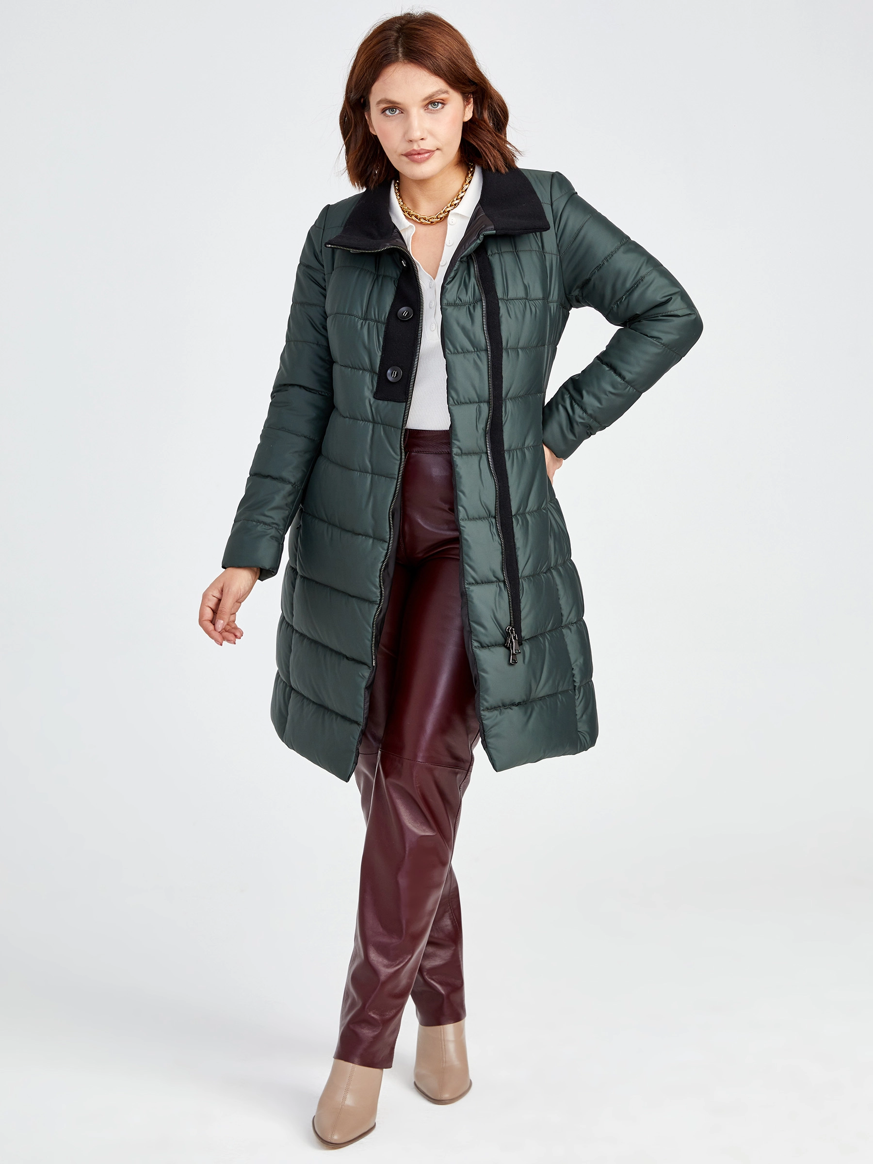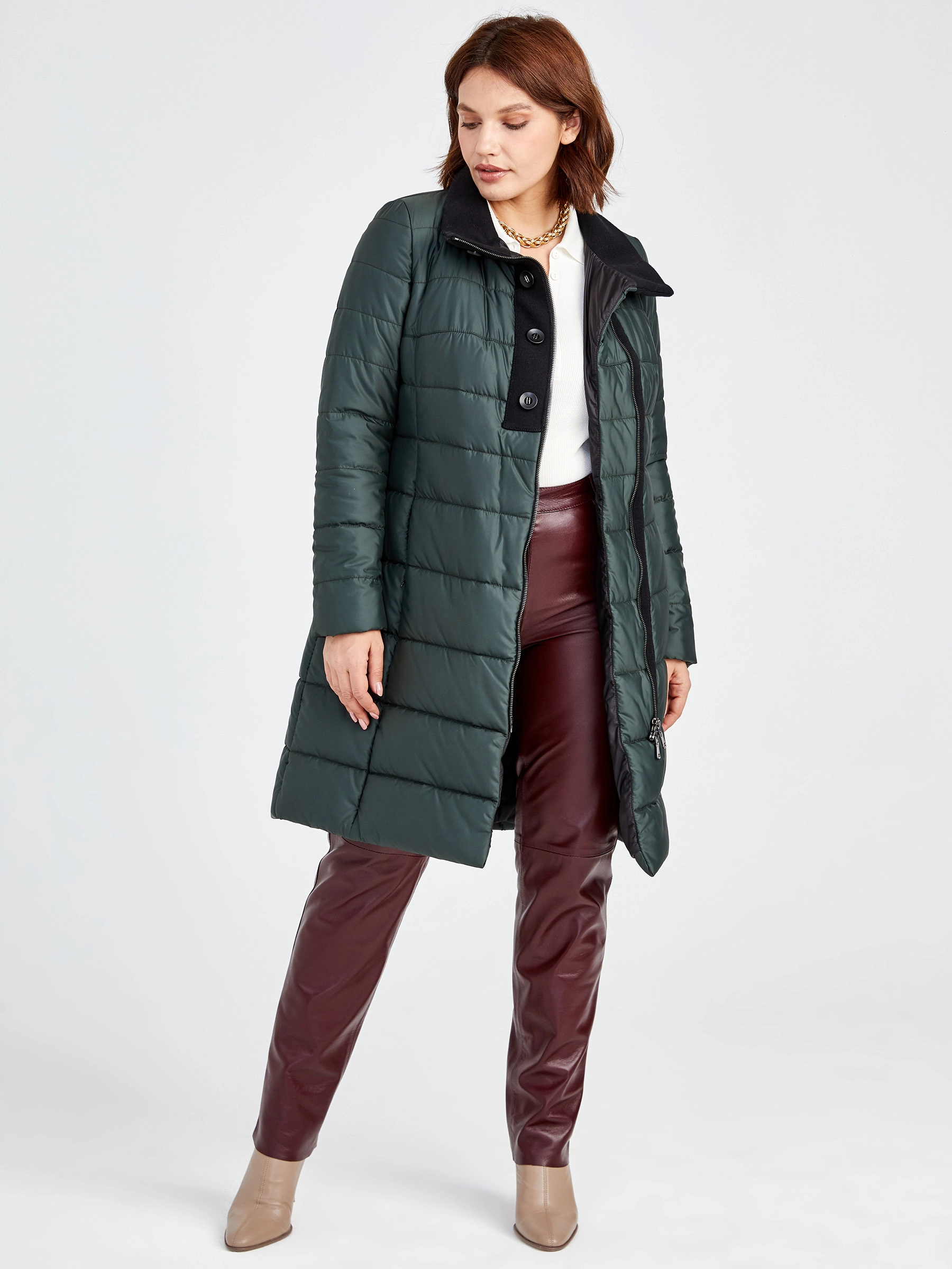 Элегантный текстильный двусторонний пуховик на молнии с полуприлегающим силуэтом и удлинённым кроем до 90 см. Модель с воротником-стойкой и трикотажными манжетами сочетает лёгкость, комфорт и подчёркивает женственность. Совет стилиста: носите с узкими джинсами, объёмным свитером и ботильонами для повседневного образа или со спортивными брюками и кроссовками для прогулочного стиля.
