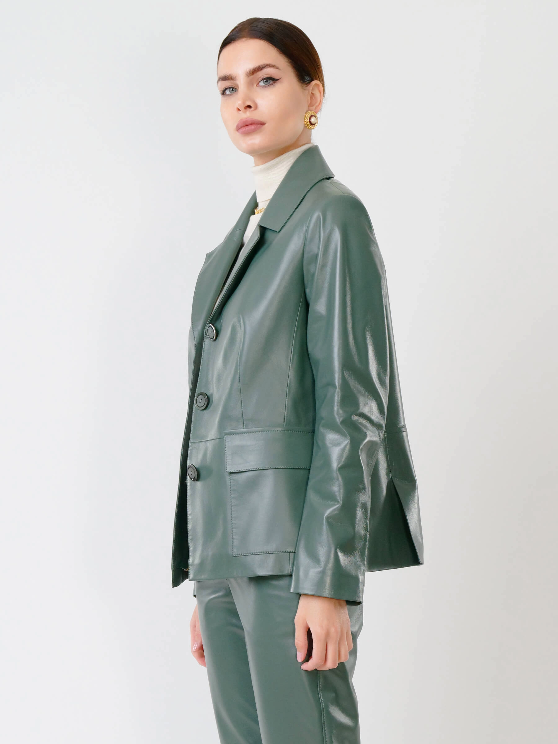 Элегантный женский пиджак из натуральной кожи на пуговицах оливкового цвета — это современная интерпретация классического силуэта. Модель полуприлегающего кроя длиной 63 см с втачным рукавом и острым английским воротником подчеркивает строгость и стиль. Мягкая кожа премиум-класса, накладные карманы и боковые шлицы обеспечивают безупречную посадку и утонченный вид. Этот кожаный пиджак — дерзкий акцент для создания контрастных образов: носите его с прямыми джинсами и кроссовками для повседневного лука или набросьте на офисное платье для уверенности в деловой среде.