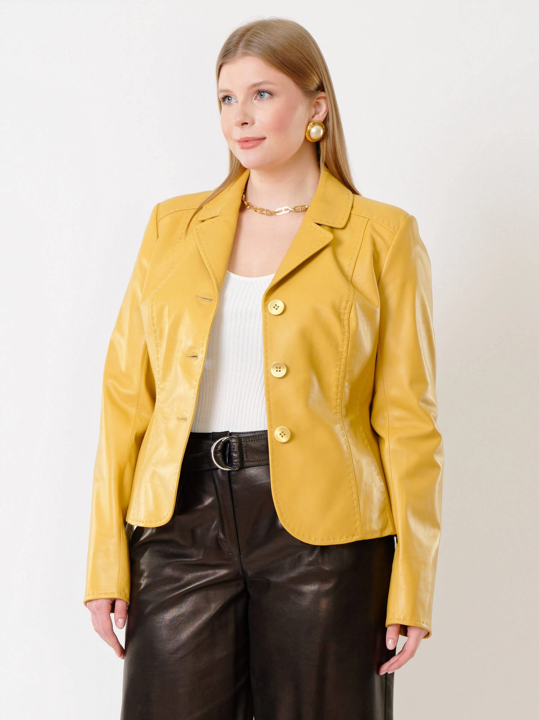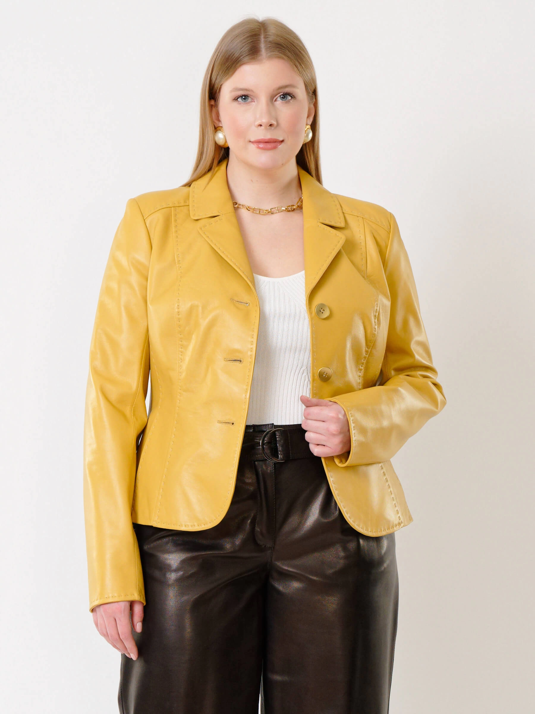 Товар кожаный женский пиджак 316рс, желтый, размер 44, артикул 91232 выполнен из натуральной кожи с застежкой пуговицы. Рассчитан на сезон: весна-лето. Длина изделия 60 см, силуэт приталенный .