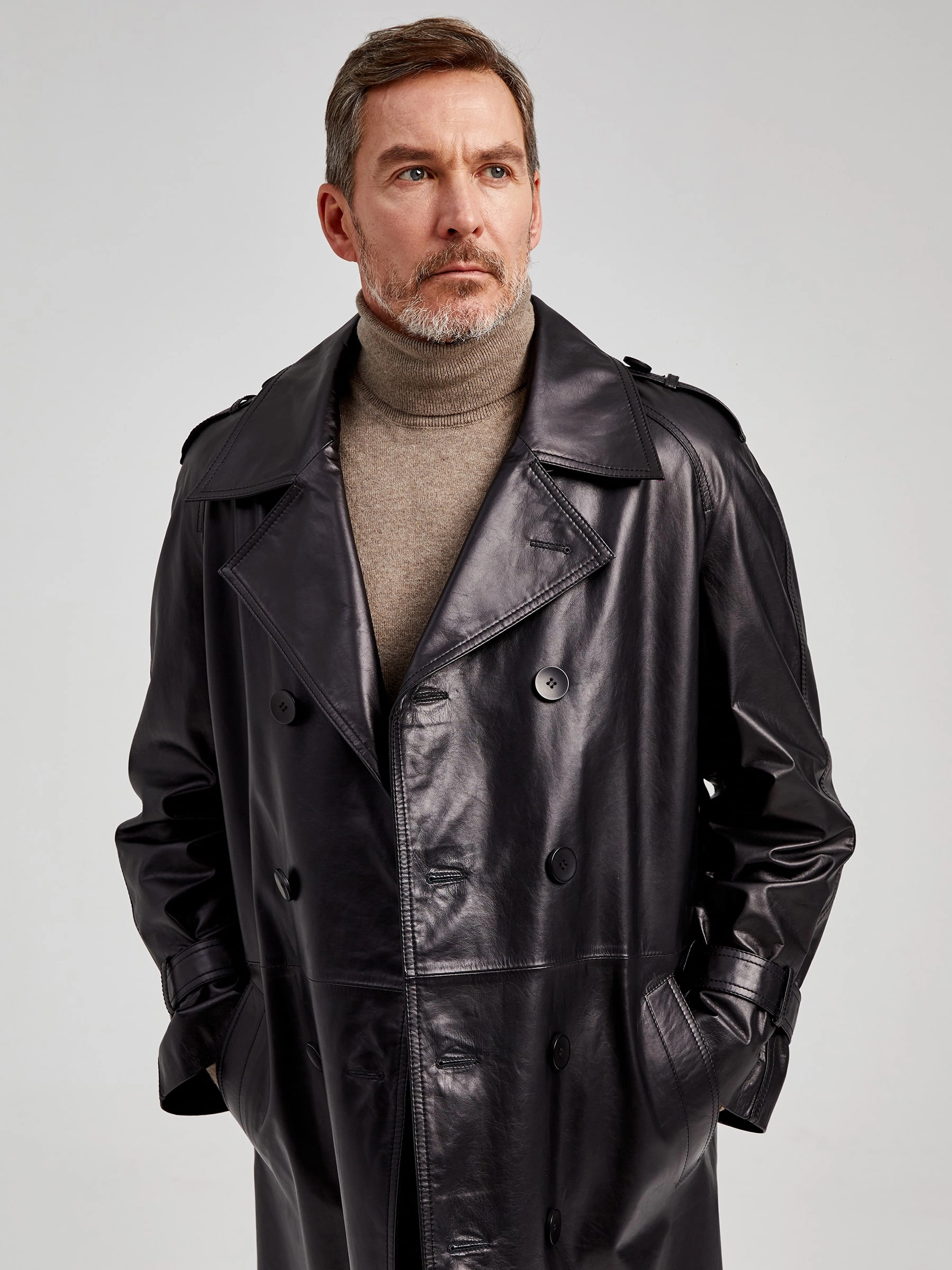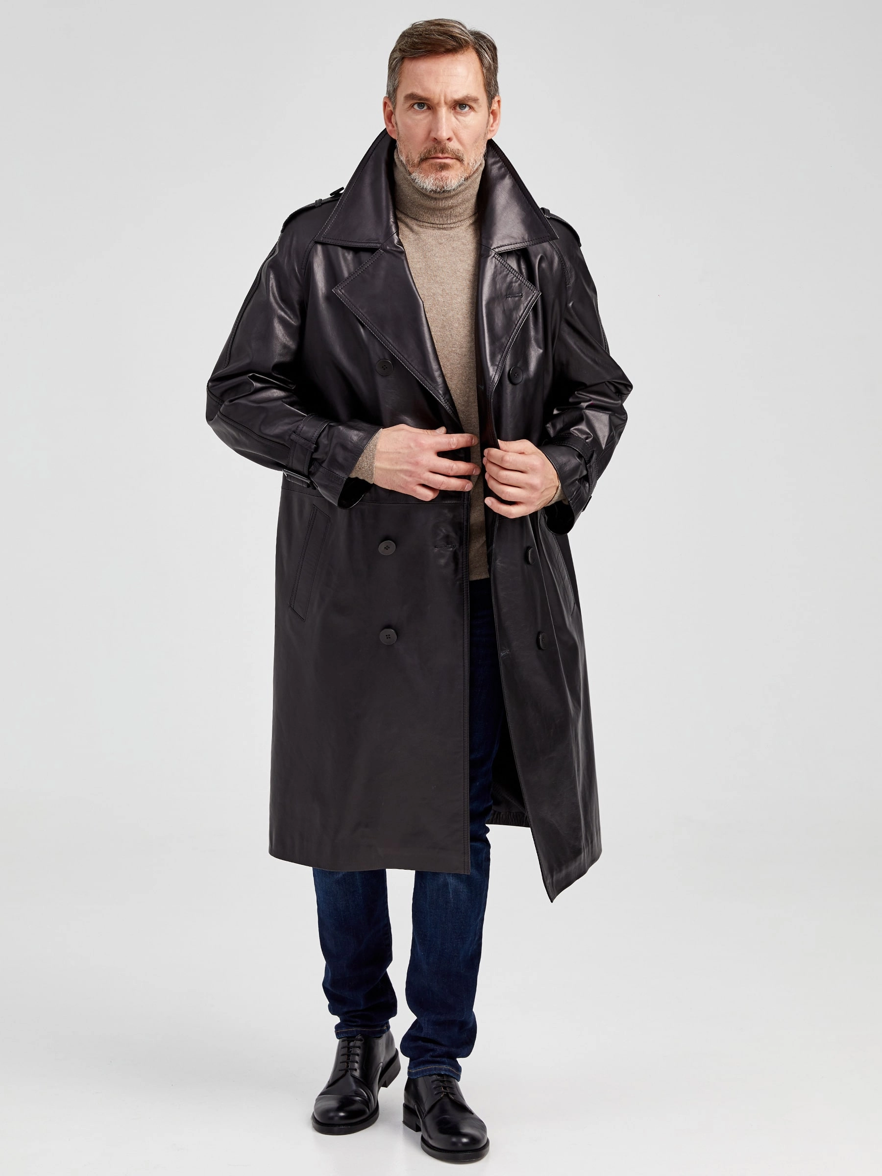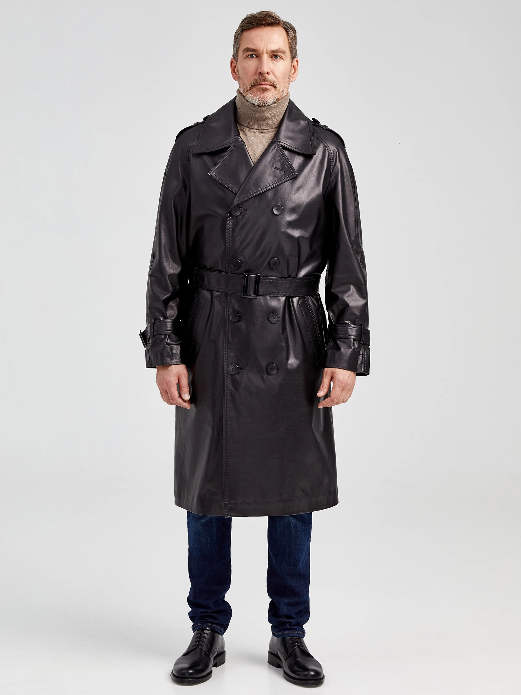 Мужской двубортный кожаный плащ премиум класса 553, черный, размер 52, артикул 40541