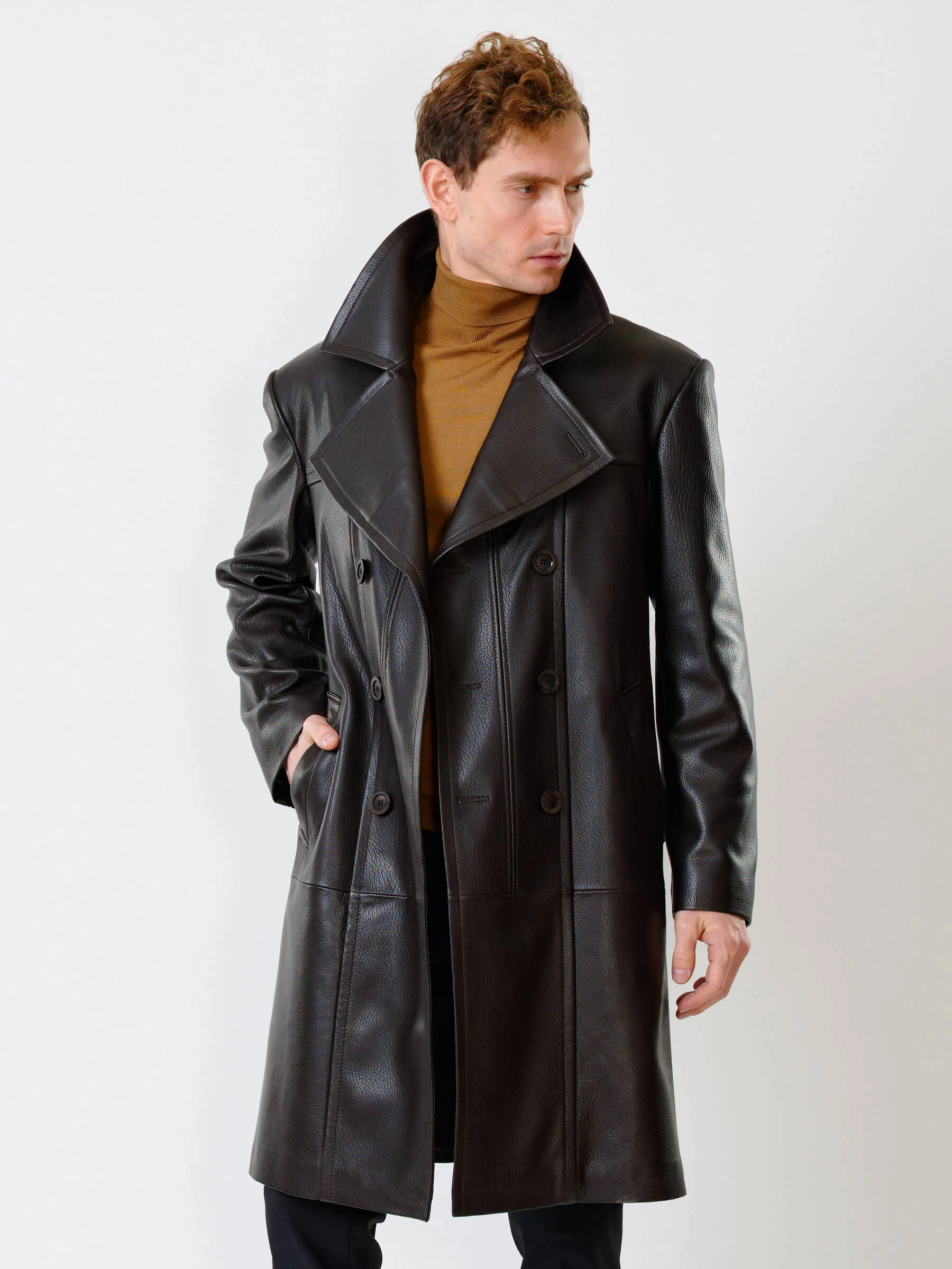 Товар двубортный мужской кожаный плащ премиум класса чикаго, коричневый, размер 46, артикул 28500 выполнен из натуральной кожи с застежкой пуговицы. Рассчитан на сезон: демисезон. Длина изделия 110 см, силуэт полуприлегающий.